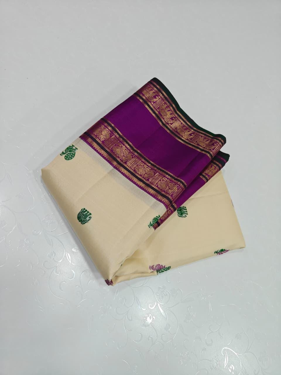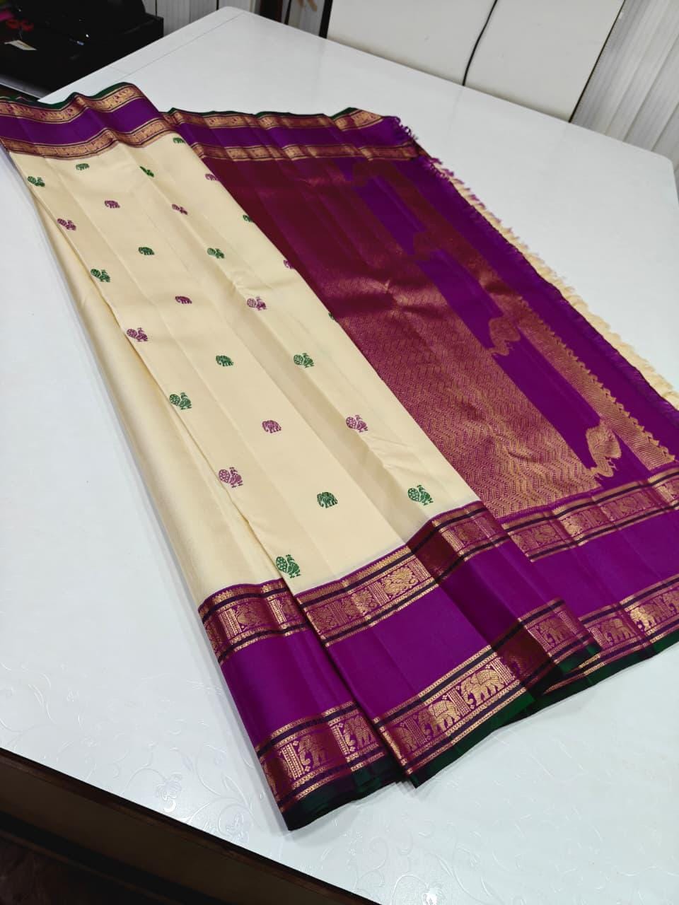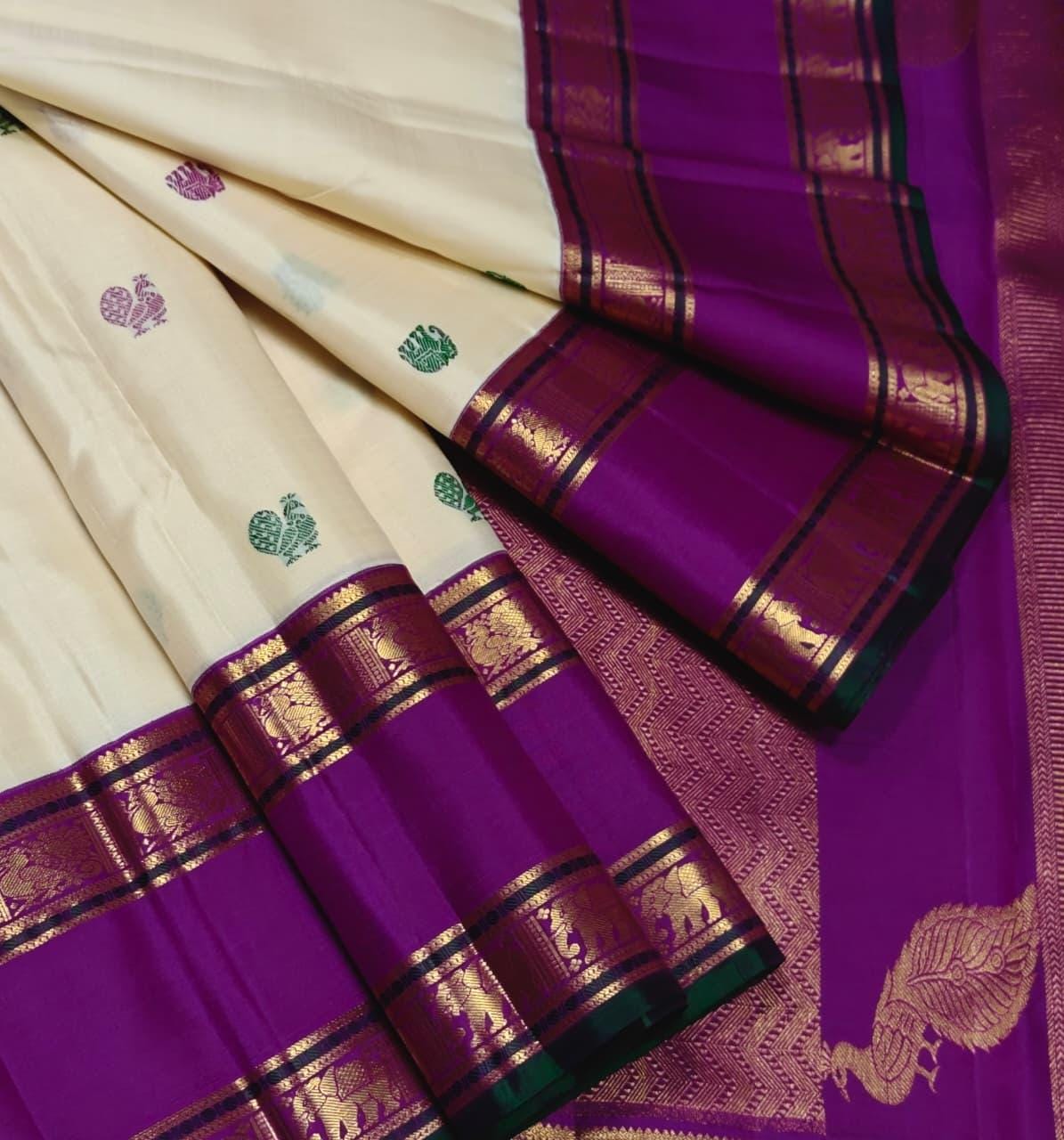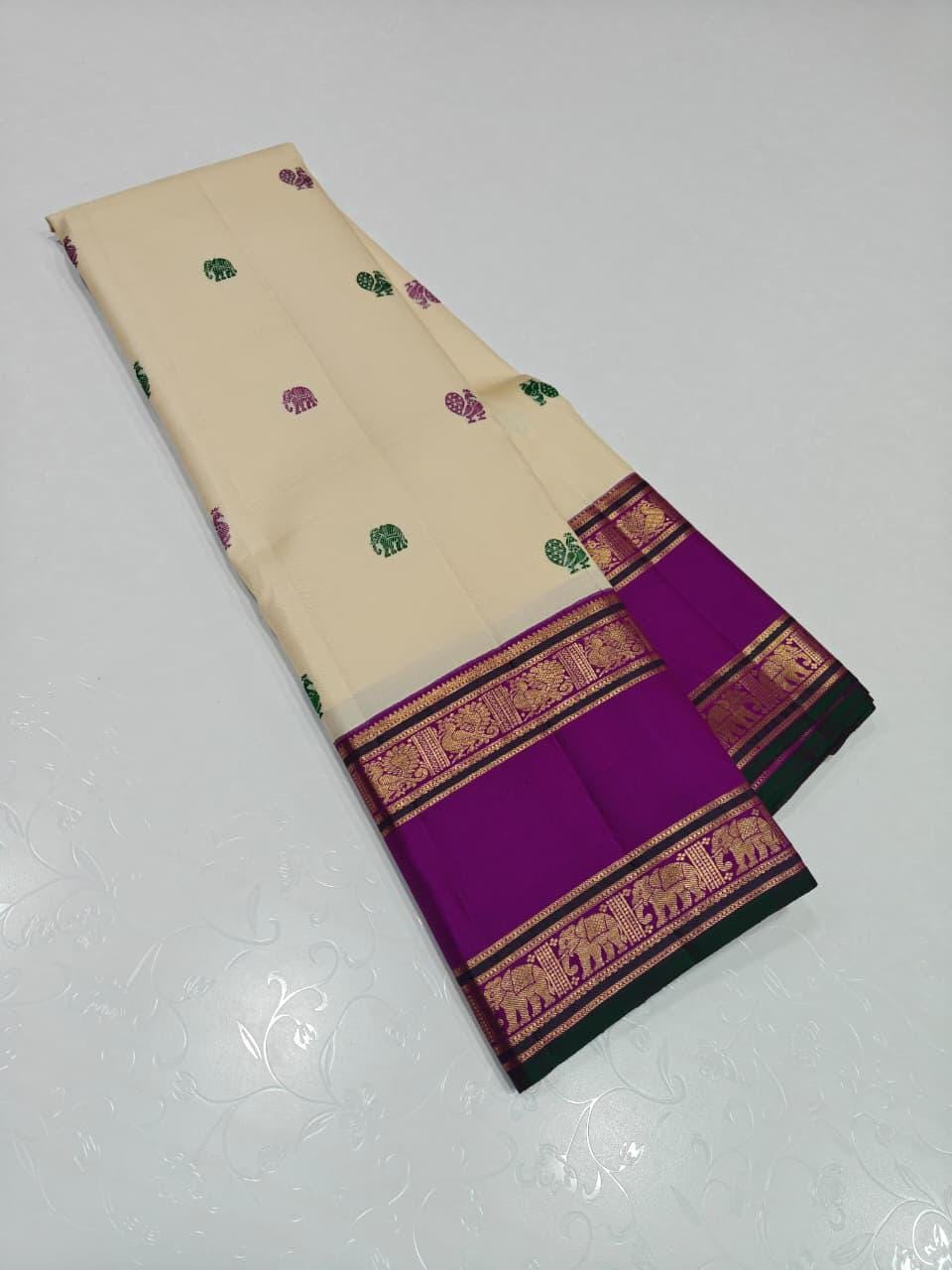 • Exclusive Korvai Weaving: An intricate, labor-intensive technique where the heavy contrast borders are woven separately and manually interlocked with the main body, ensuring flawless color separation.