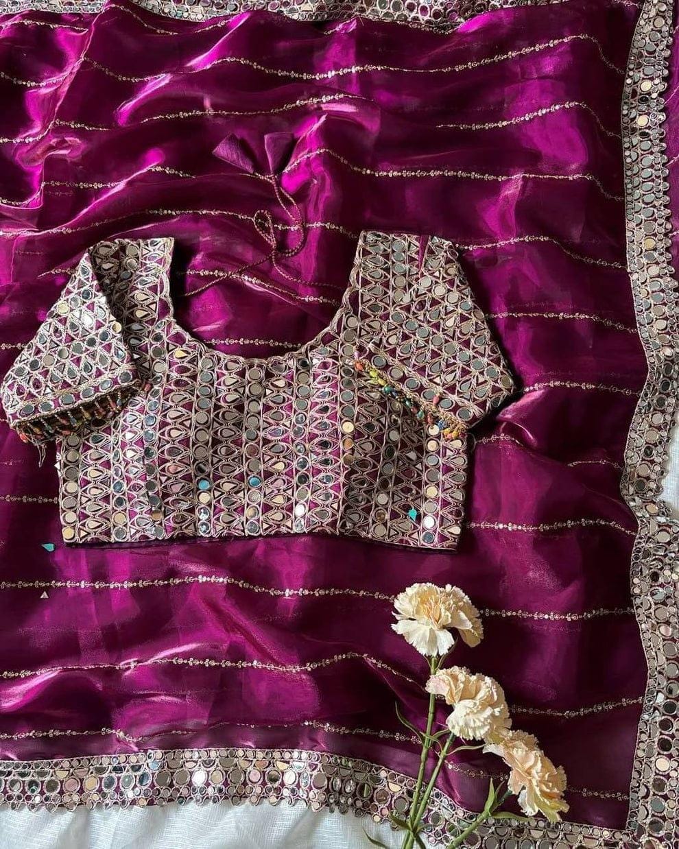 Experience the luxury of Jimmy Choo with real mirror work, adorned with exquisite hand sequin work. This saree is a perfect fusion of heritage and contemporary elegance, making it ideal for weddings, festive occasions, and grand celebrations. A timeless masterpiece for your ethnic collection!