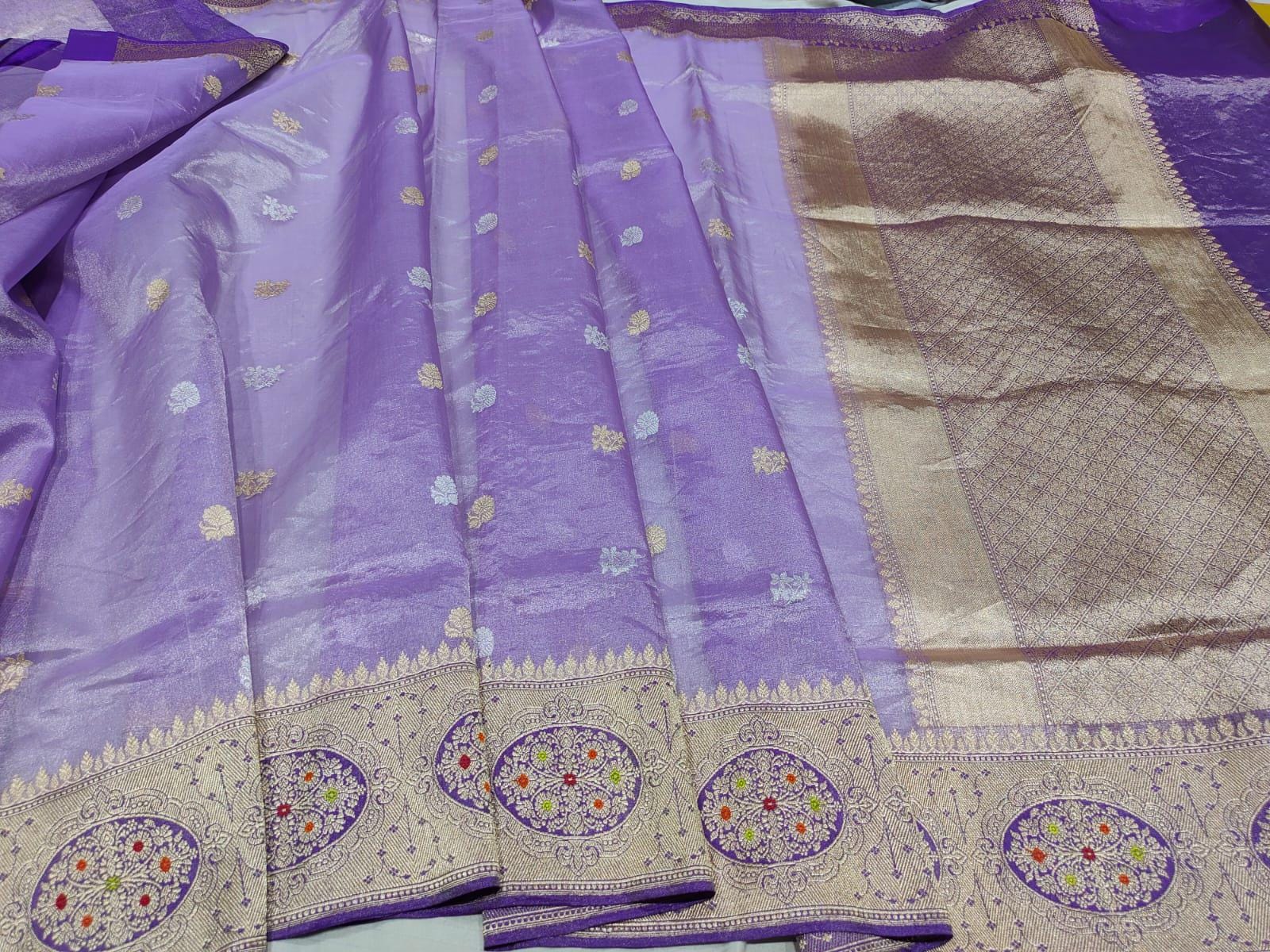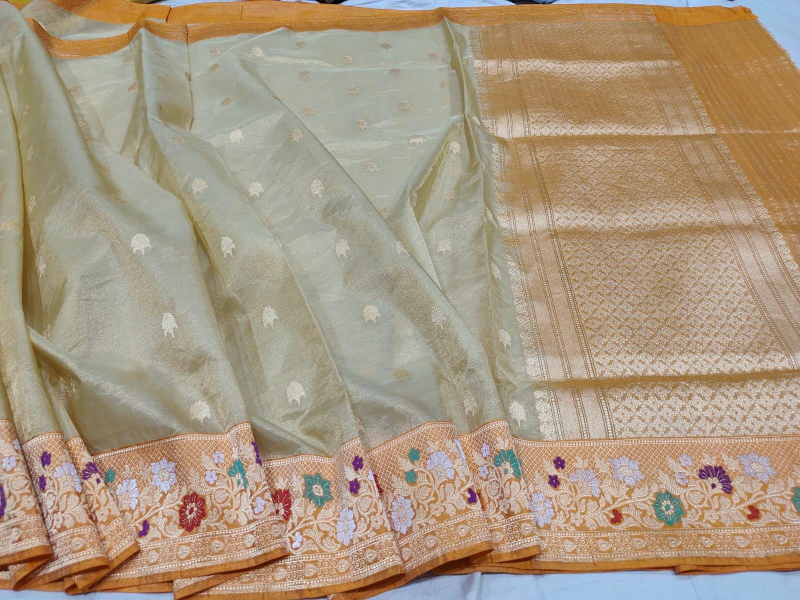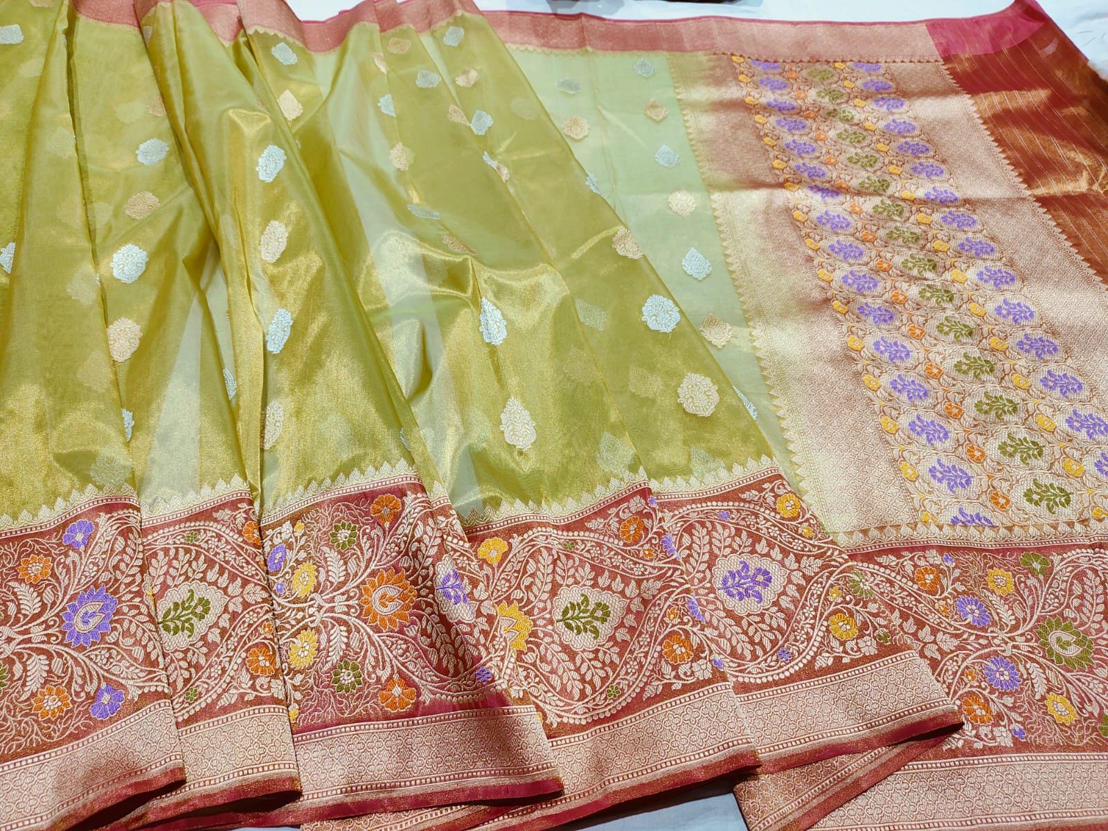 This elegant green tissue Kadhwua Banarasi handloom pure silk saree is a timeless masterpiece woven with traditional craftsmanship. Featuring delicate silver zari motifs with lotus-inspired designs and a rich zari border, this saree reflects the royal charm of Banaras weaving. The intricate kadhwua technique ensures durability and luxury, making it a perfect choice for weddings, bridal trousseau, festive occasions, or cultural celebrations.