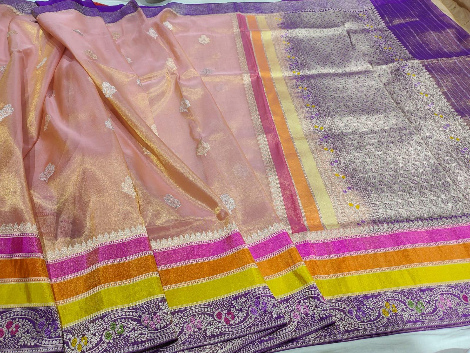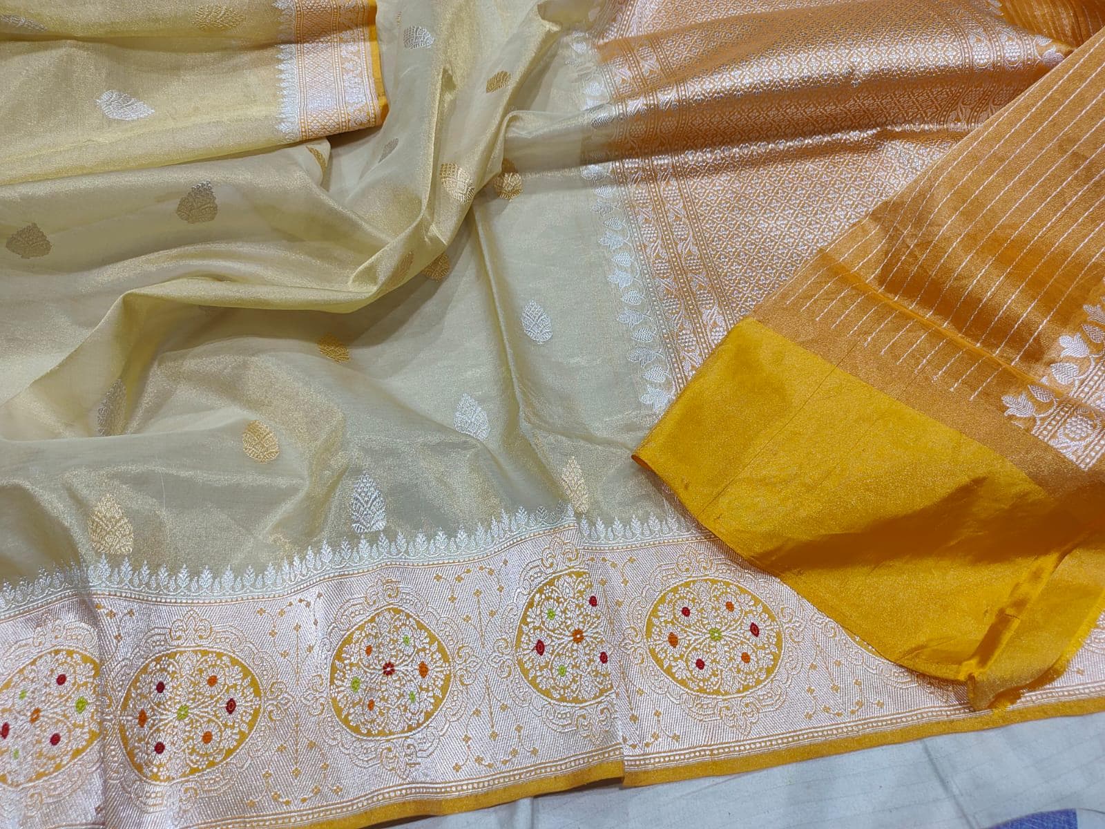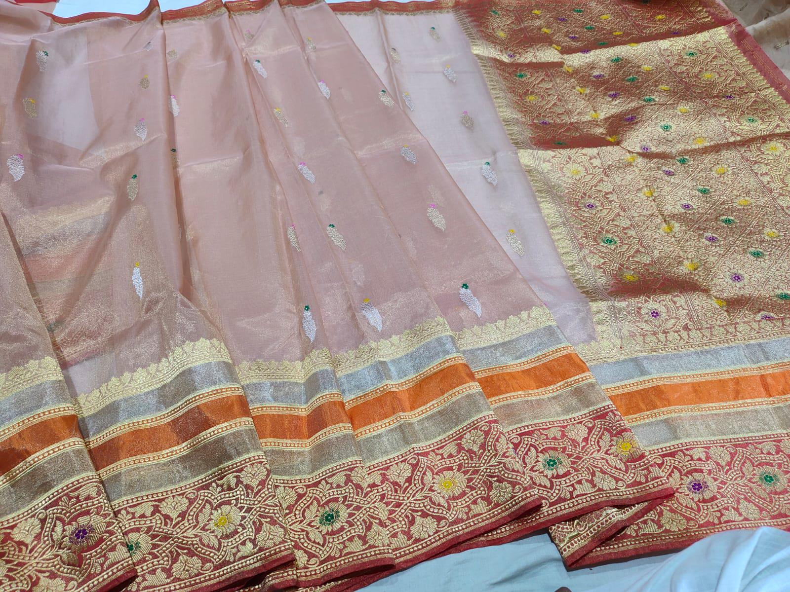 This elegant green tissue Kadhwua Banarasi handloom pure silk saree is a timeless masterpiece woven with traditional craftsmanship. Featuring delicate silver zari motifs with lotus-inspired designs and a rich zari border, this saree reflects the royal charm of Banaras weaving. The intricate kadhwua technique ensures durability and luxury, making it a perfect choice for weddings, bridal trousseau, festive occasions, or cultural celebrations.