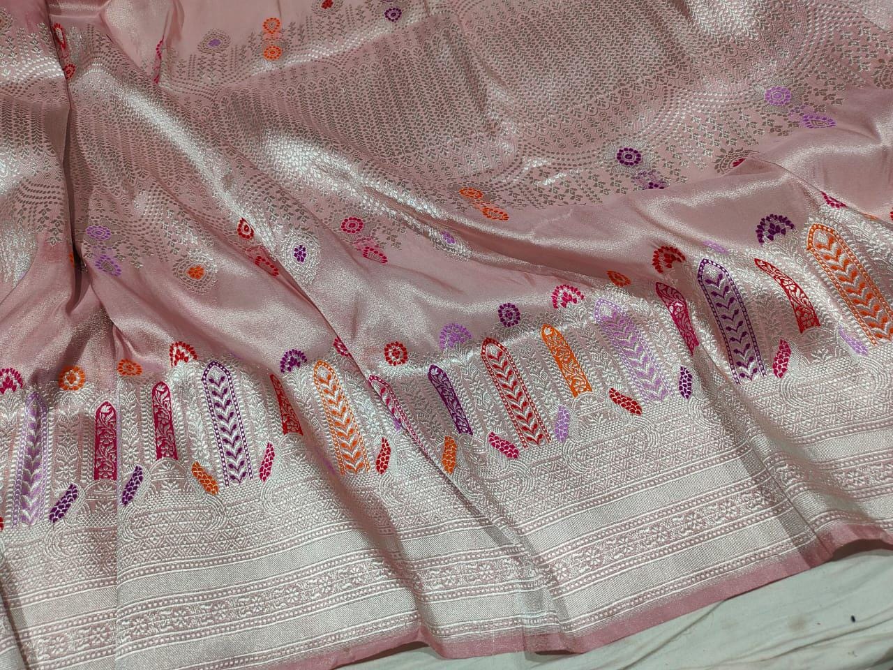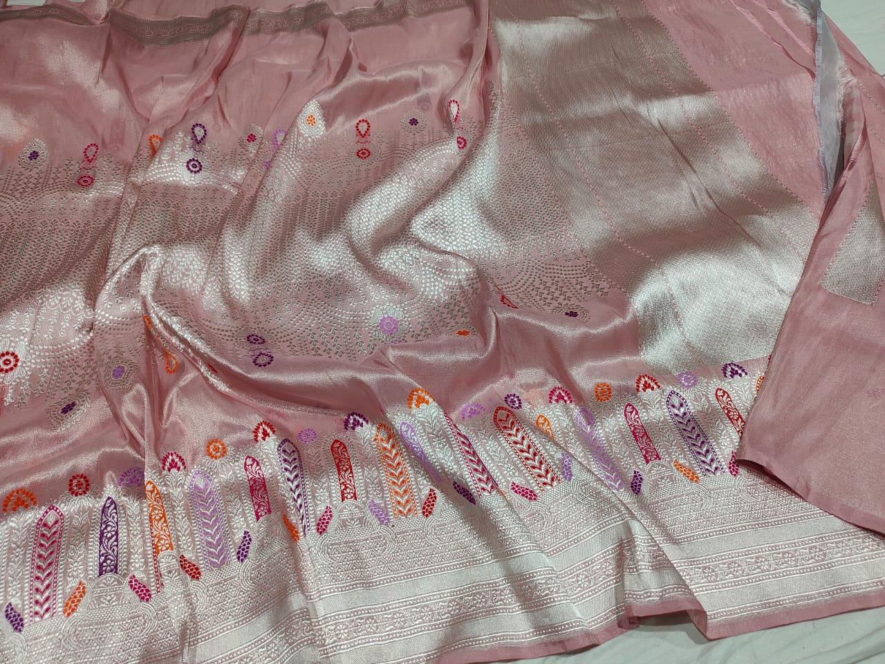 This elegant green tissue Kadhwua Banarasi handloom pure silk saree is a timeless masterpiece woven with traditional craftsmanship. Featuring delicate silver zari motifs with lotus-inspired designs and a rich zari border, this saree reflects the royal charm of Banaras weaving. The intricate kadhwua technique ensures durability and luxury, making it a perfect choice for weddings, bridal trousseau, festive occasions, or cultural celebrations.