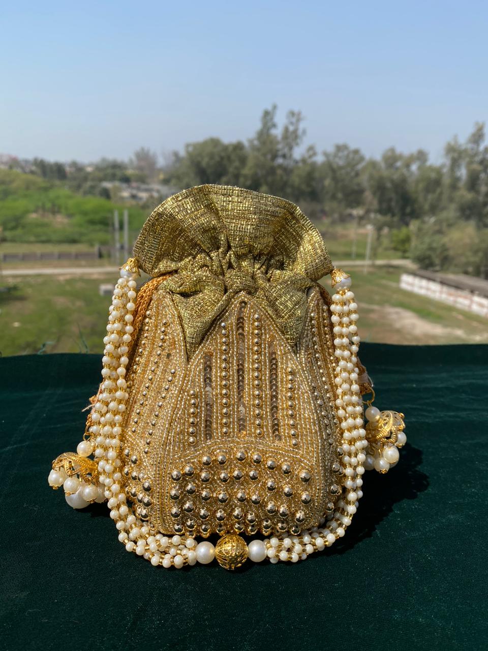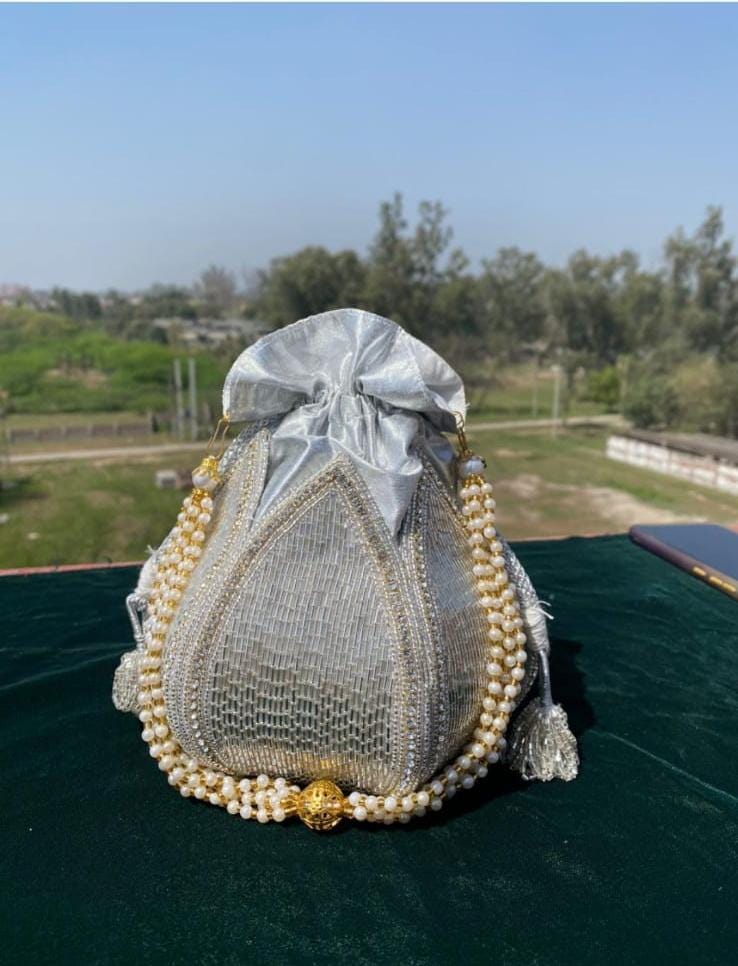 This beautiful statement piece is a must-have. All our Potlis are handcrafted and these very unique pieces! Comes with a Detachable Pearl Handle All of our premium products include luxury gift boxes.