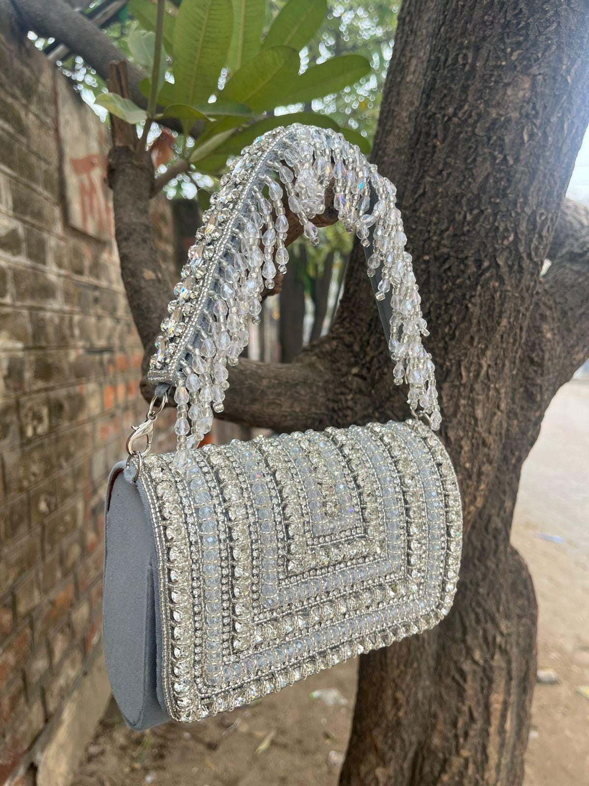 This beautiful statement piece is a must-have. All our Potlis are handcrafted and these very unique pieces! Comes with a Detachable Pearl Handle All of our premium products include luxury gift boxes.