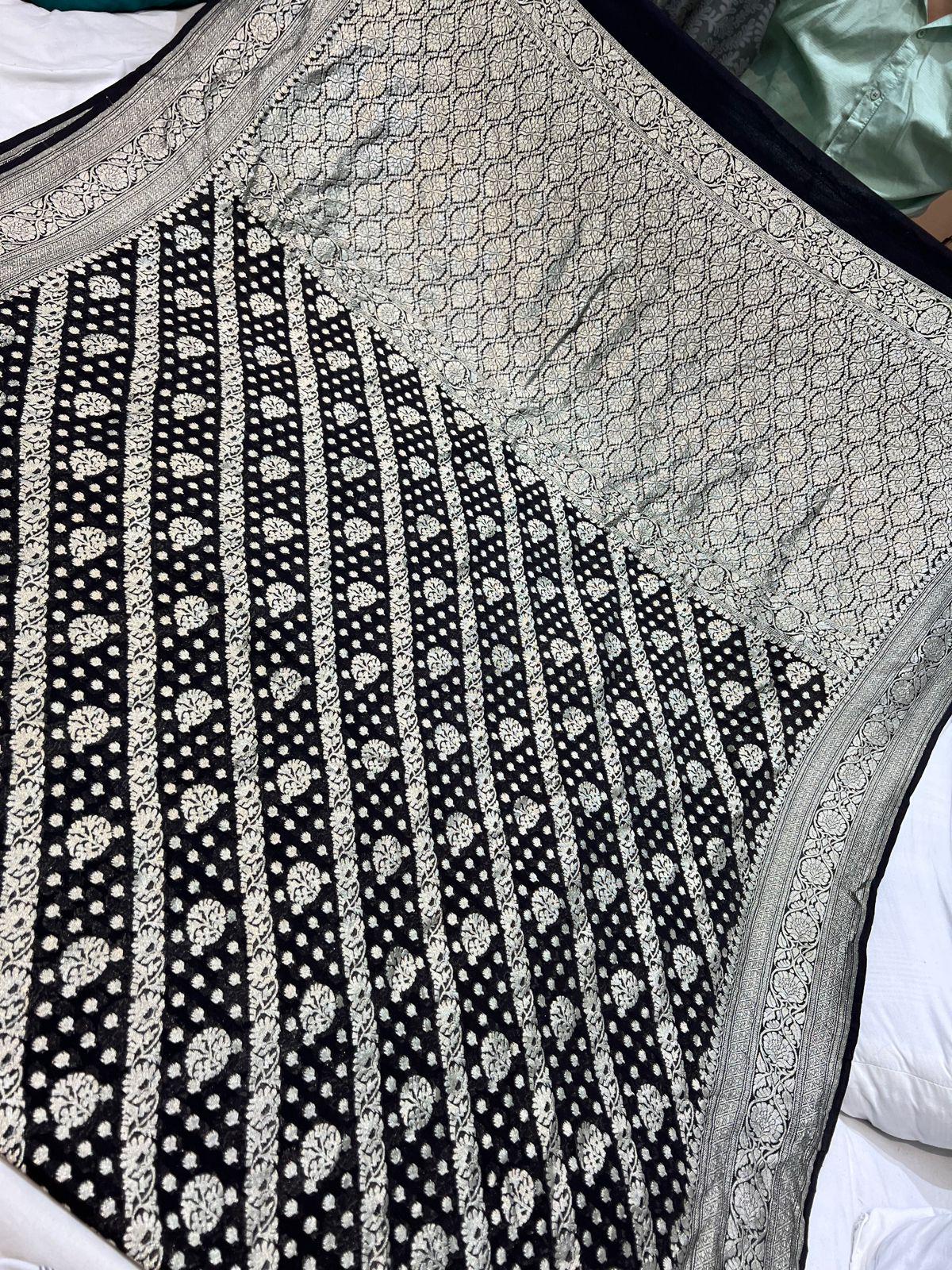 Experience the luxury of khaddi georgette chiffon, adorned with exquisite handloom prints and a stunning organic banaras silk weave. This saree is a perfect fusion of heritage and contemporary elegance, making it ideal for weddings, festive occasions, and grand celebrations. A timeless masterpiece for your ethnic collection!