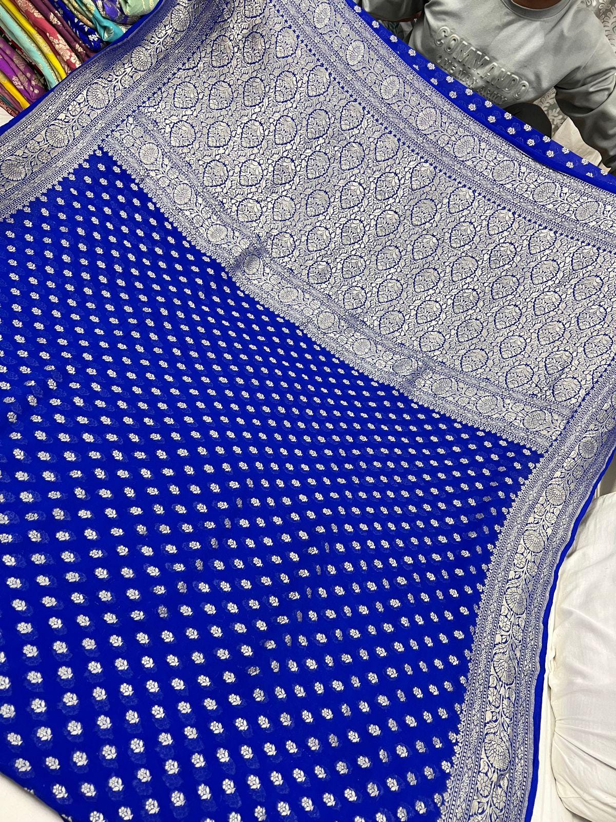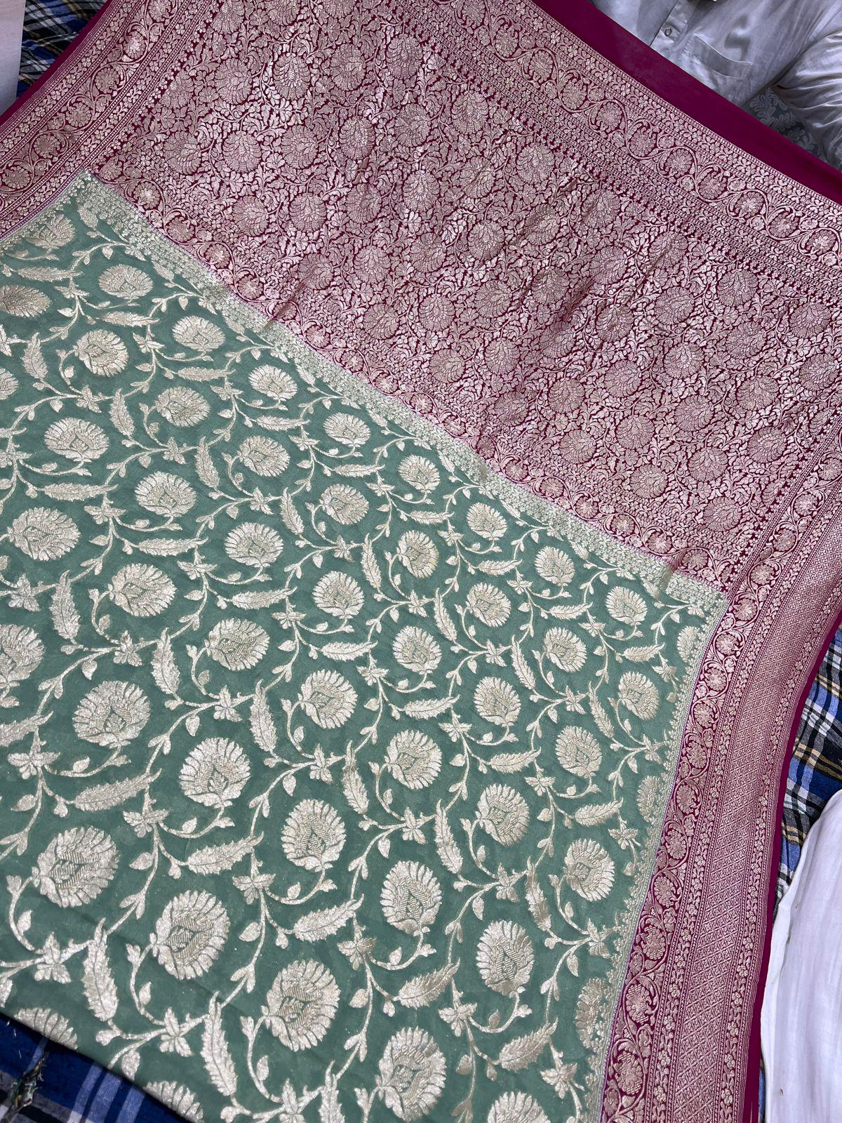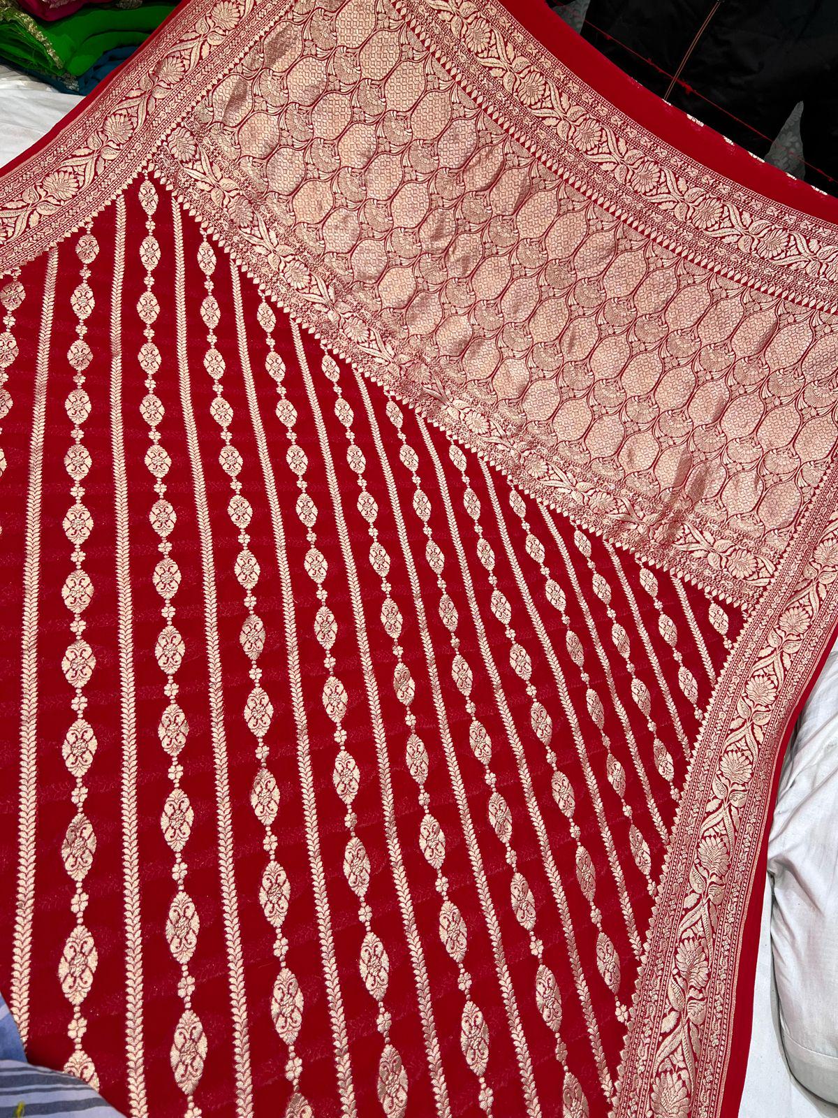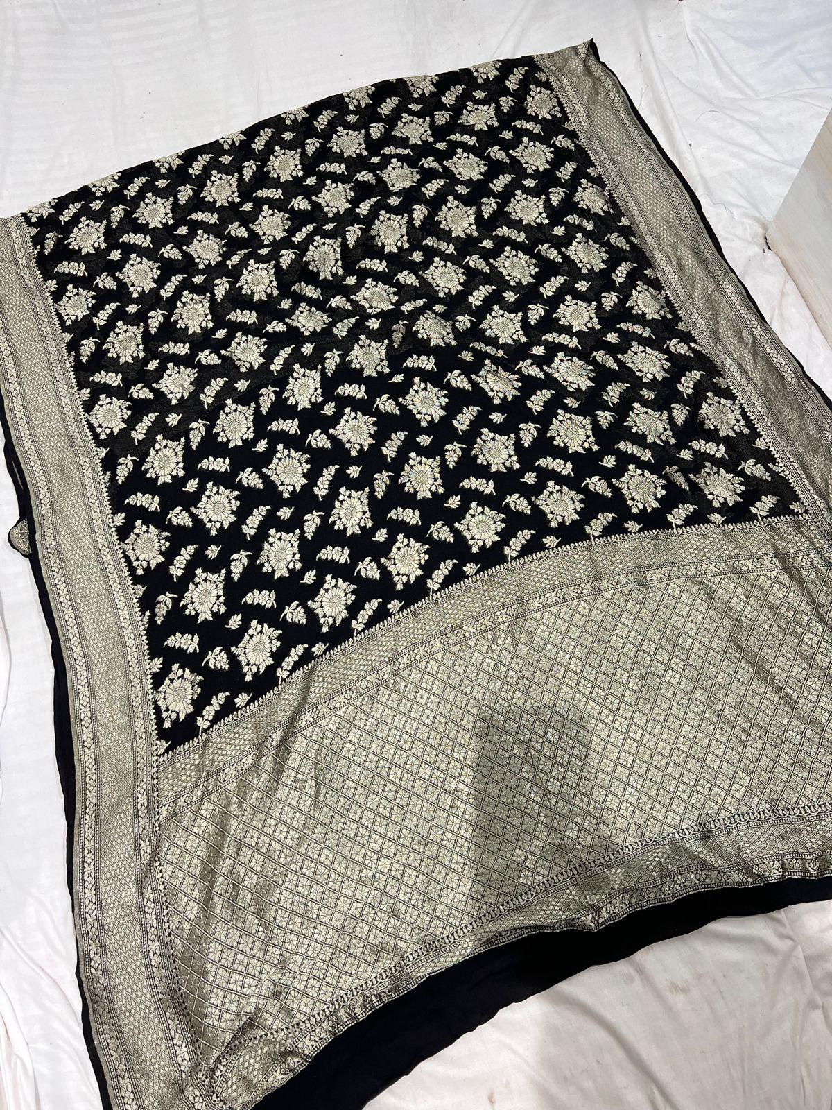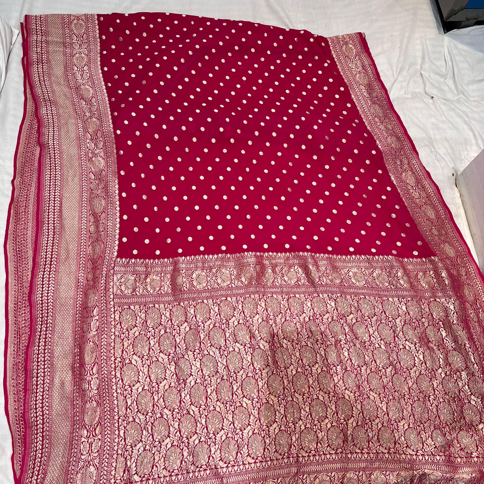 Experience the luxury of khaddi georgette chiffon, adorned with exquisite handloom prints and a stunning organic banaras silk weave. This saree is a perfect fusion of heritage and contemporary elegance, making it ideal for weddings, festive occasions, and grand celebrations. A timeless masterpiece for your ethnic collection!