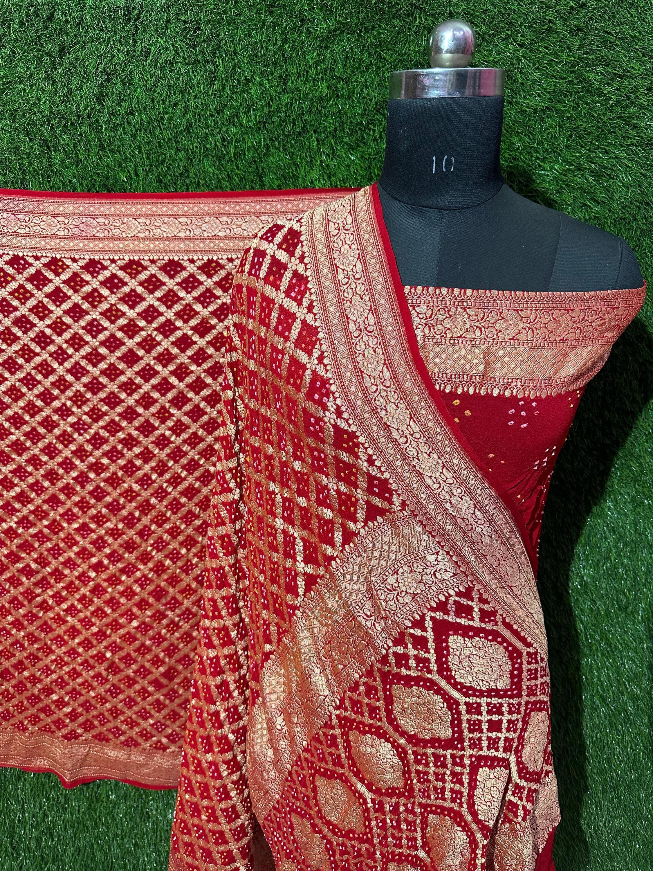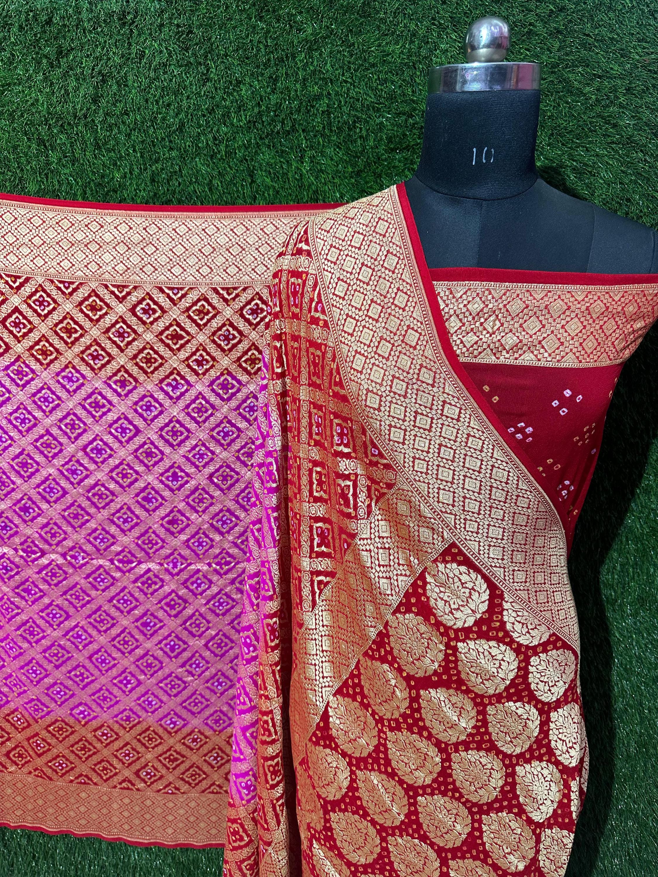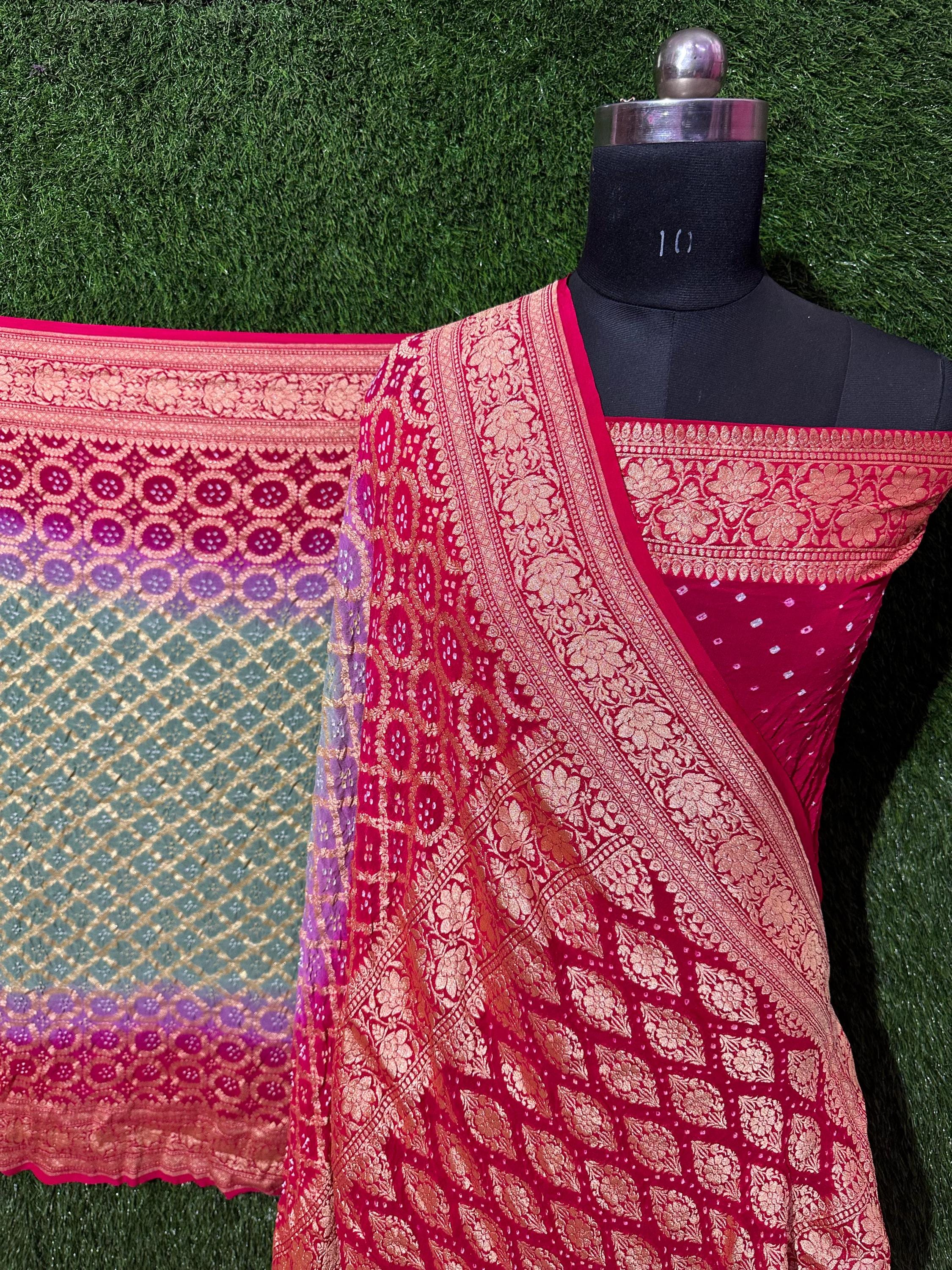 Experience the luxury of Bandhej khaddi georgette chiffon, adorned with exquisite handloom prints and a stunning organic banaras silk weave. This saree is a perfect fusion of heritage and contemporary elegance, making it ideal for weddings, festive occasions, and grand celebrations. A timeless masterpiece for your ethnic collection!