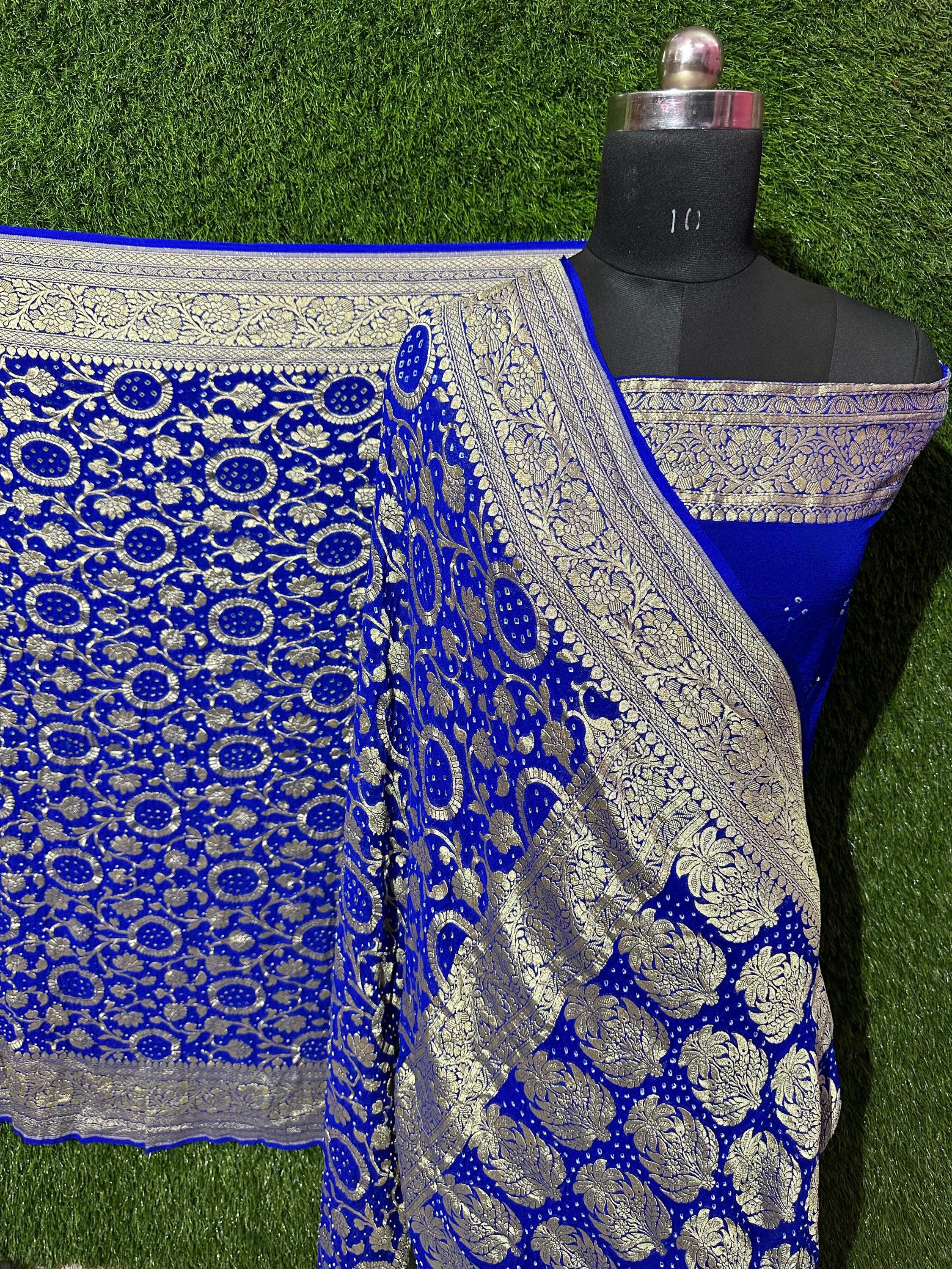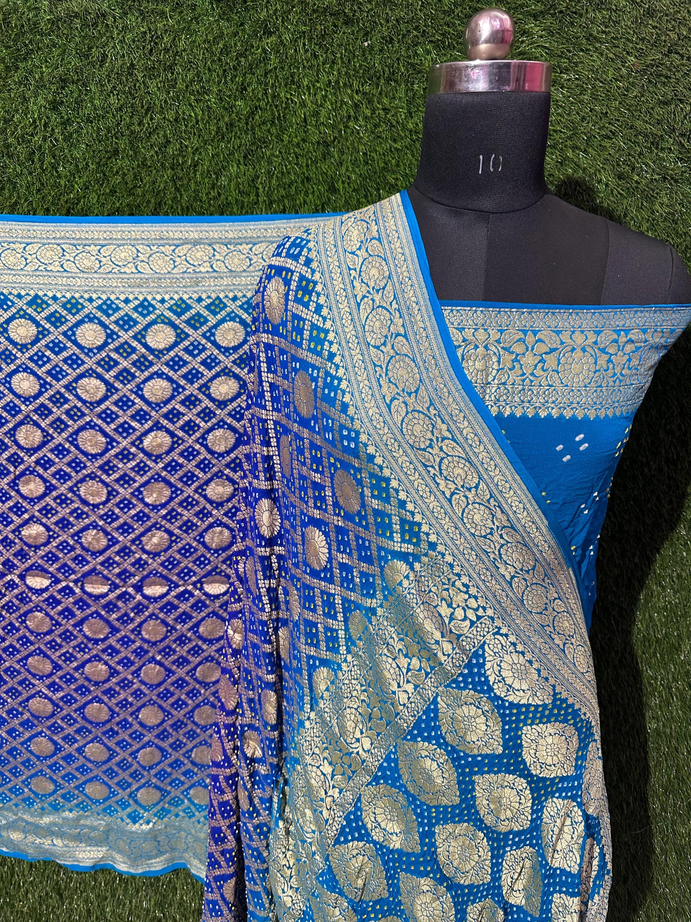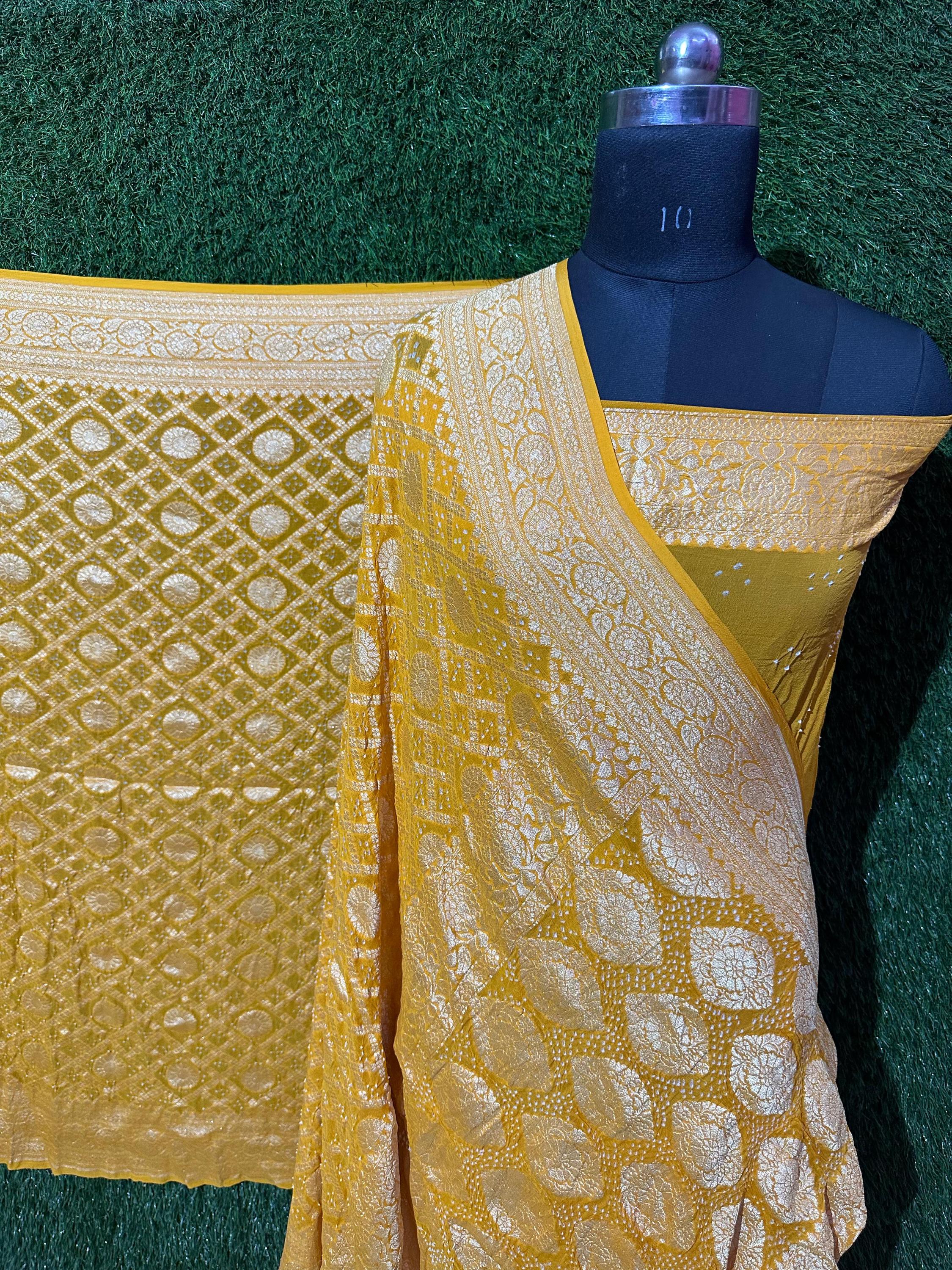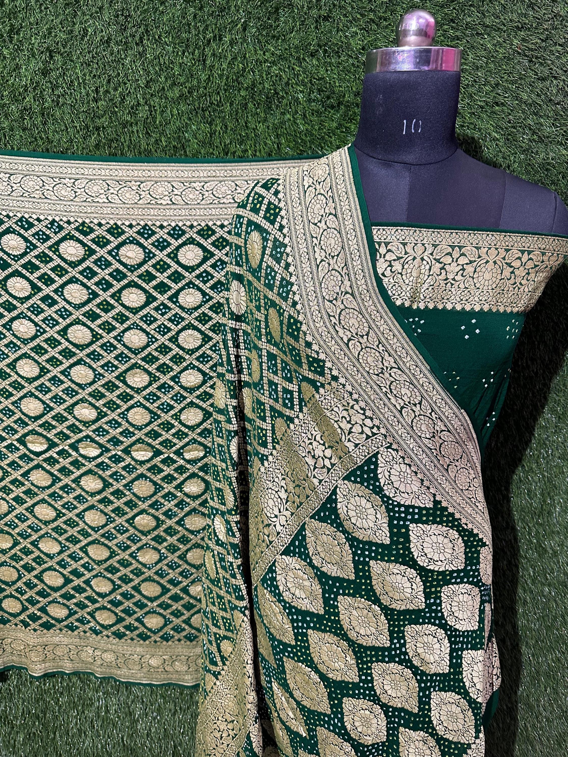 Experience the luxury of Bandhej khaddi georgette chiffon, adorned with exquisite handloom prints and a stunning organic banaras silk weave. This saree is a perfect fusion of heritage and contemporary elegance, making it ideal for weddings, festive occasions, and grand celebrations. A timeless masterpiece for your ethnic collection!