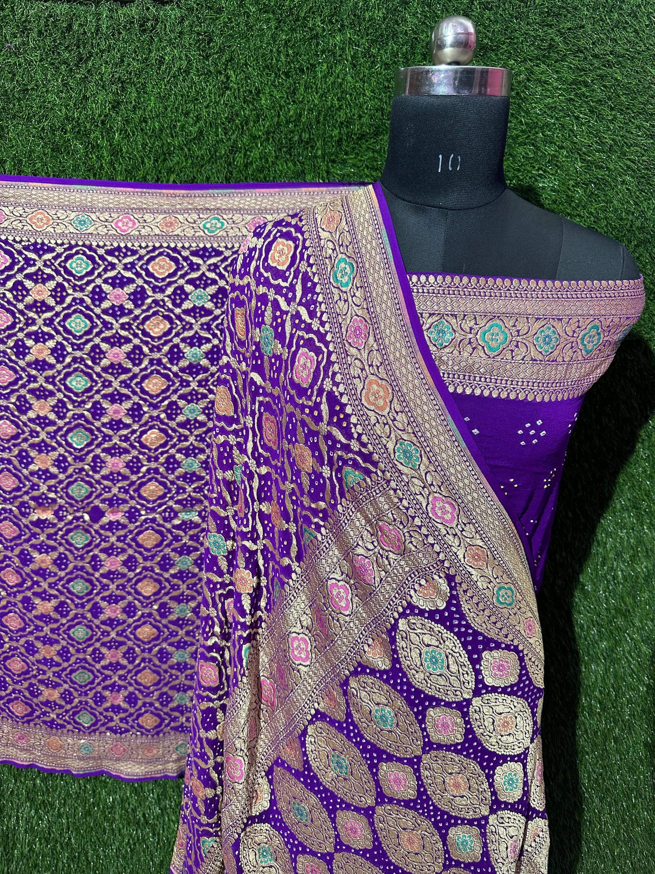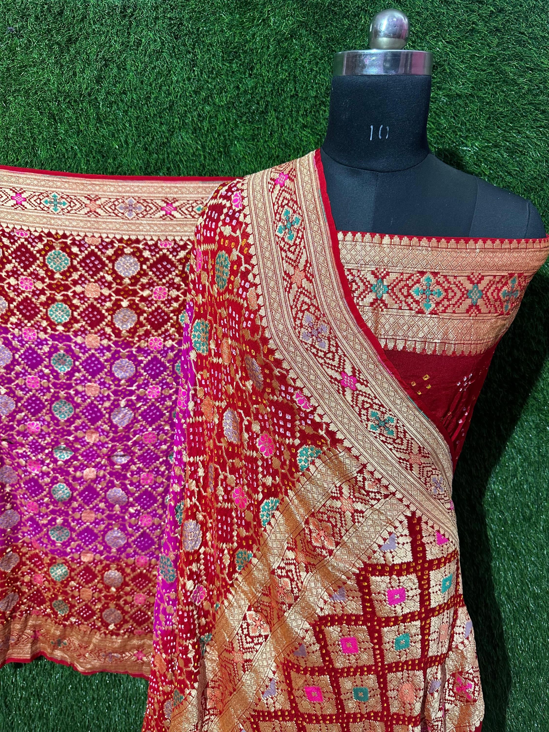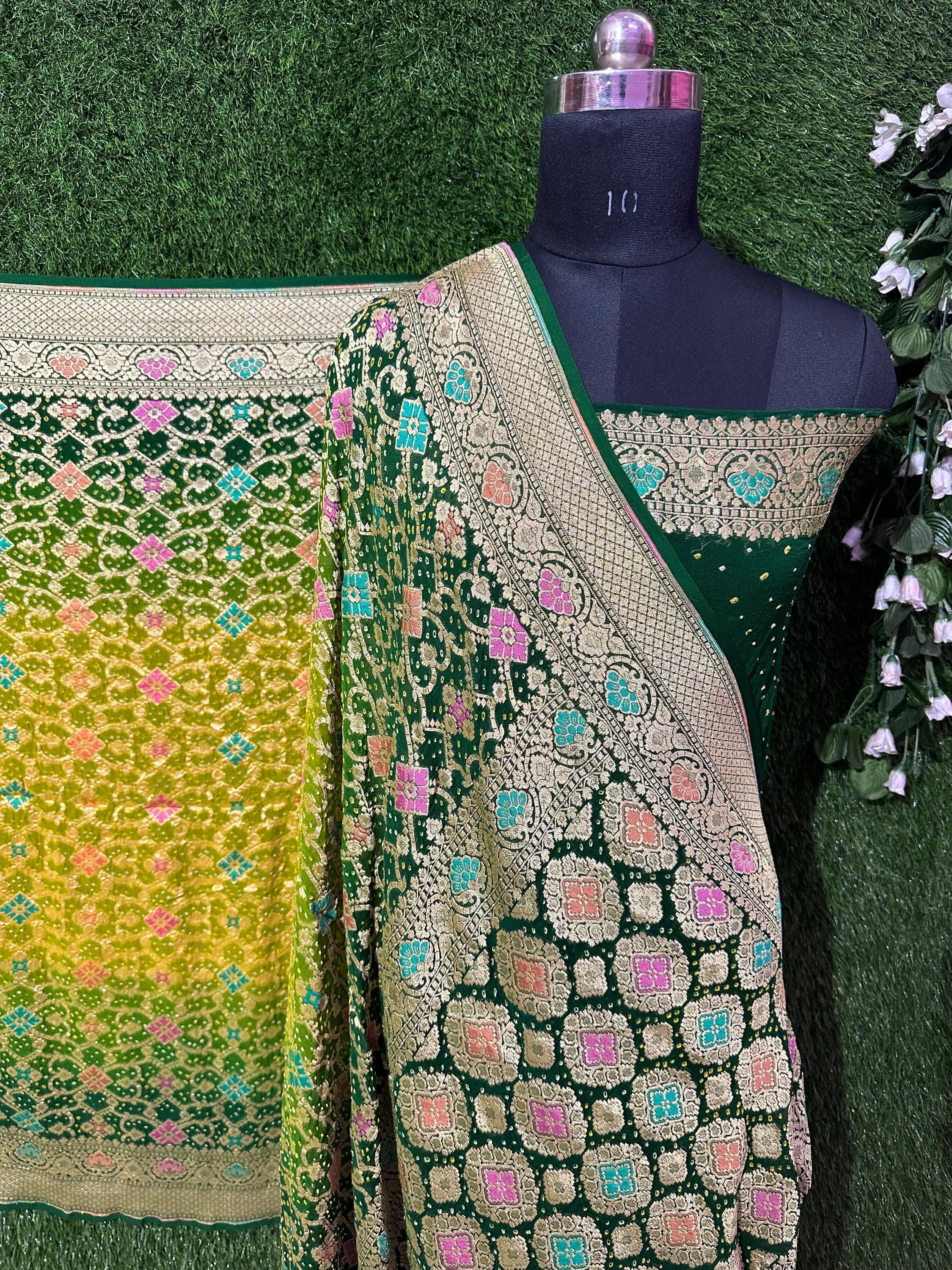 Experience the luxury of Bandhej khaddi georgette chiffon, adorned with exquisite handloom prints and a stunning organic banaras silk weave. This saree is a perfect fusion of heritage and contemporary elegance, making it ideal for weddings, festive occasions, and grand celebrations. A timeless masterpiece for your ethnic collection!