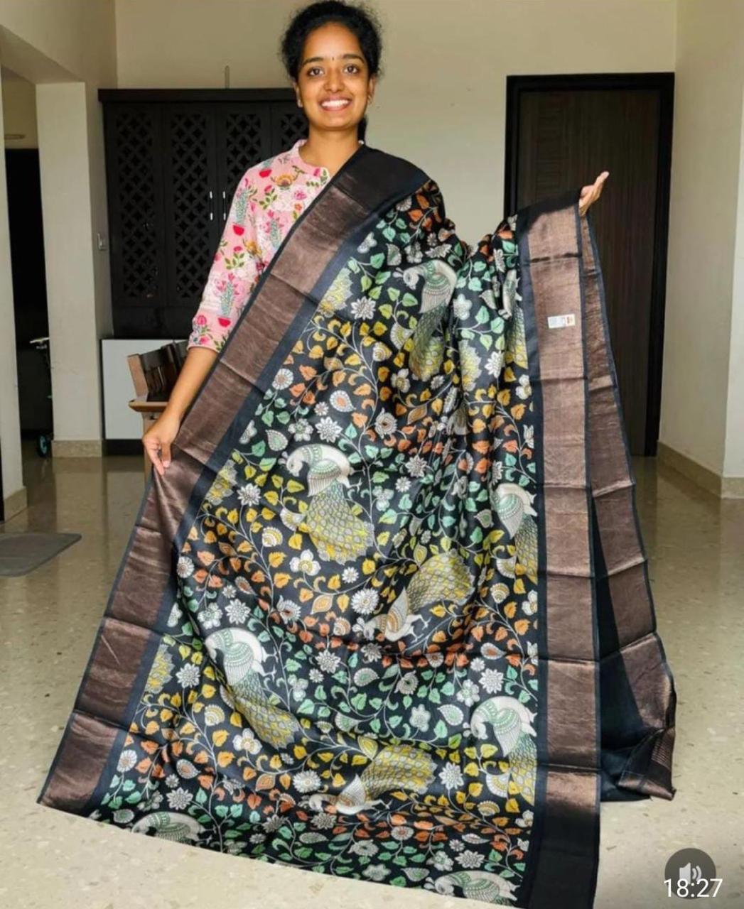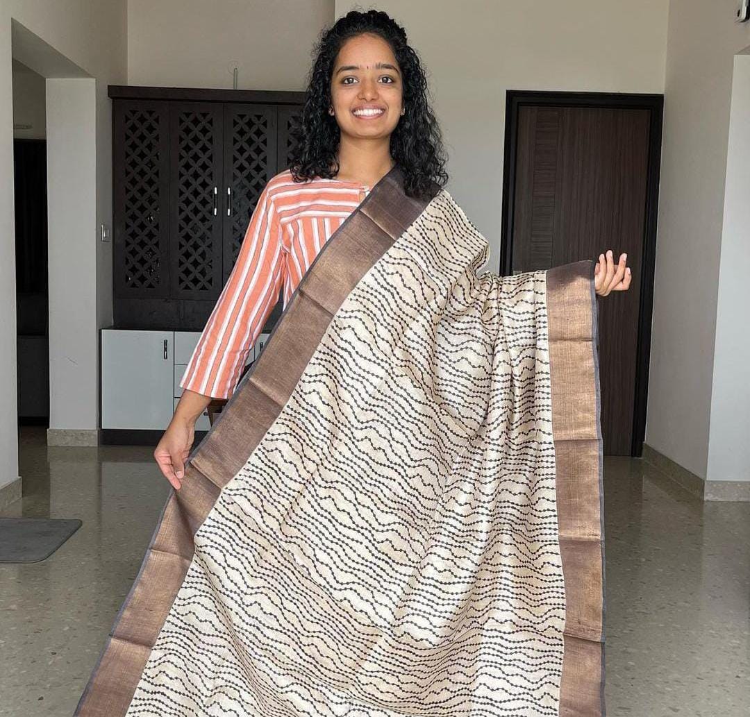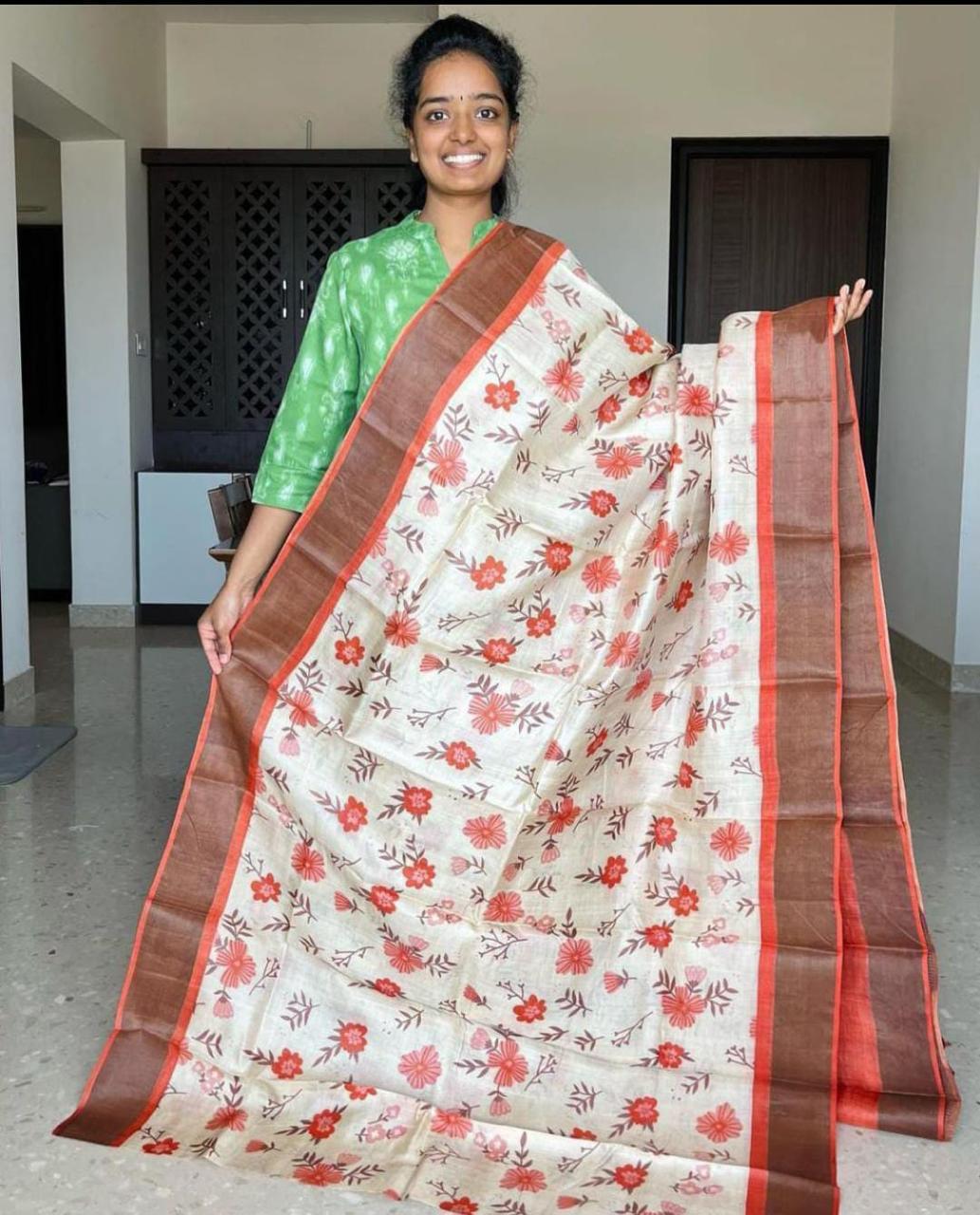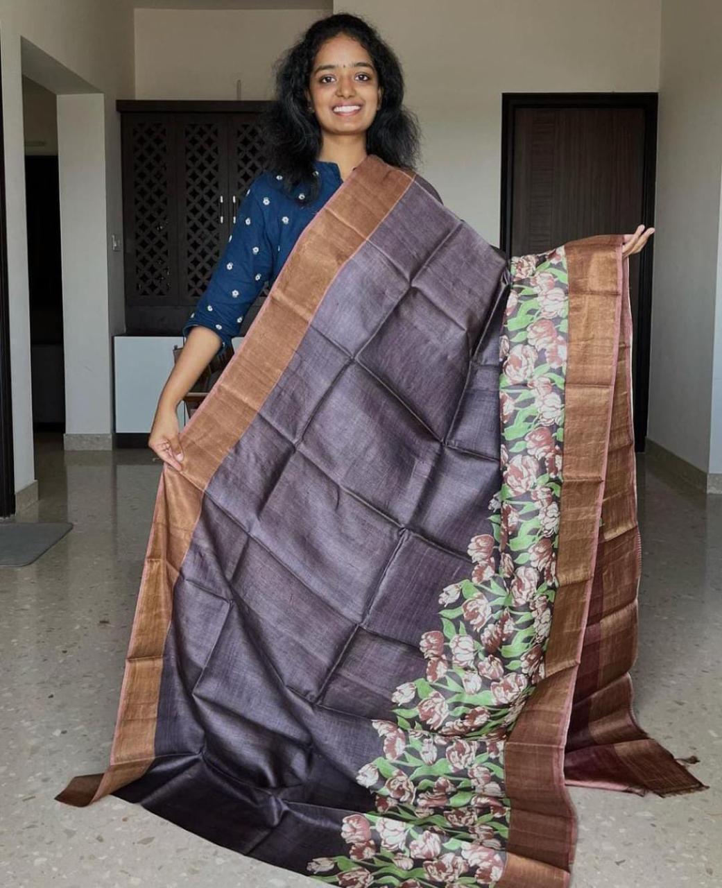 Muga Tussar Silk Saree, Abstract Kalamkari Floral Print, Handloom Wedding Saree