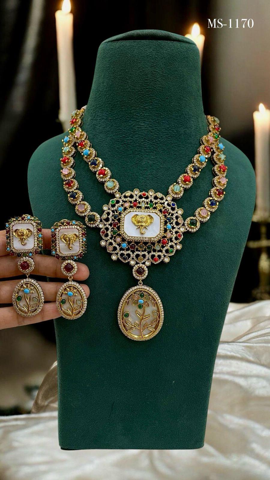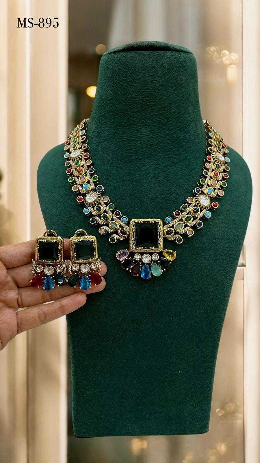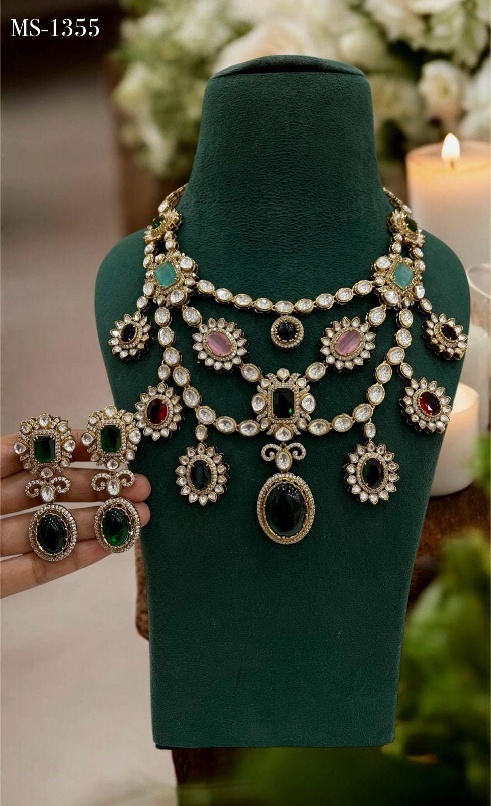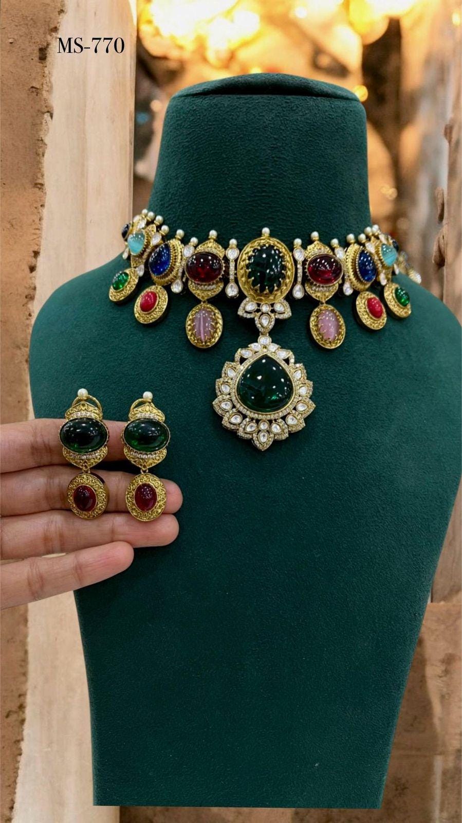 Step into timeless grace with our Regal Gemstone Elegance Set, a masterpiece of artistry and opulence. This handcrafted necklace and earring set features an enchanting mix of multicolored gemstones — emerald green, ruby red, onyx black, moonstone white, and smoky grey — each framed in delicate cubic zirconia and gold-tone settings. The statement pendant and coordinated drop earrings bring a majestic charm that’s perfect for bridal wear, festive occasions, or luxury soirées.