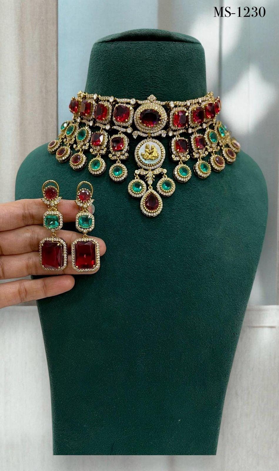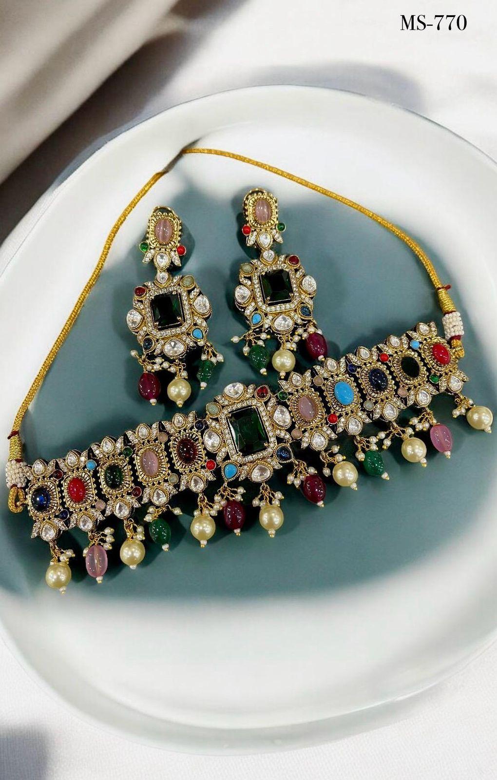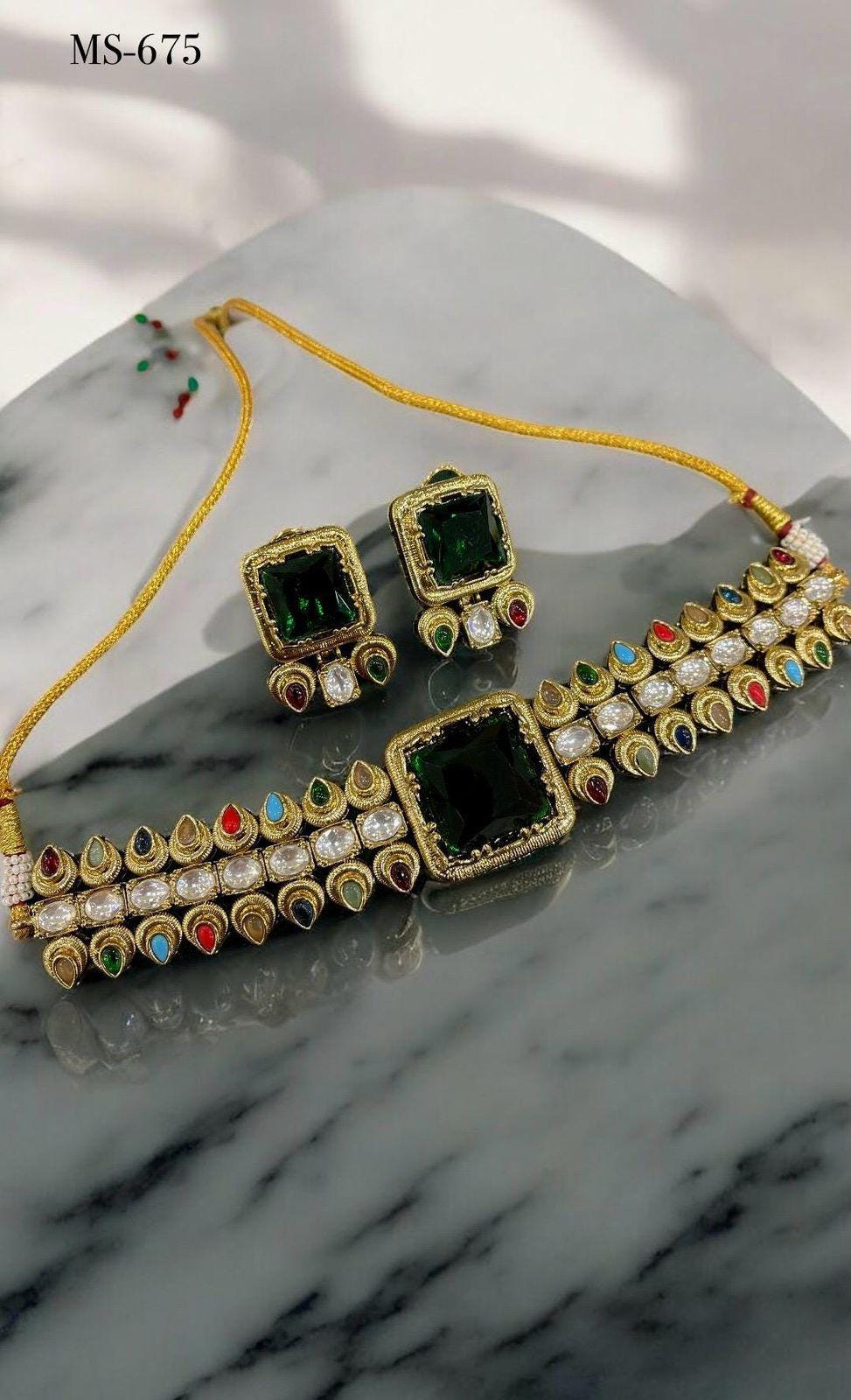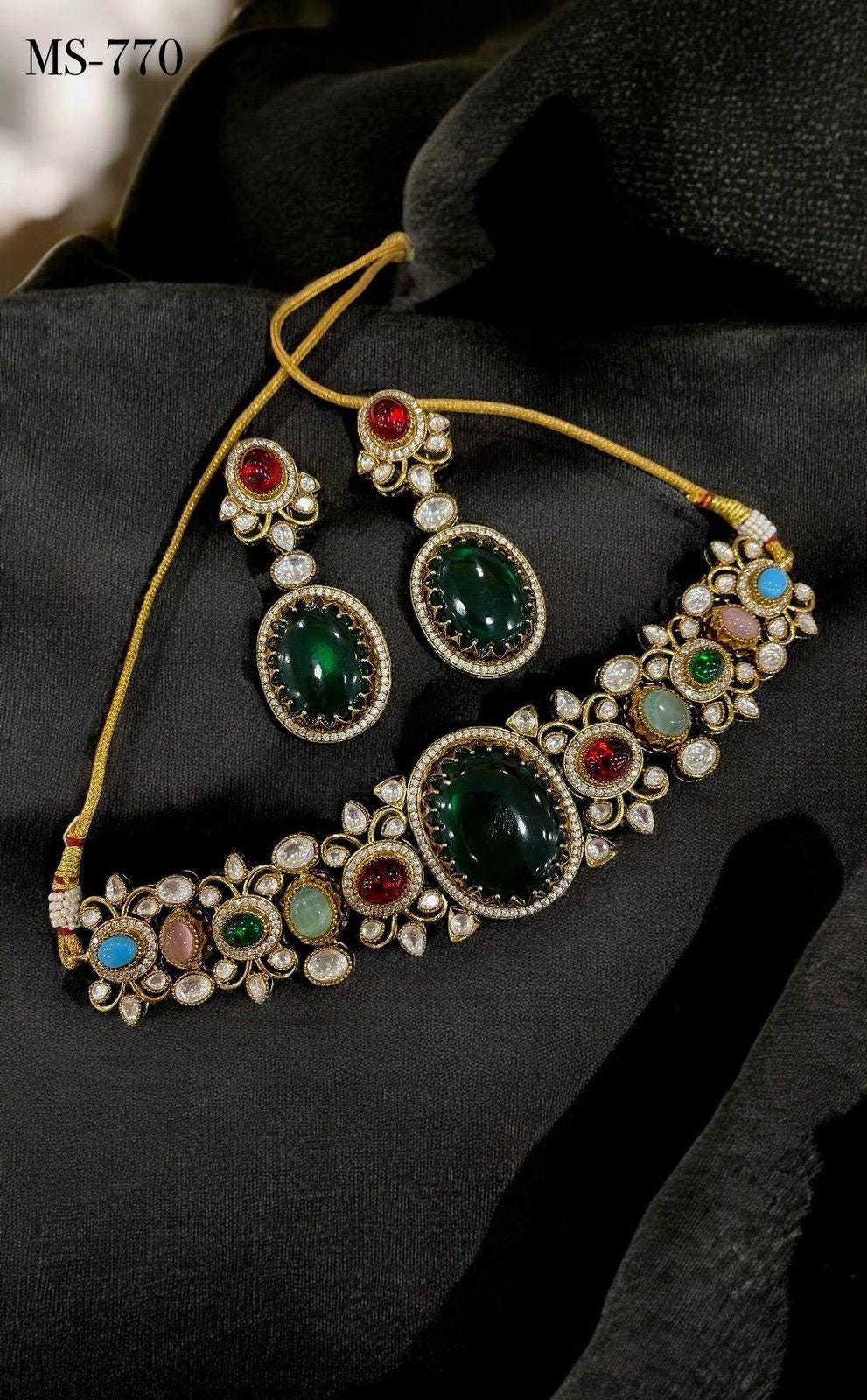 Step into timeless grace with our Regal Gemstone Elegance Set, a masterpiece of artistry and opulence. This handcrafted necklace and earring set features an enchanting mix of multicolored gemstones — emerald green, ruby red, onyx black, moonstone white, and smoky grey — each framed in delicate cubic zirconia and gold-tone settings. The statement pendant and coordinated drop earrings bring a majestic charm that’s perfect for bridal wear, festive occasions, or luxury soirées.