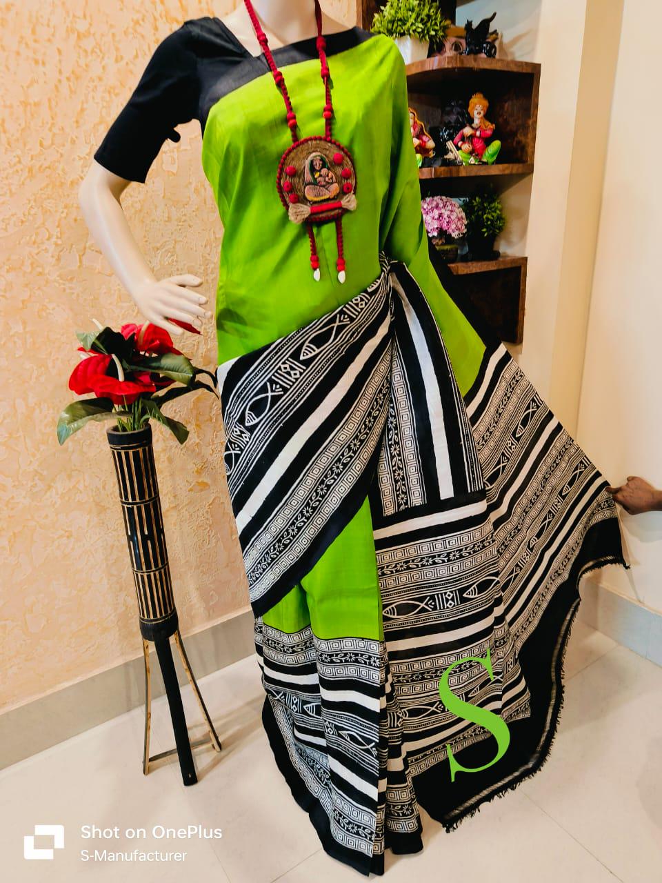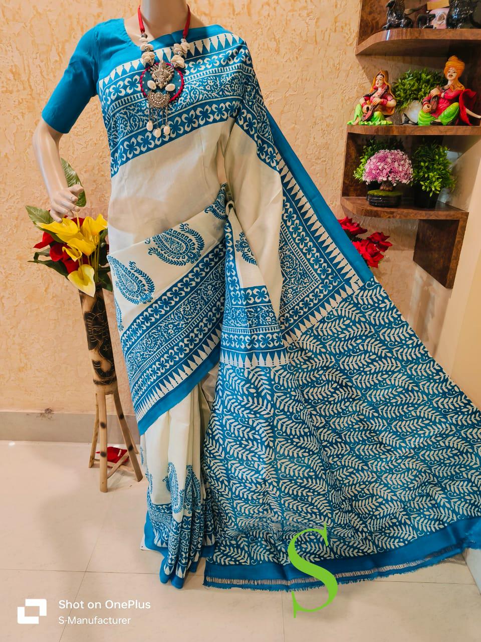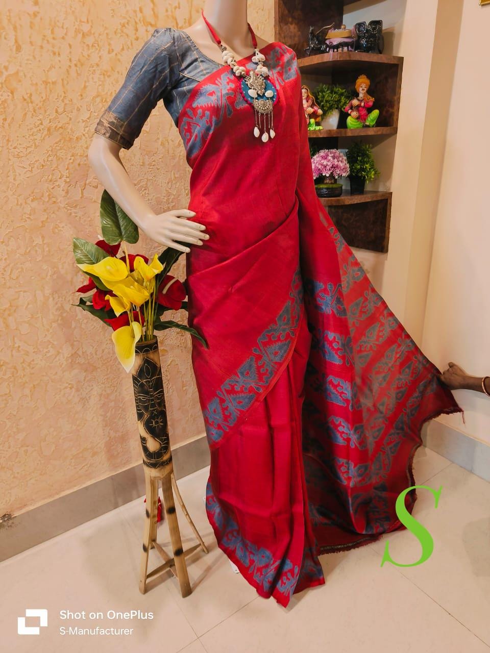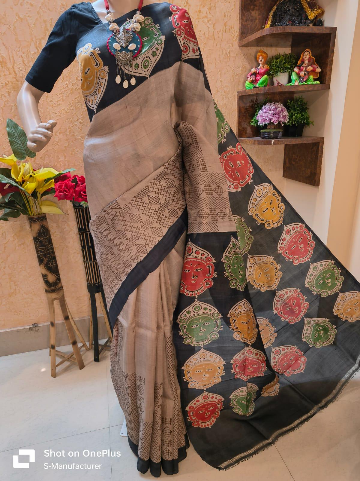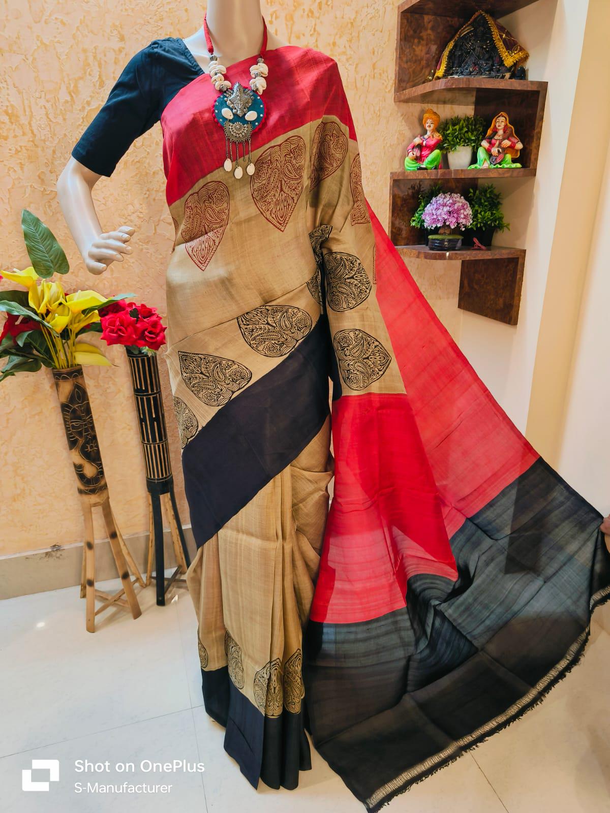 Handloom Katan Silk Saree, Bishnupur Block Print, Dual Tone
