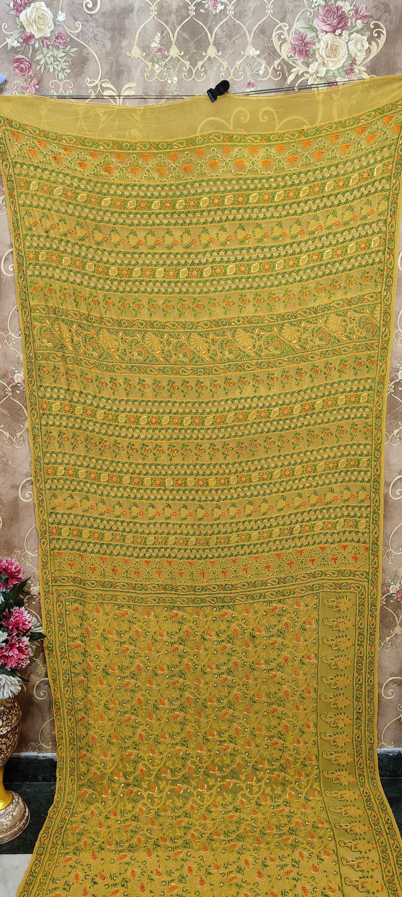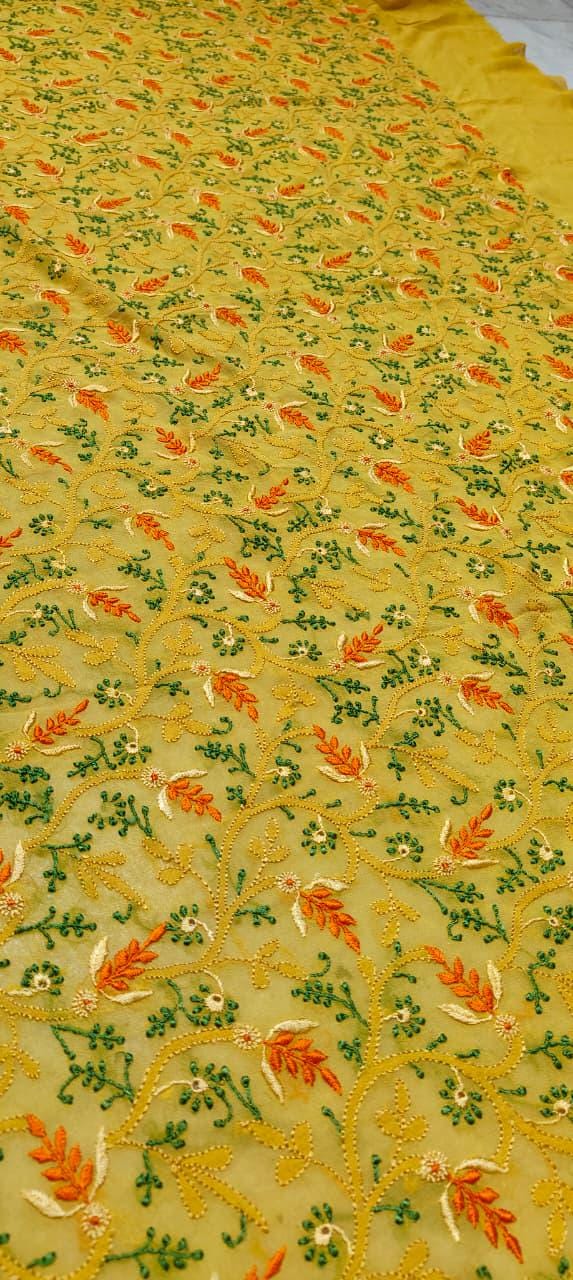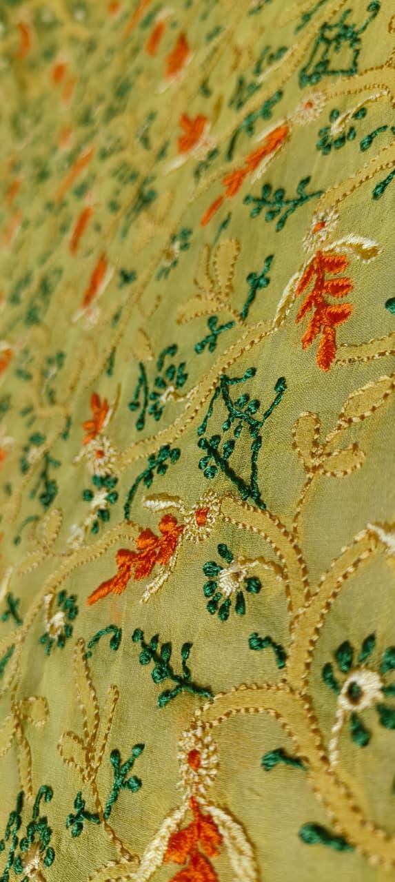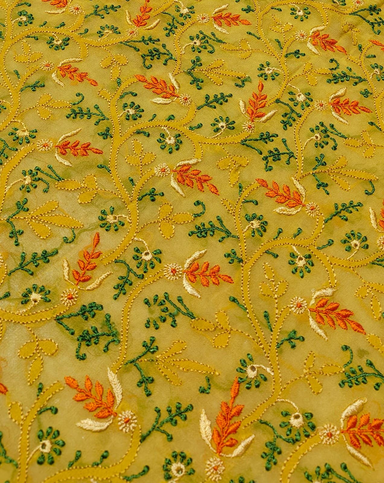 The soft lemon-yellow base is beautifully elevated with delicate threadwork in shades of green and orange, creating a rich floral and paisley narrative across the fabric. The handloom khaddi texture lends it a luxurious yet breathable feel — perfect for festive occasions or elegant daywear.