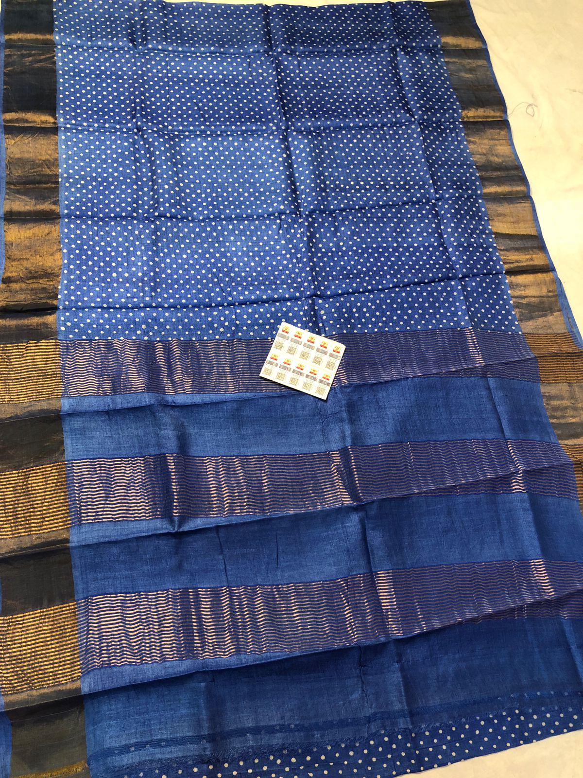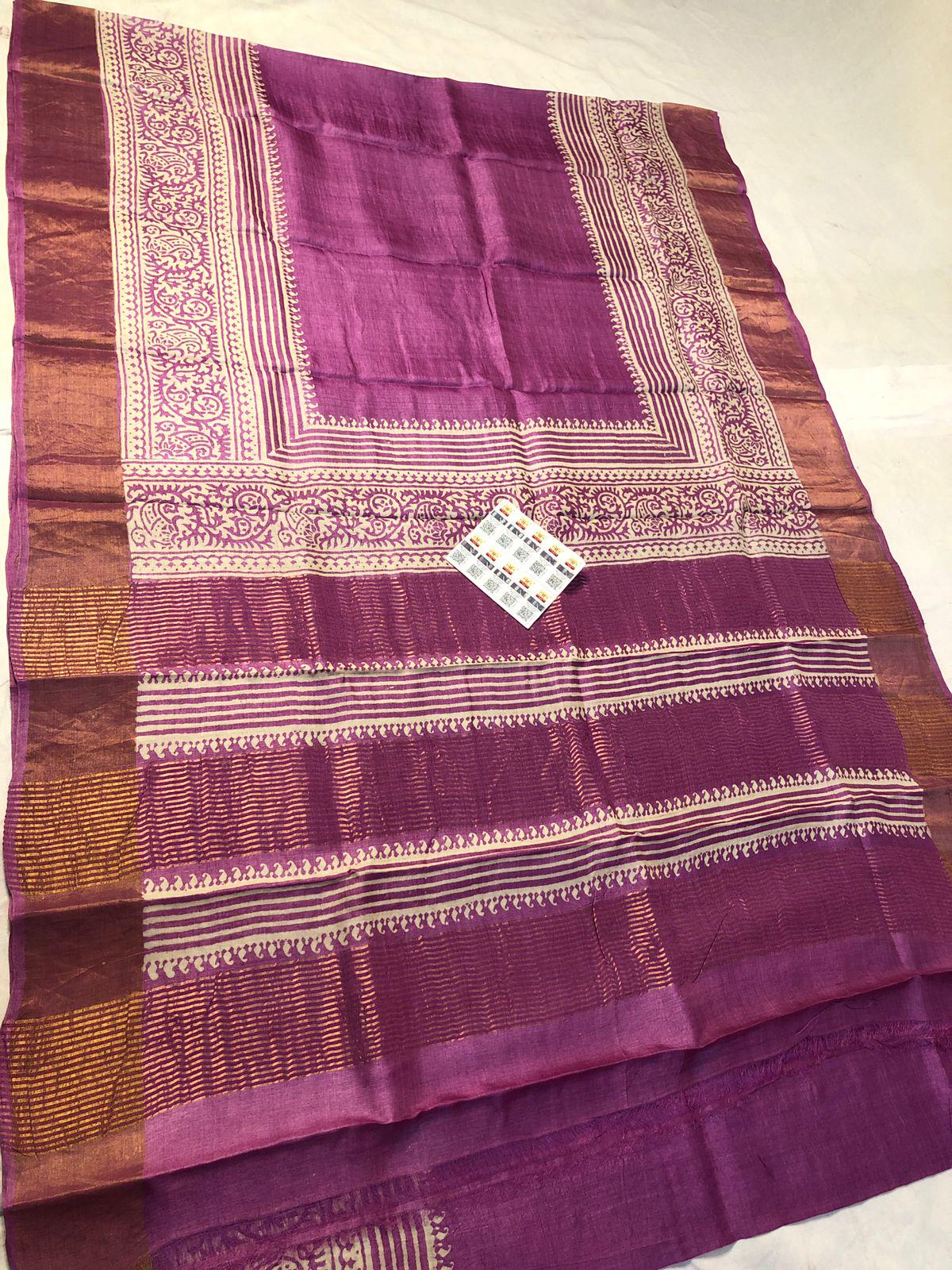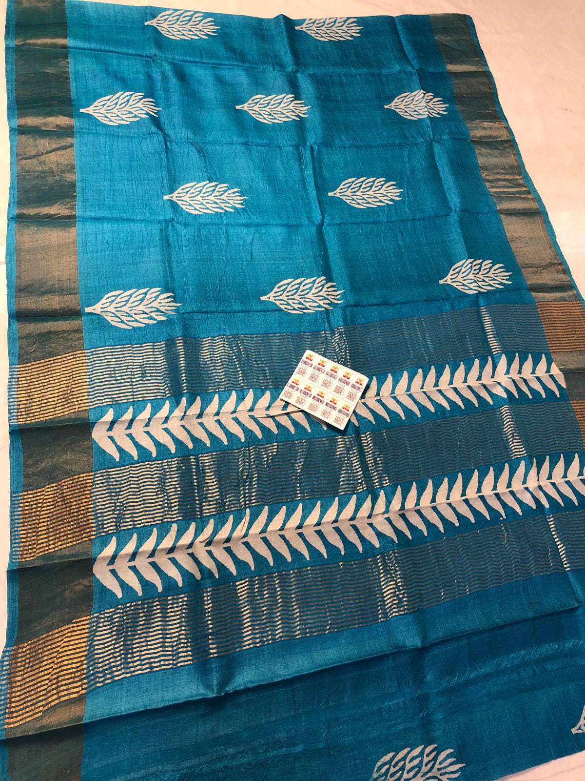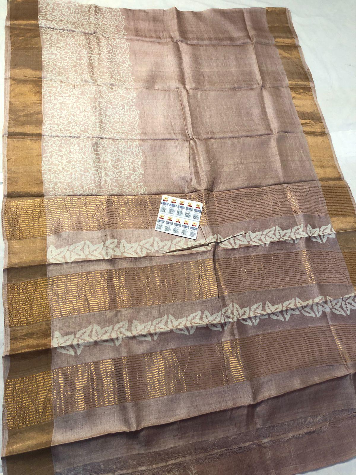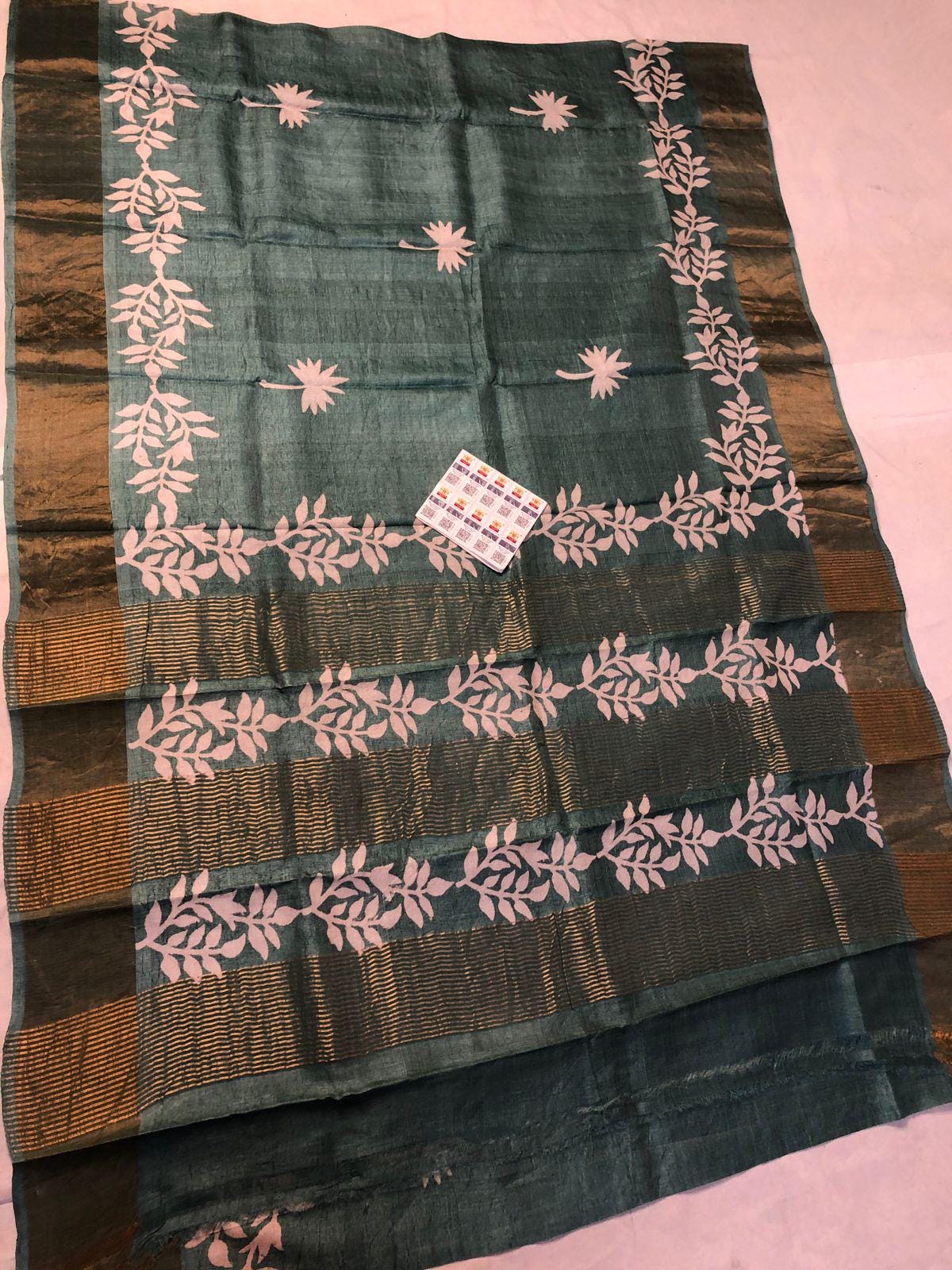 Handloom Tussar Silk Saree, Zari Border, Hand-Painted Flowers