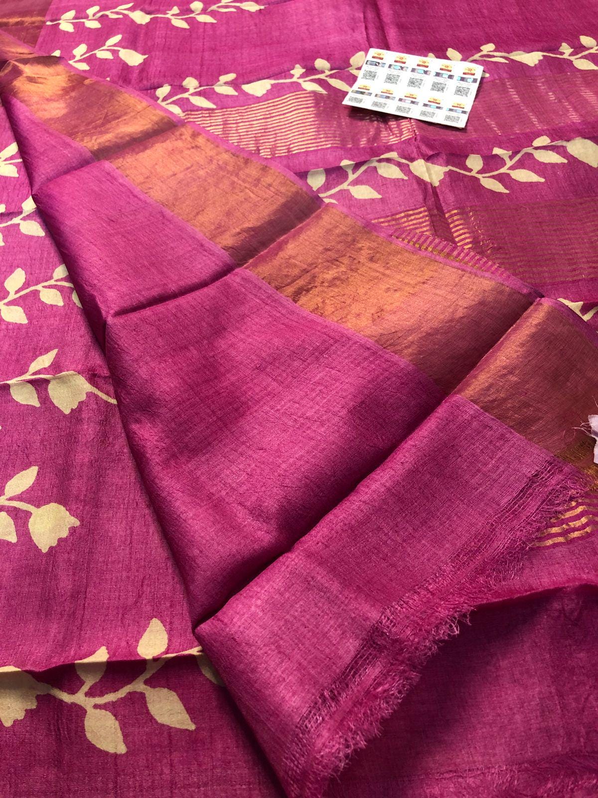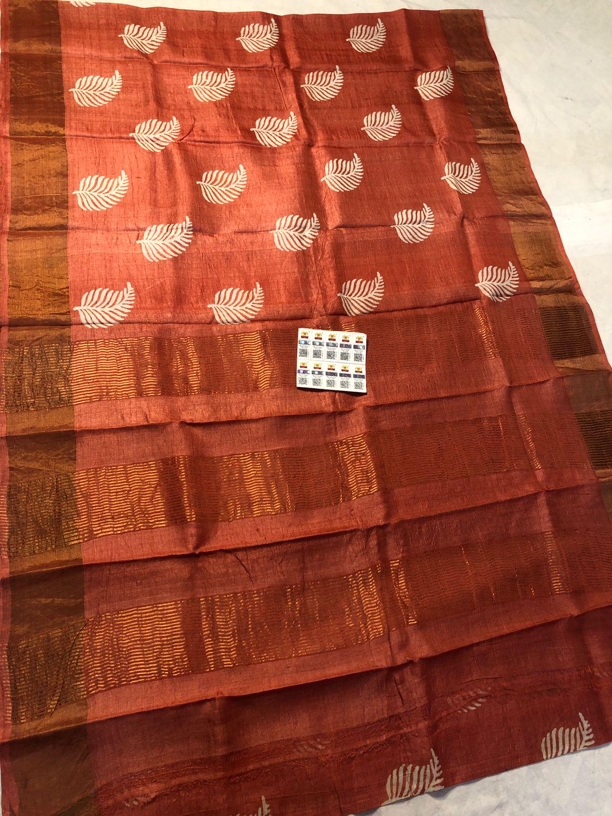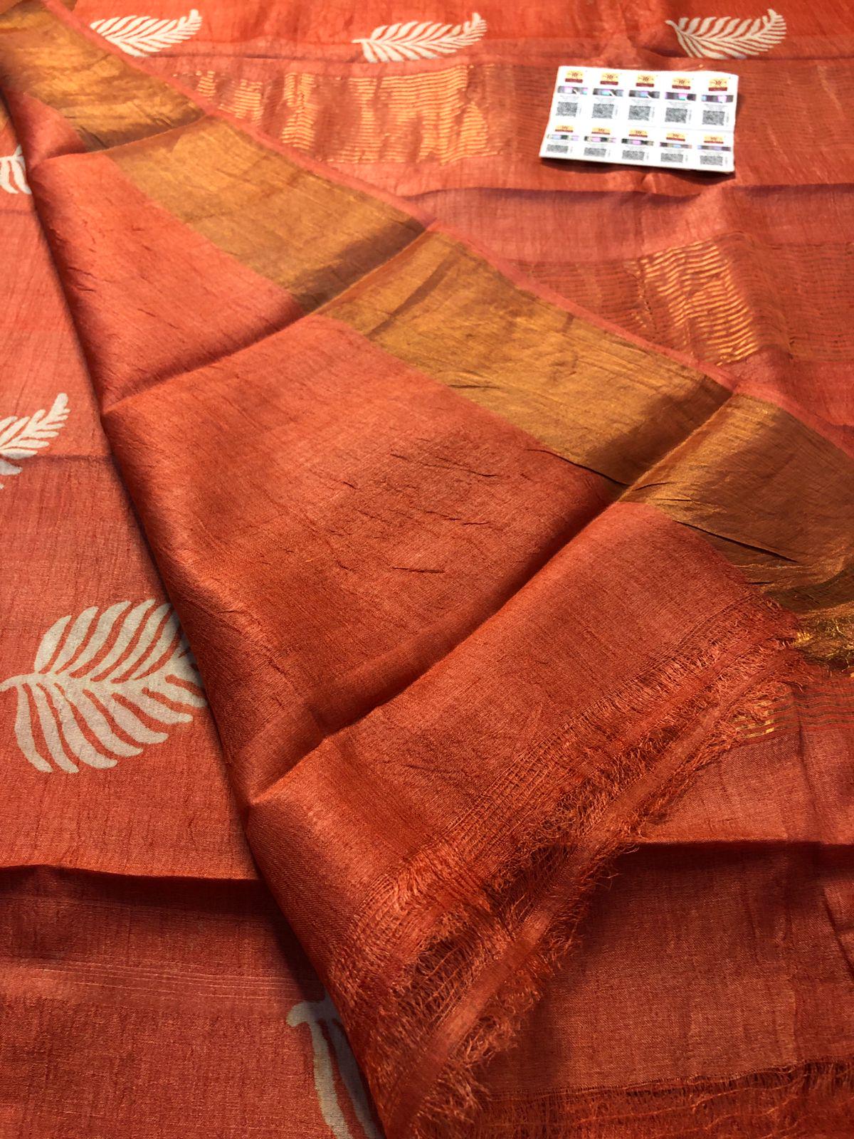Handloom Tussar Silk Saree, Zari Border, Hand-Painted Floral Design
