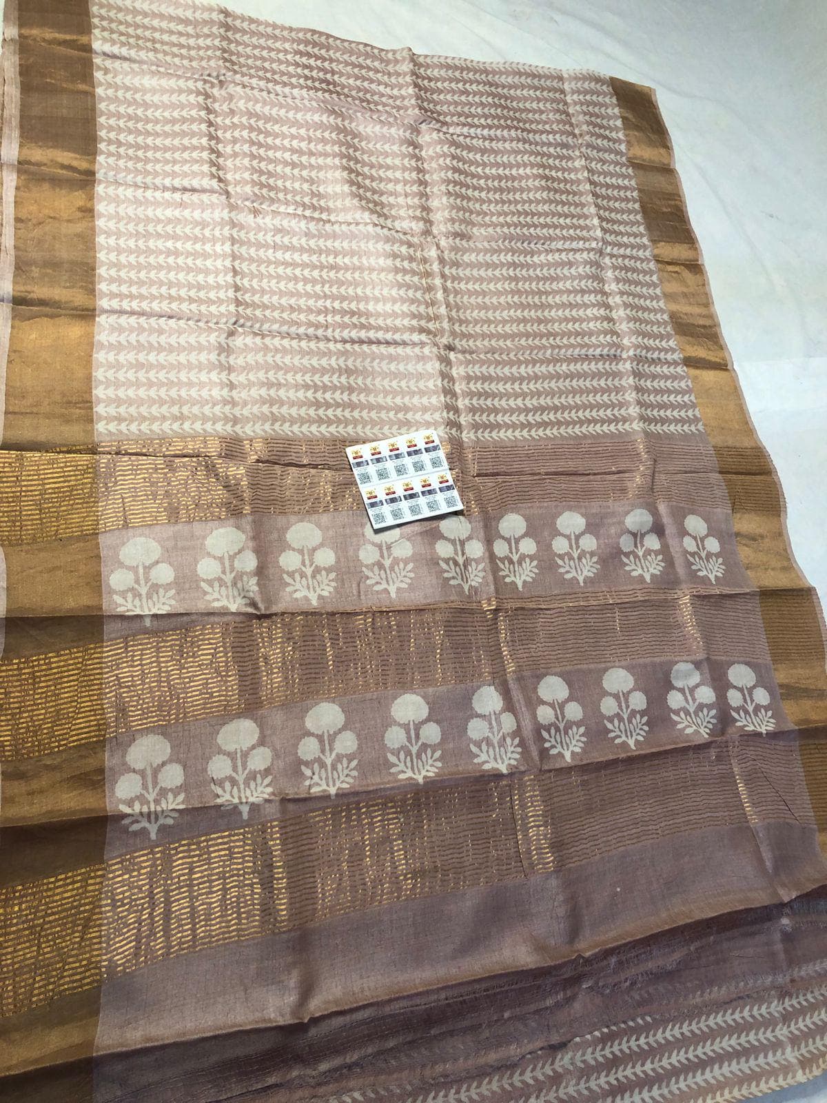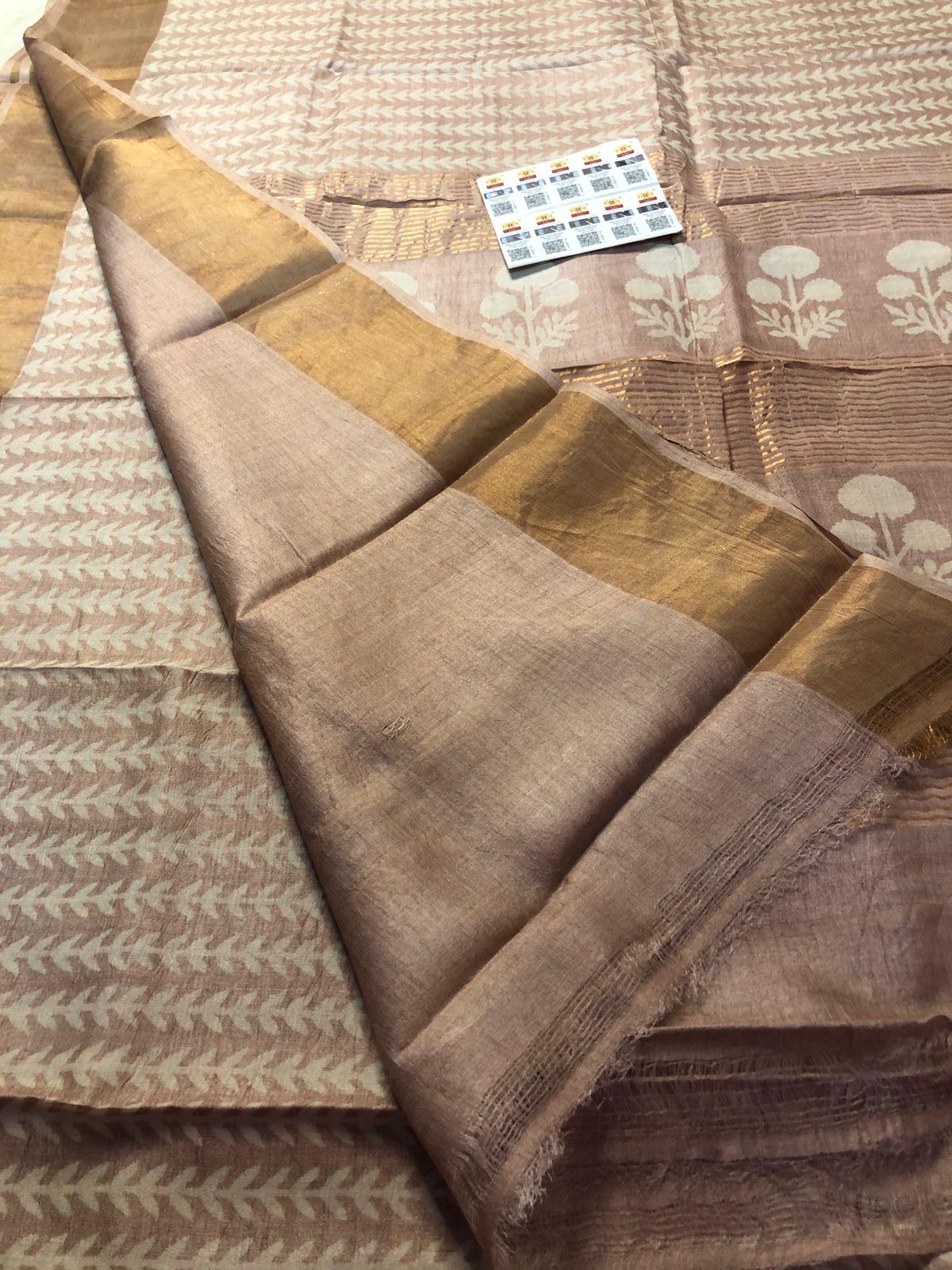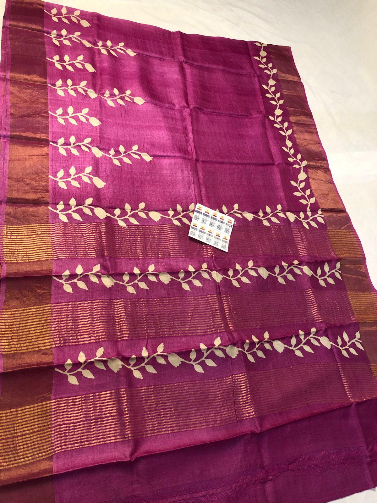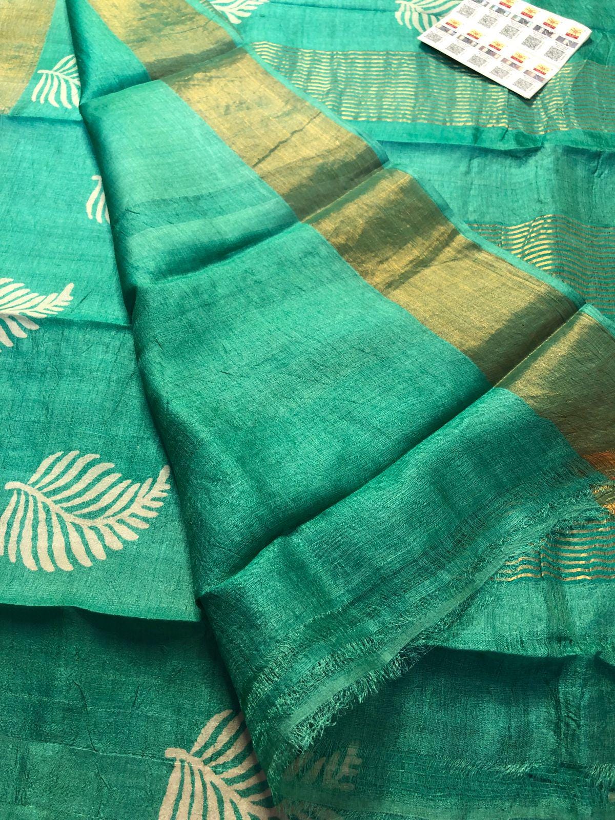 Handloom Tussar Silk Saree, Zari Border, Hand-Painted Floral Design