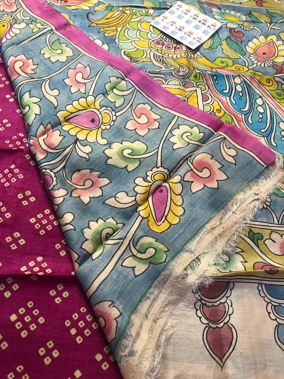 Pure Premium Tussar Hand pen kalamkari stitch with block printed boota in the body