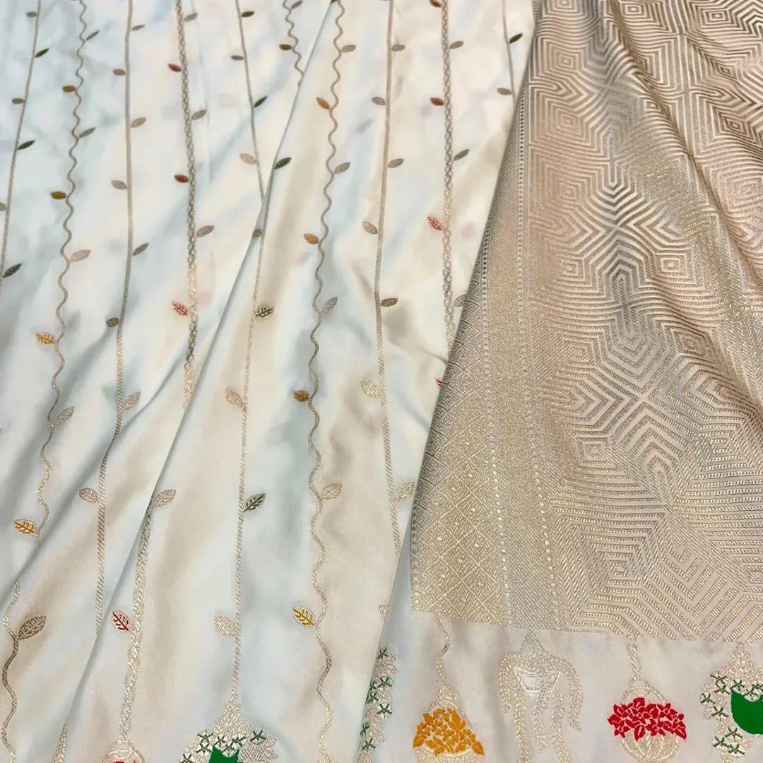 Experience the luxury of Mashru katan Silk, adorned with exquisite handloom prints and a stunning organic banaras silk weave. This saree is a perfect fusion of heritage and contemporary elegance, making it ideal for weddings, festive occasions, and grand celebrations. A timeless masterpiece for your ethnic collection!