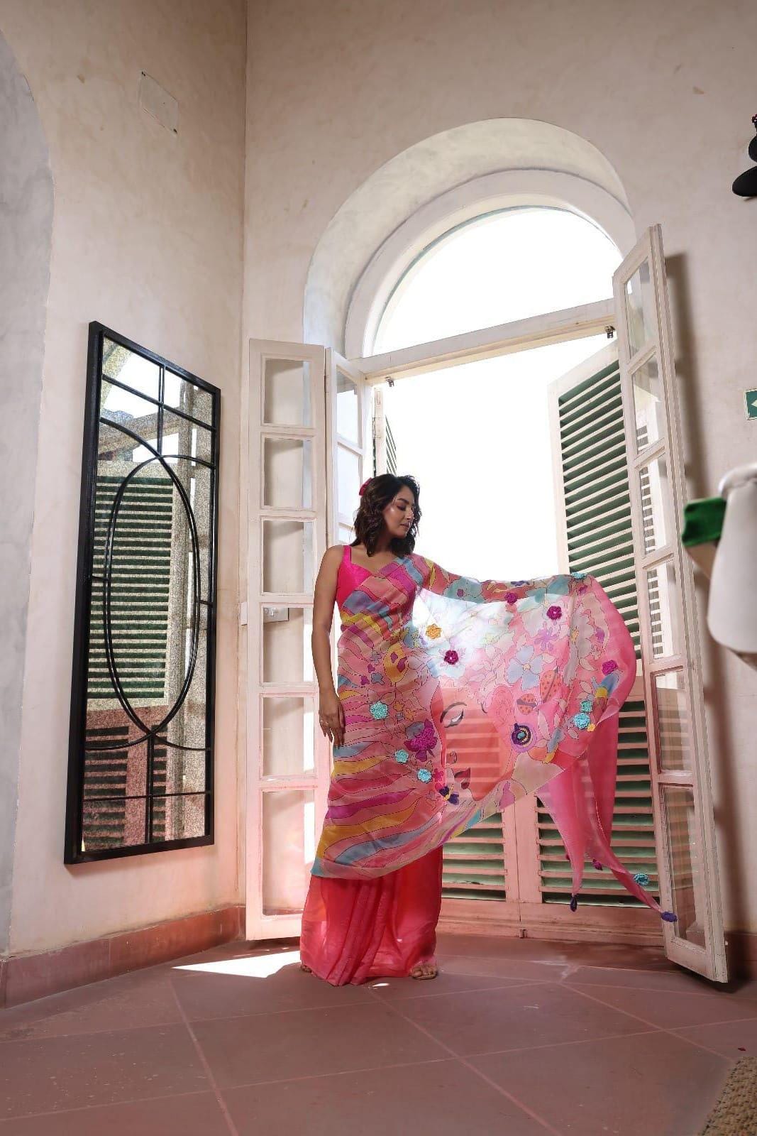 Experience the luxury of organza hand drawn Saree, we do custom hand drawn Sarees as well, adorned with exquisite handloom prints and intricate work. This saree is a perfect fusion of heritage and contemporary elegance, making it ideal for weddings, festive occasions, and grand celebrations. A timeless masterpiece for your ethnic collection!