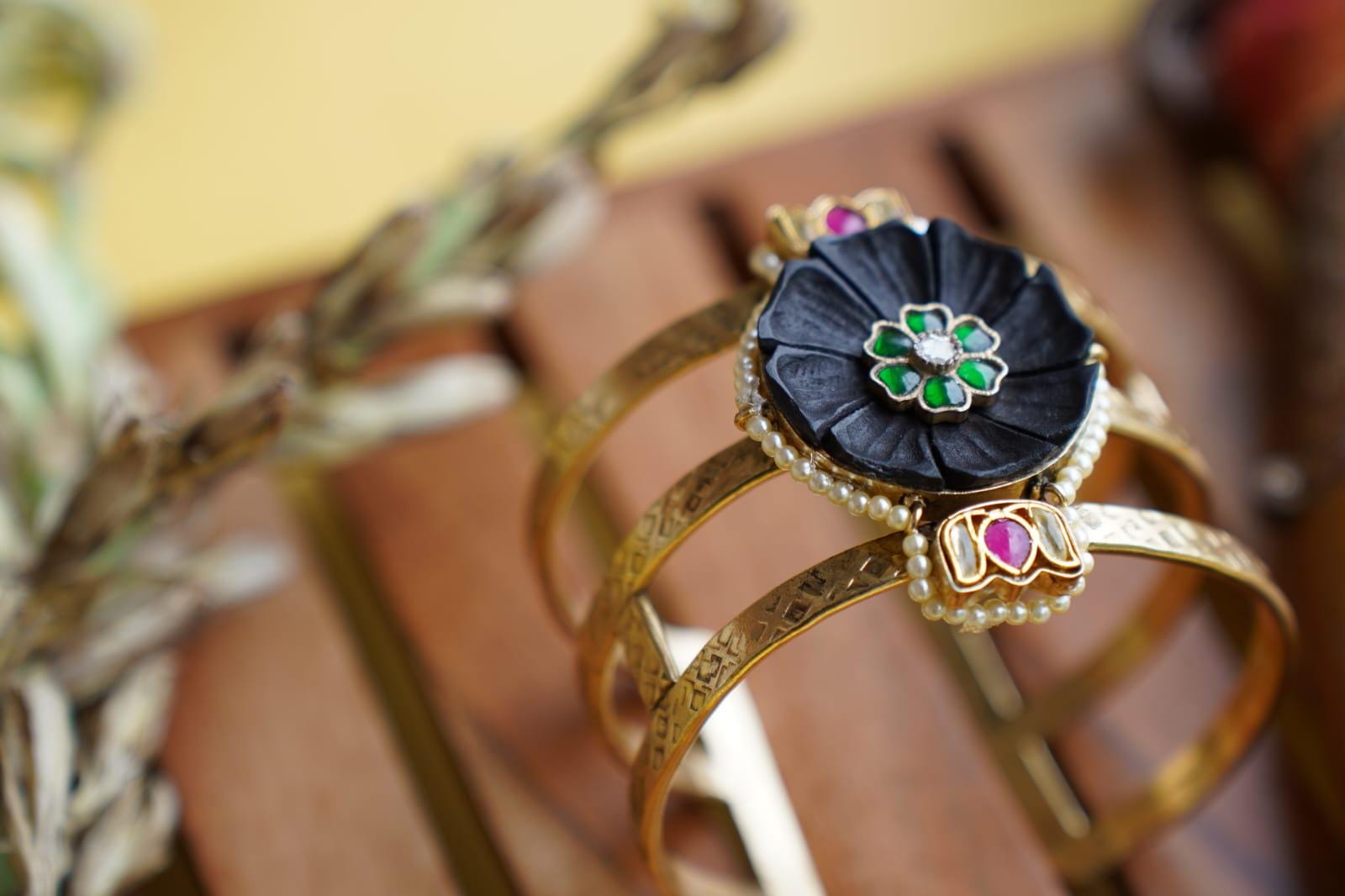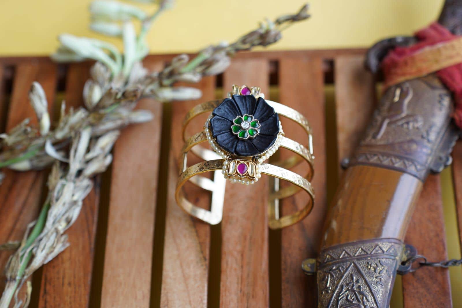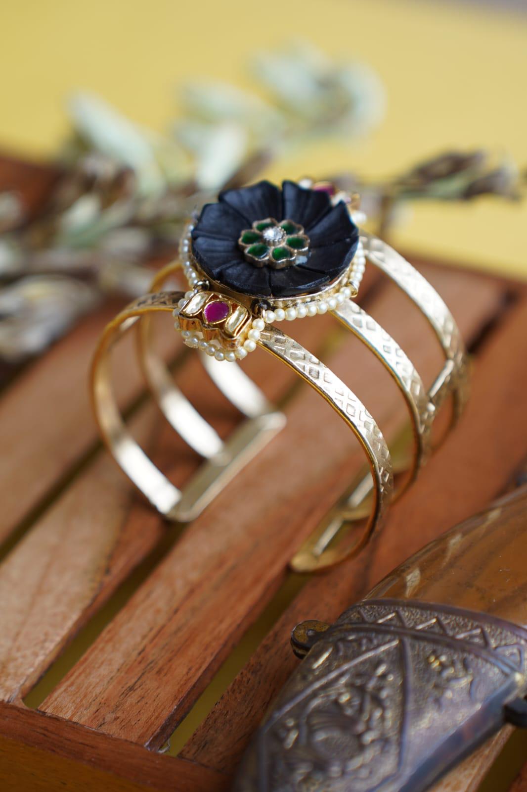 Kundan Bracelet: Boho Temple Hand Kada - Indian Gold-Tone Bangle