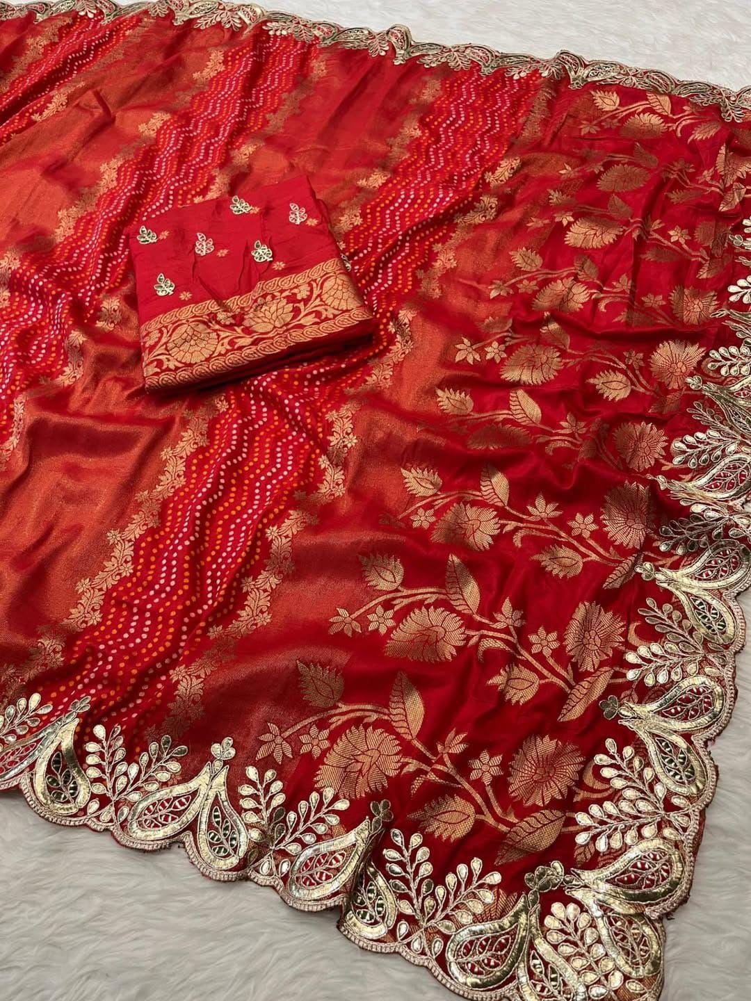 Bandhej Tissue Meenakari Saree: Varanasi Handloom Weaving, Gota Work Border