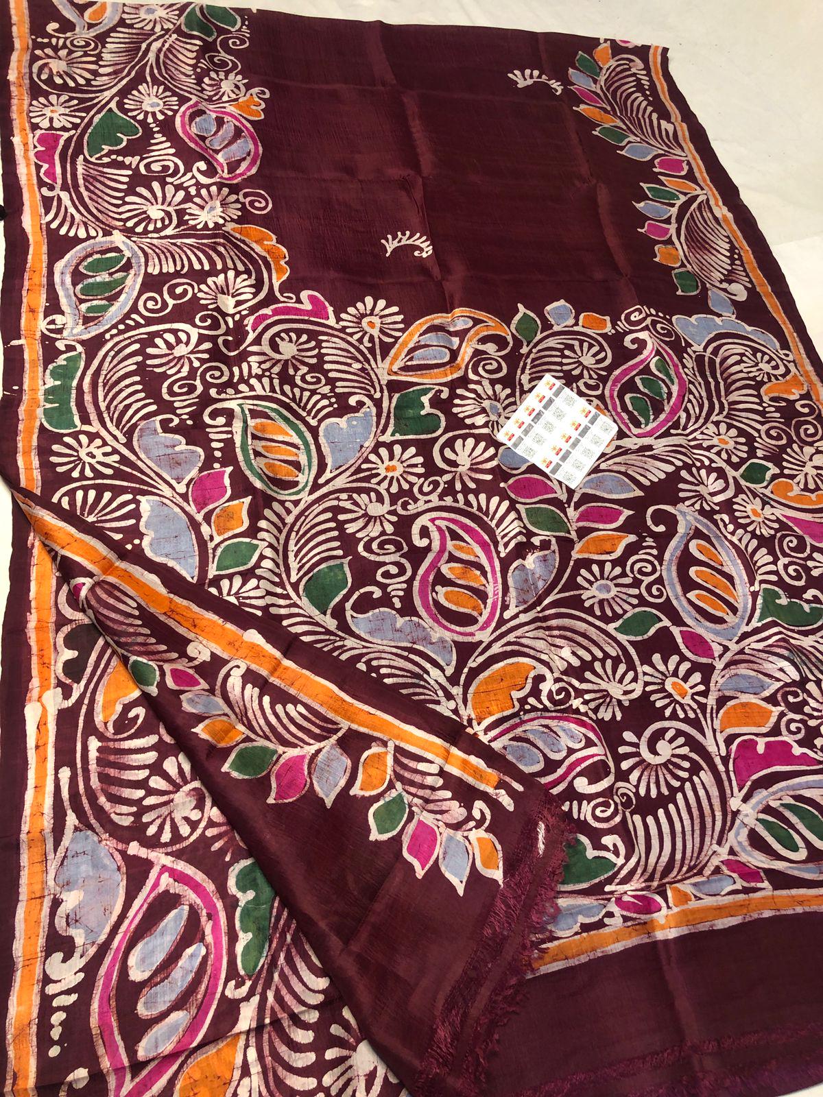Handloom Muga Tussar Silk Saree: Kalamkari Flower Print Wedding Saree