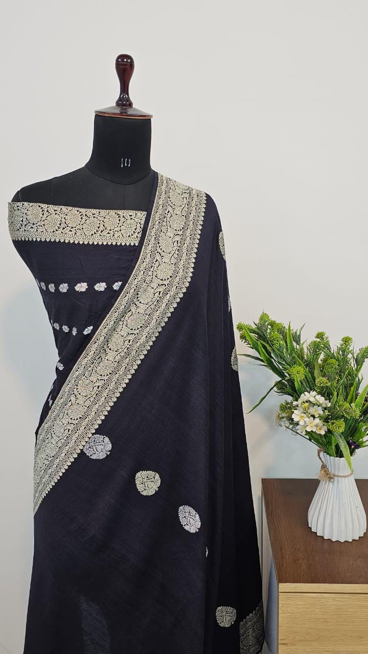 Experience the luxury of khaddi georgette chiffon, adorned with exquisite handloom prints and a stunning organic banaras silk weave. This saree is a perfect fusion of heritage and contemporary elegance, making it ideal for weddings, festive occasions, and grand celebrations. A timeless masterpiece for your ethnic collection!