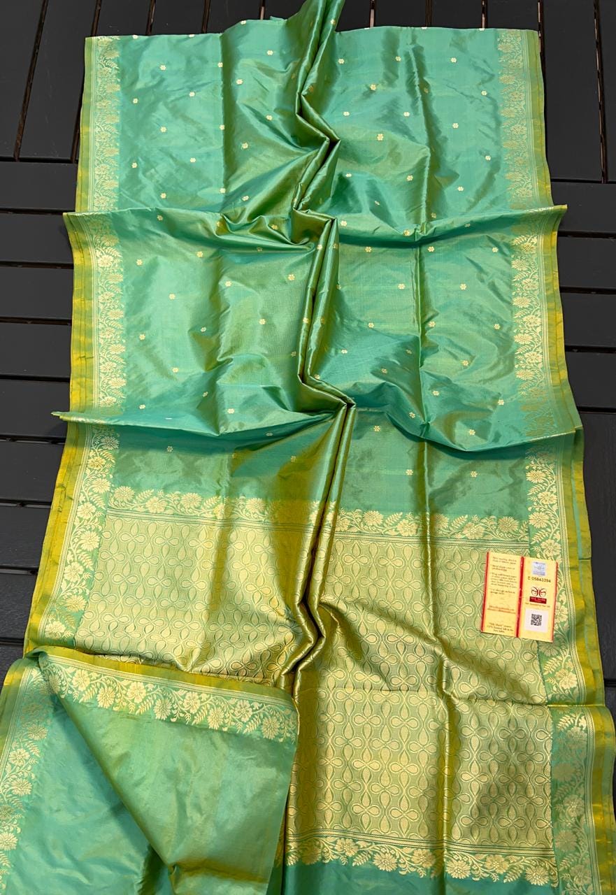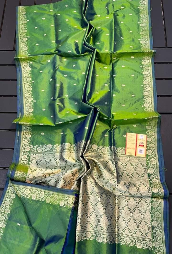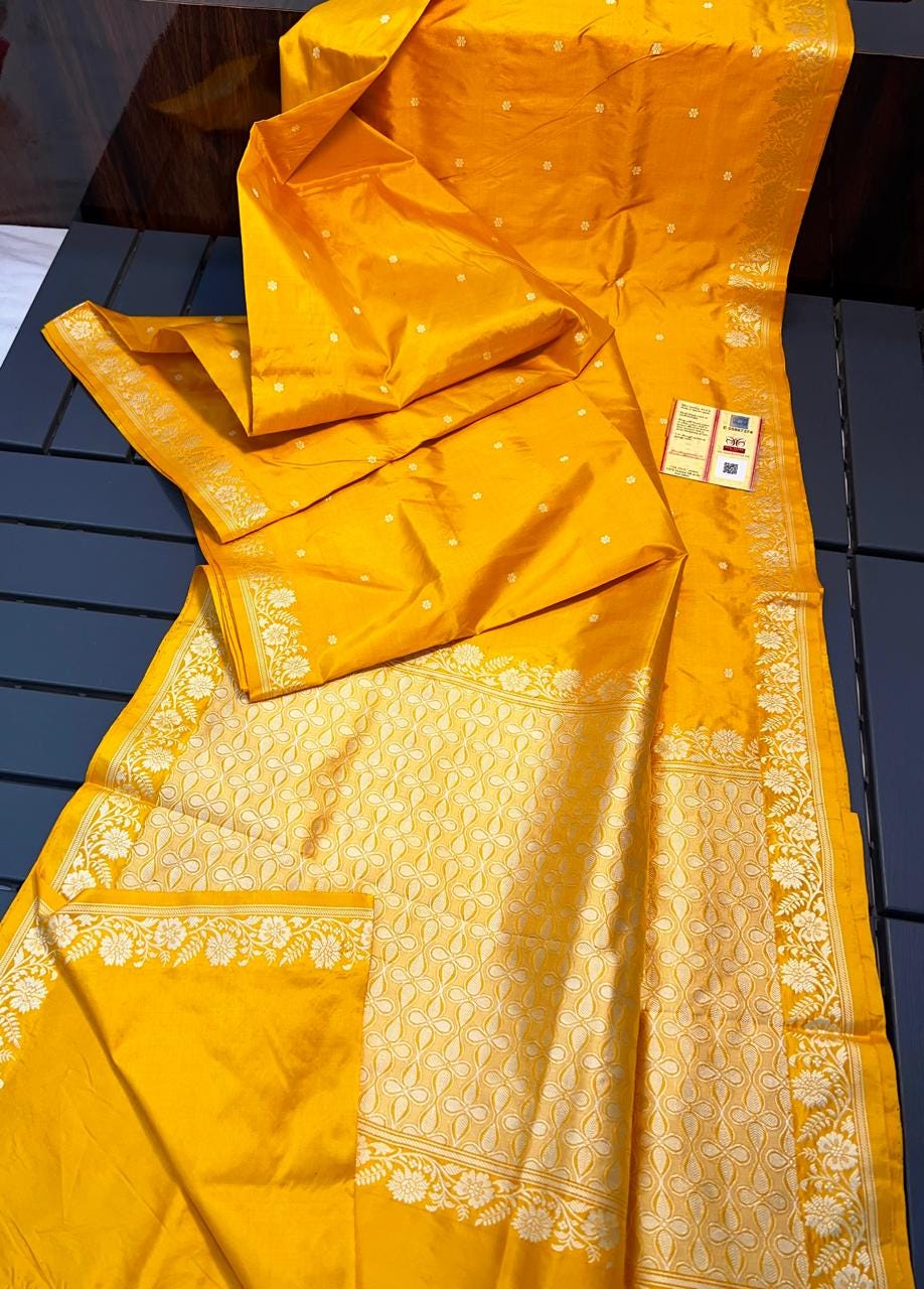 Experience the luxury of katan Silk, adorned with exquisite handloom prints and a stunning organic banaras silk weave. This saree is a perfect fusion of heritage and contemporary elegance, making it ideal for weddings, festive occasions, and grand celebrations. A timeless masterpiece for your ethnic collection!