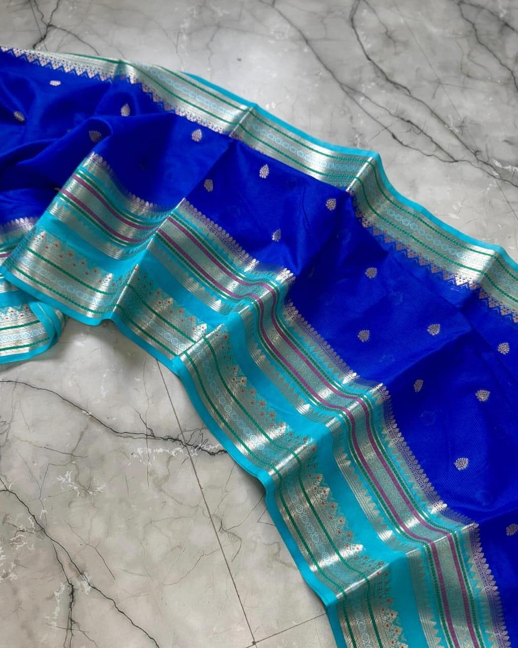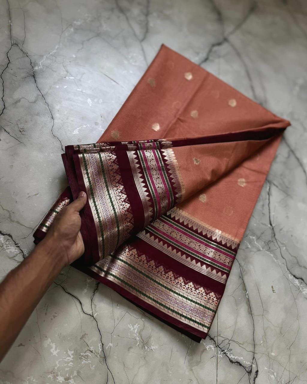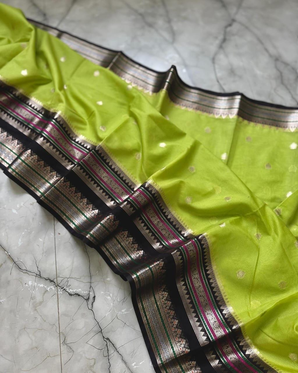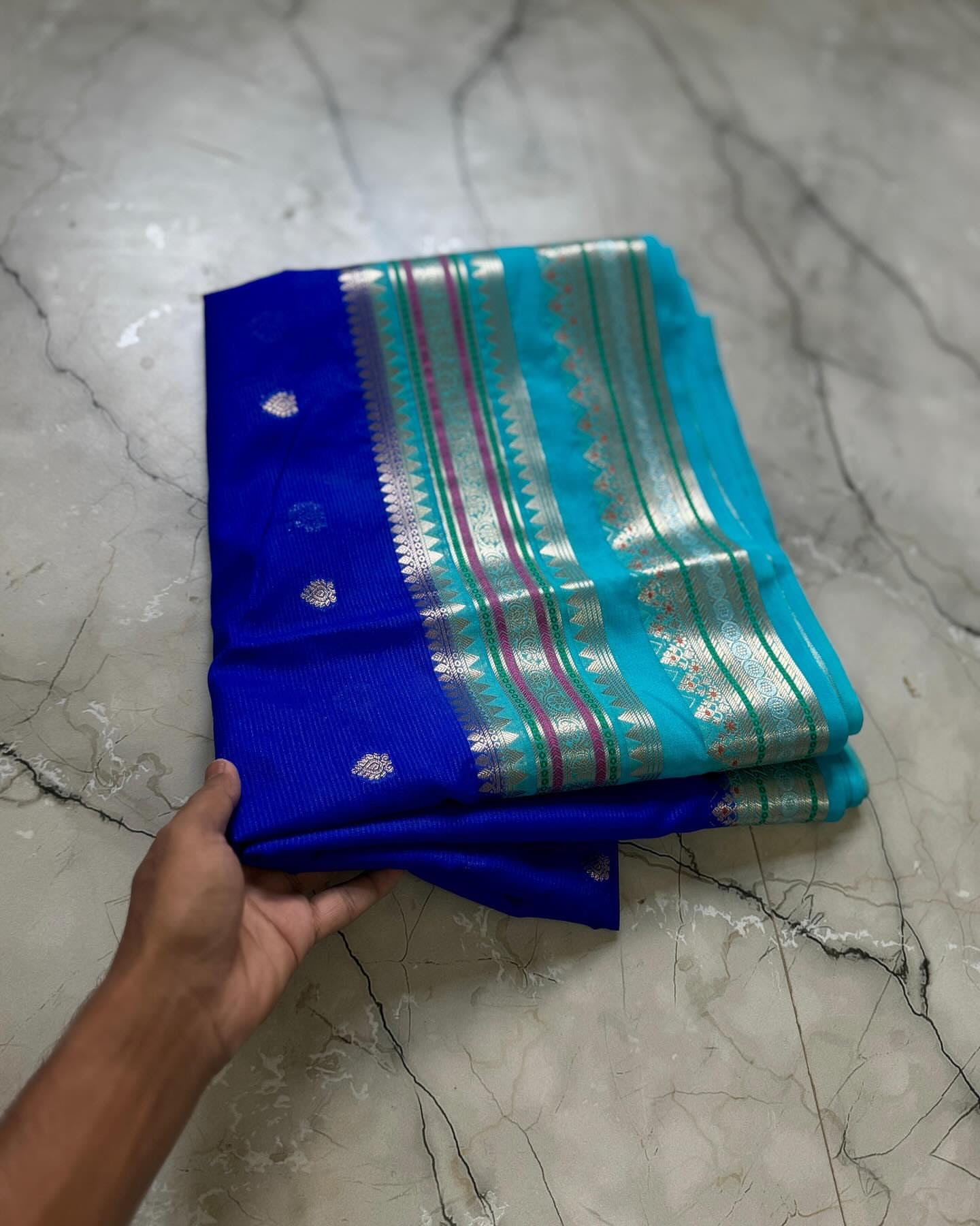Experience the luxury of khaddi georgette chiffon, adorned with exquisite handloom prints and a stunning organic banaras silk weave. This saree is a perfect fusion of heritage and contemporary elegance, making it ideal for weddings, festive occasions, and grand celebrations. A timeless masterpiece for your ethnic collection!