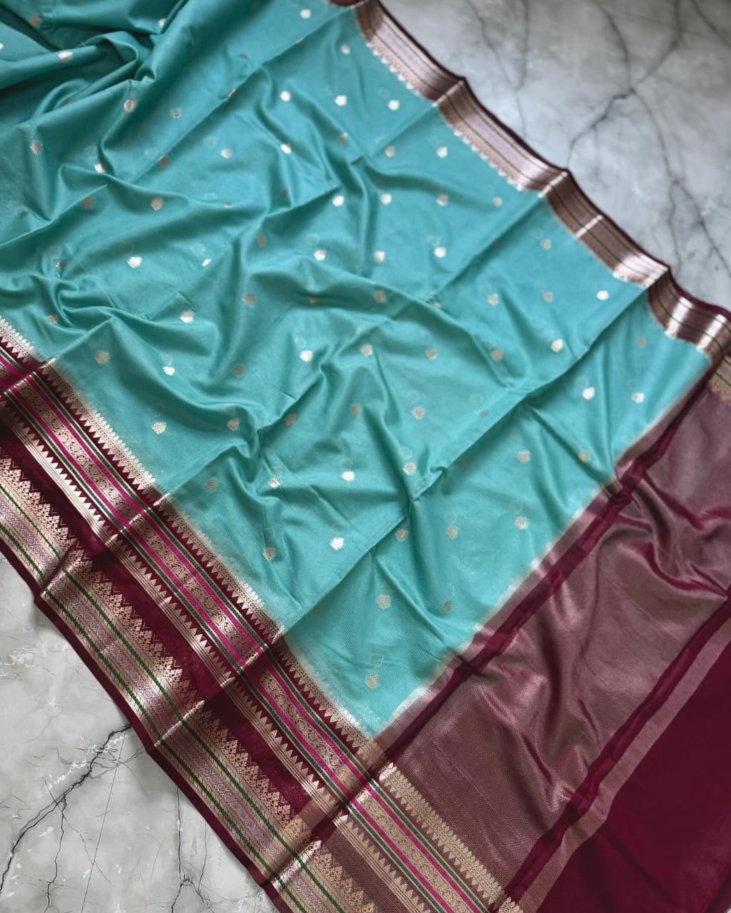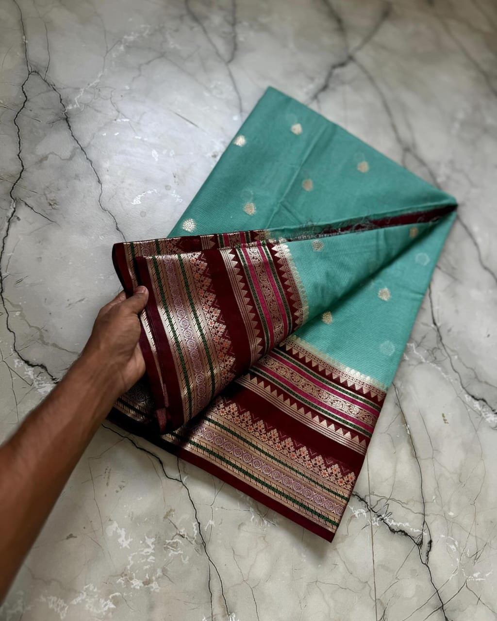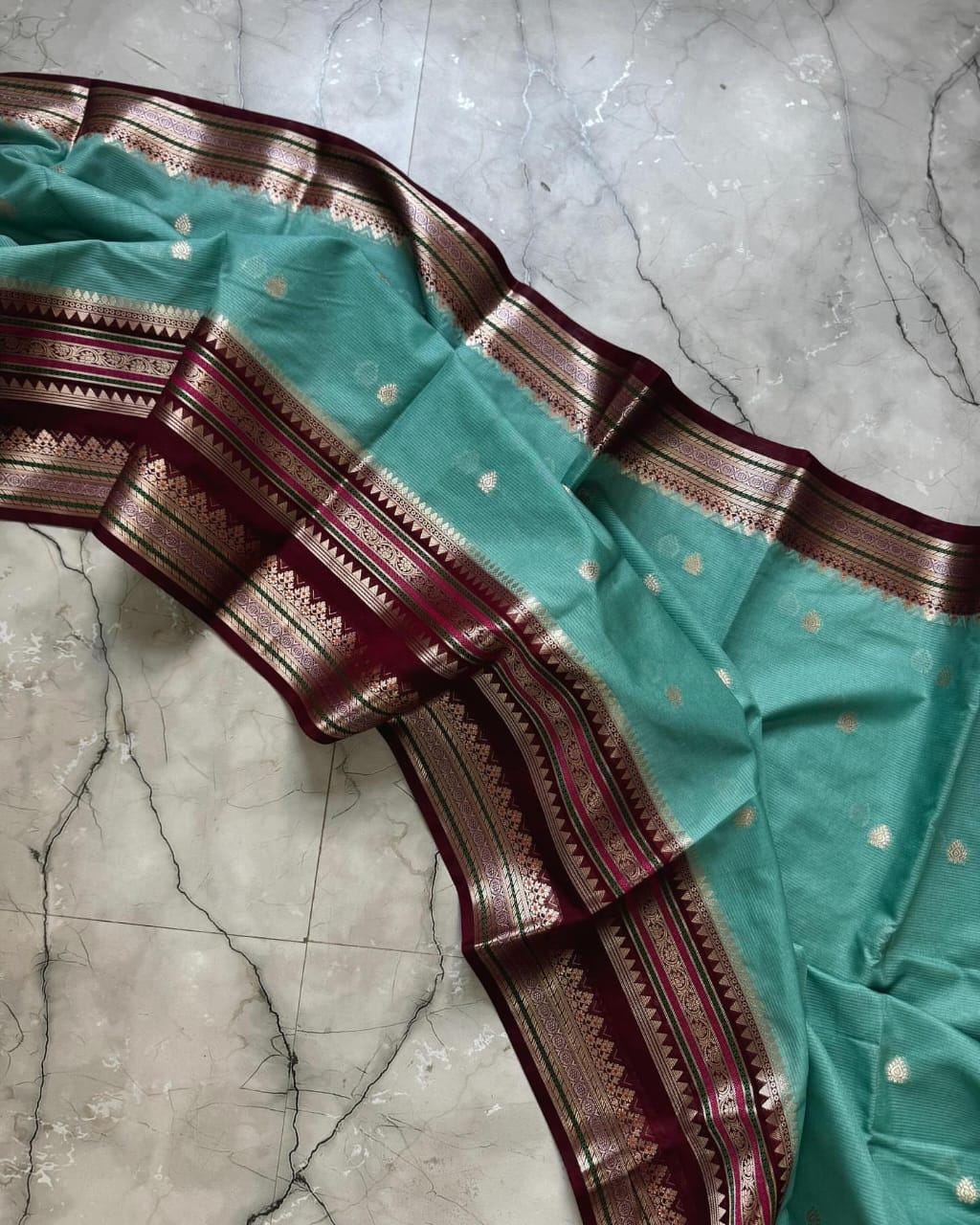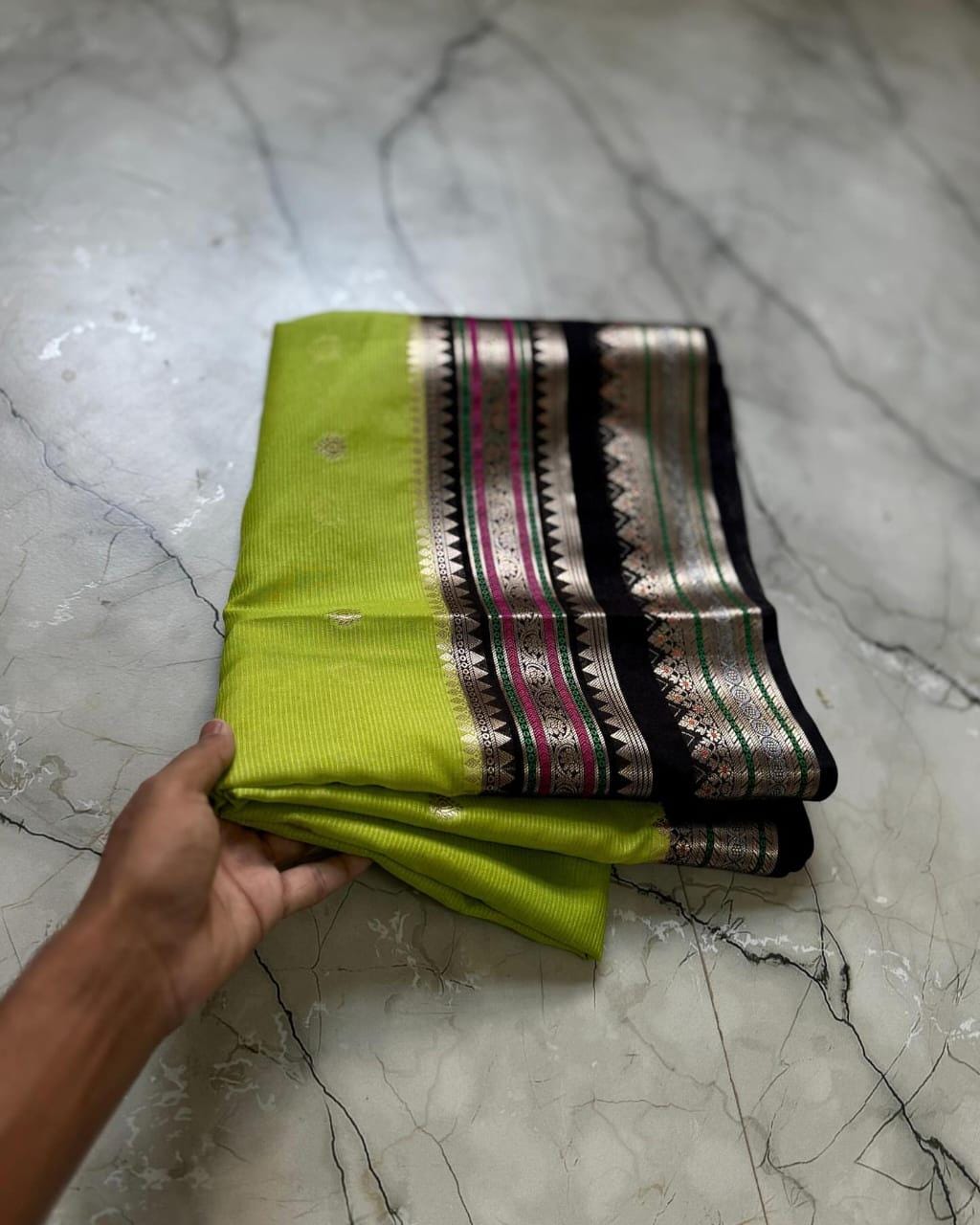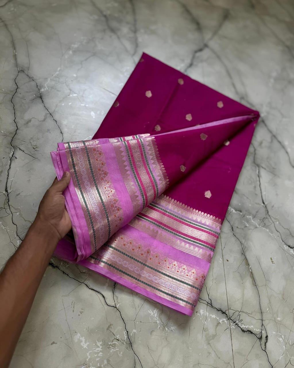 Experience the luxury of khaddi georgette chiffon, adorned with exquisite handloom prints and a stunning organic banaras silk weave. This saree is a perfect fusion of heritage and contemporary elegance, making it ideal for weddings, festive occasions, and grand celebrations. A timeless masterpiece for your ethnic collection!