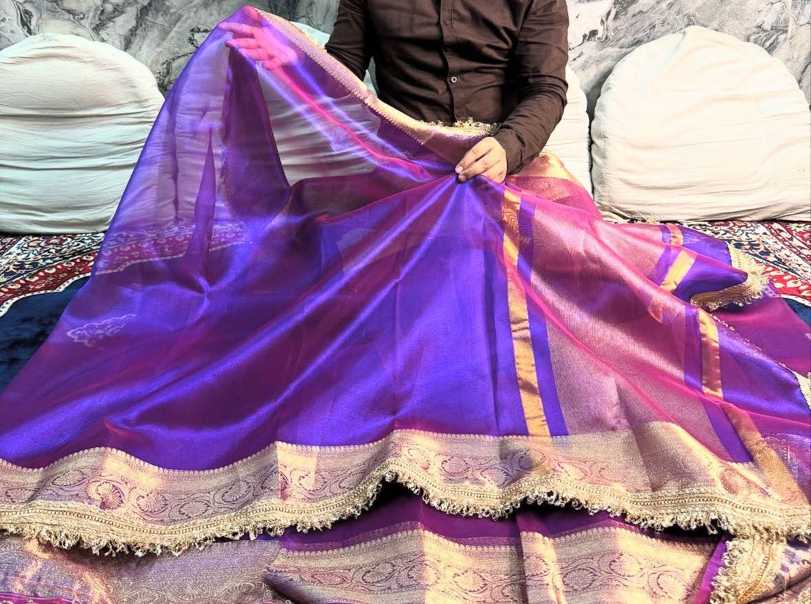 Experience the luxury of khaddi katan tissue Silk, adorned with exquisite handloom prints and a stunning organic banaras silk weave. This saree is a perfect fusion of heritage and contemporary elegance, making it ideal for weddings, festive occasions, and grand celebrations. A timeless masterpiece for your ethnic collection!