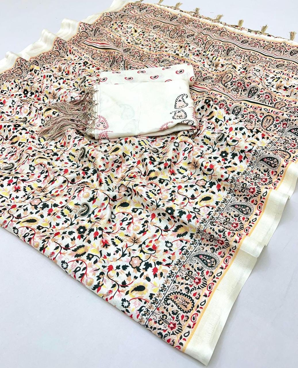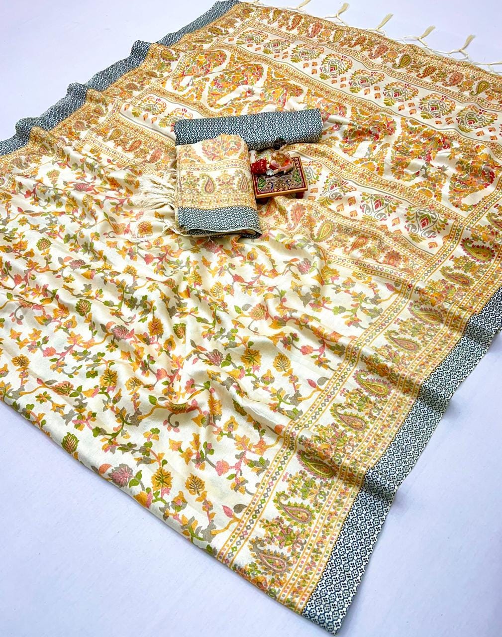 Experience the luxury of soft pashmina Silk, adorned with exquisite pashmina print work and a stunning organic gaji silk weave. This saree is a perfect fusion of heritage and contemporary elegance, making it ideal for weddings, festive occasions, and grand celebrations. A timeless masterpiece for your ethnic collection!