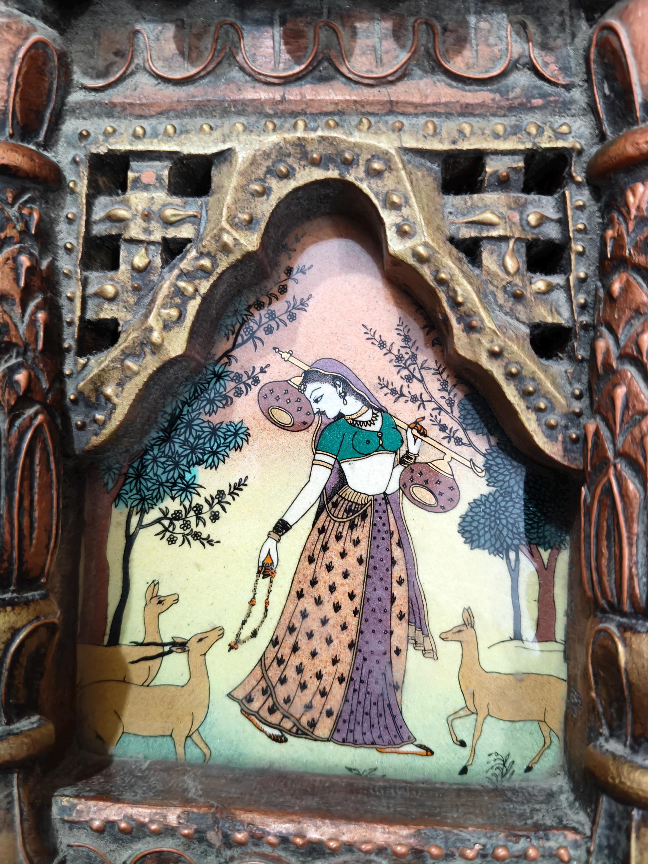 Bring home a unique piece of traditional Indian artwork made using real crushed semi-precious stones. This handcrafted gemstone painting features a beautiful Rajasthani woman playing a sitar, rendered with delicate detailing, soft shimmer, and rich natural colors.