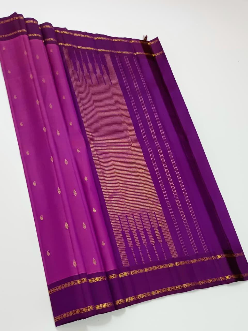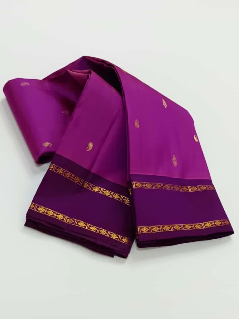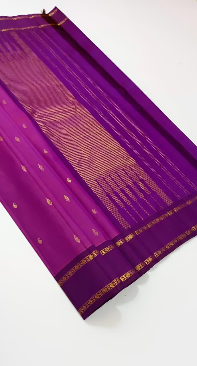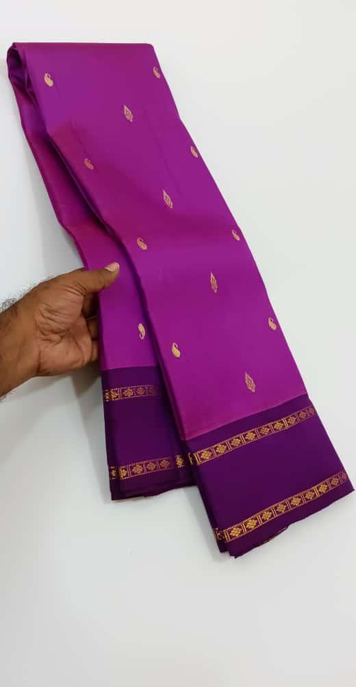 Drape yourself in timeless elegance with this 2 Gram Gold Kancheepuram Handloom Silk Saree, a masterpiece woven by skilled artisans of South India. Crafted from rich silk and adorned with pure zari work, this saree radiates regal charm in its vibrant magenta and golden weave. The intricate motifs and traditional border make it a perfect choice for weddings, bridal wear, temple occasions, and festive celebrations.