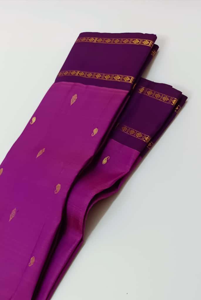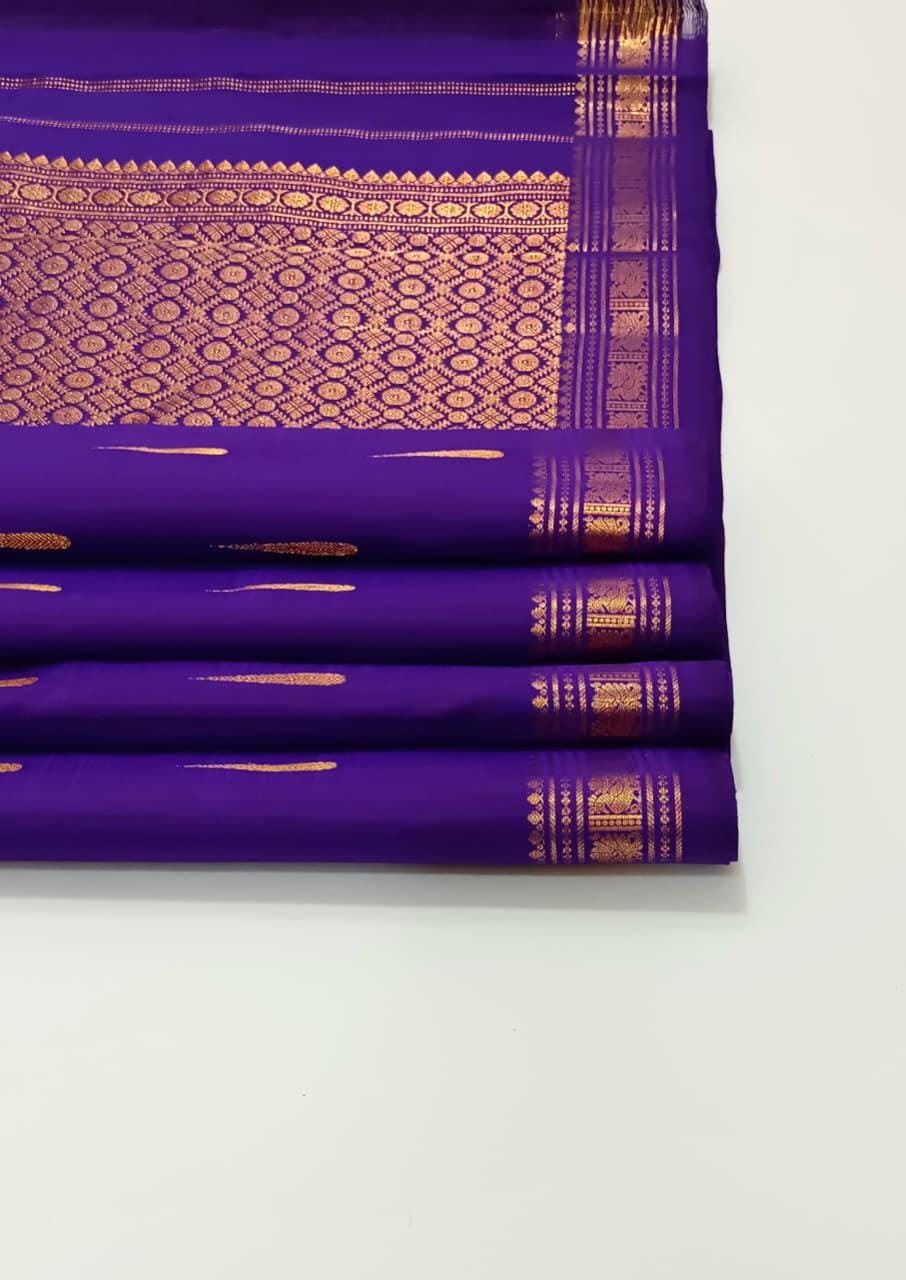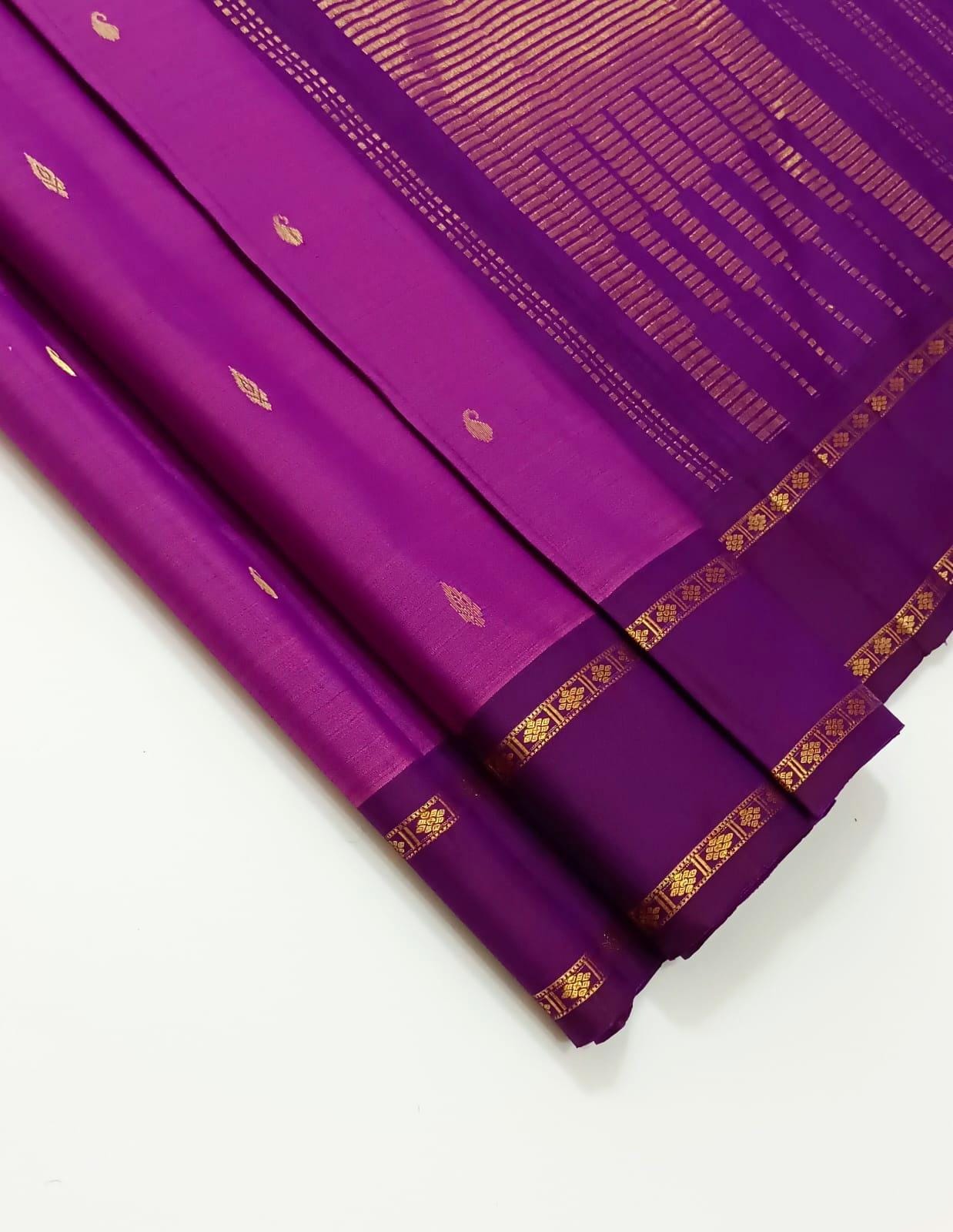 Drape yourself in timeless elegance with this 2 Gram Gold Kancheepuram Handloom Silk Saree, a masterpiece woven by skilled artisans of South India. Crafted from rich silk and adorned with pure zari work, this saree radiates regal charm in its vibrant magenta and golden weave. The intricate motifs and traditional border make it a perfect choice for weddings, bridal wear, temple occasions, and festive celebrations.