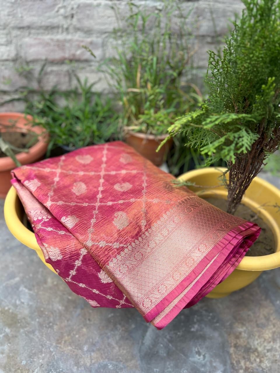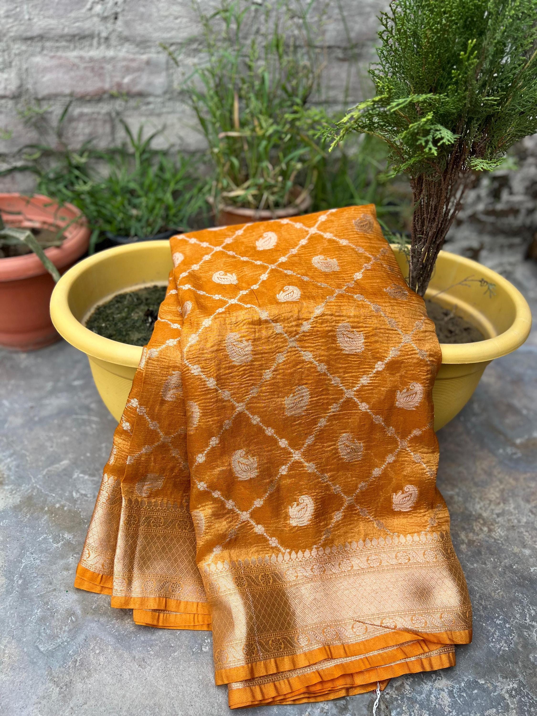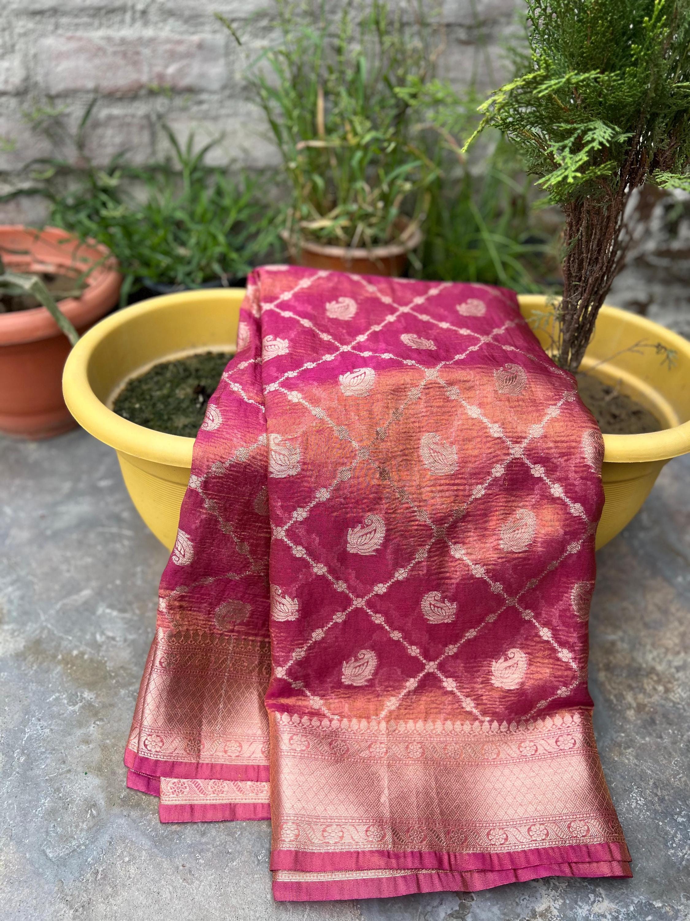 Experience the luxury of khaddi katan tissue Silk, adorned with exquisite handloom prints and a stunning organic banaras silk weave. This saree is a perfect fusion of heritage and contemporary elegance, making it ideal for weddings, festive occasions, and grand celebrations. A timeless masterpiece for your ethnic collection!