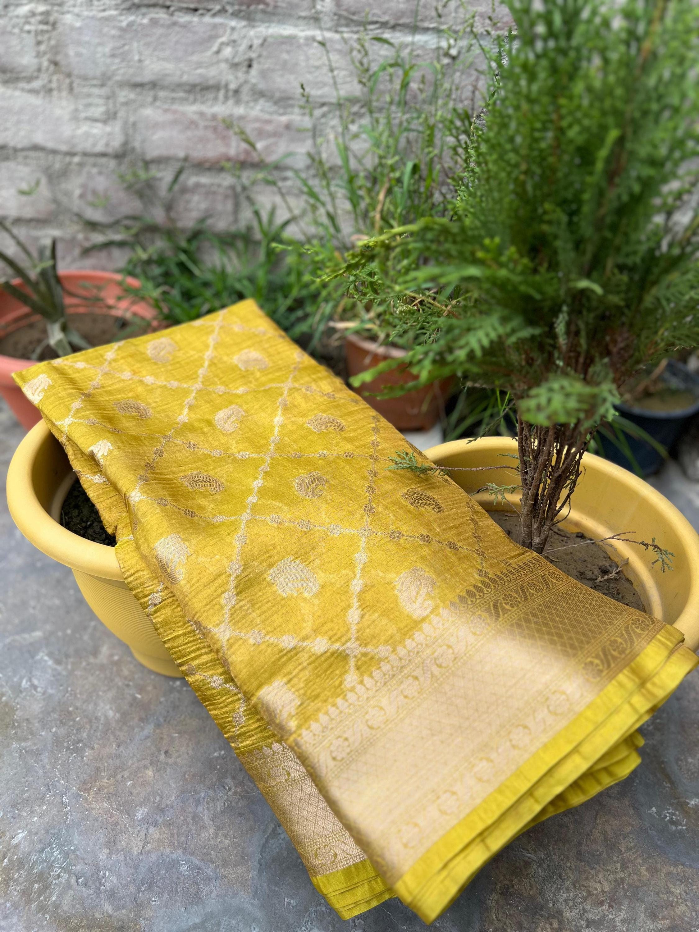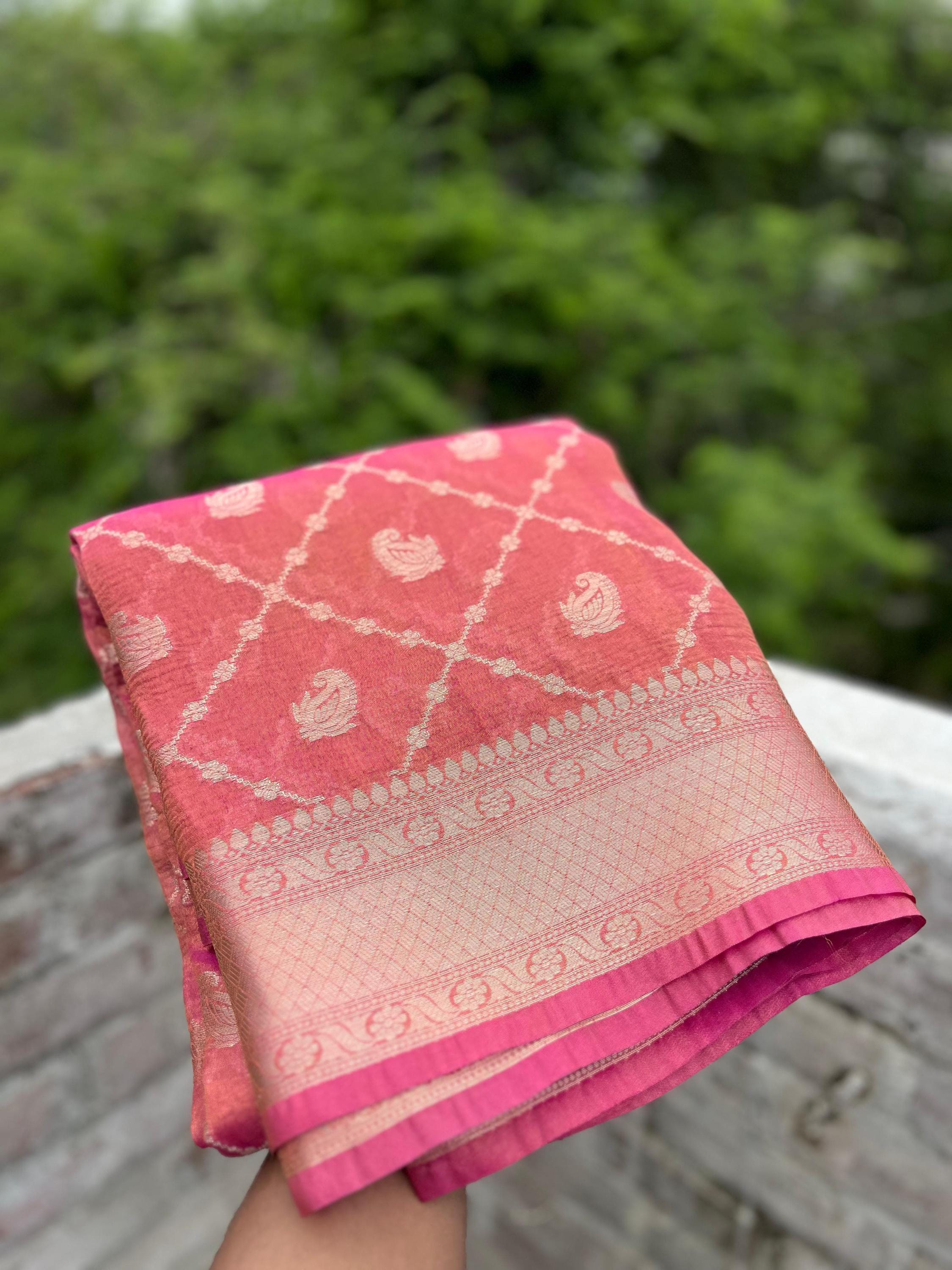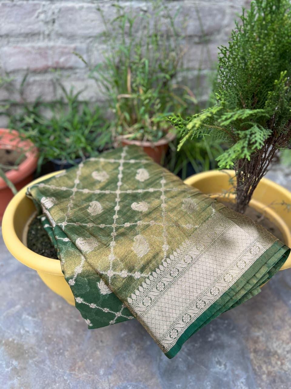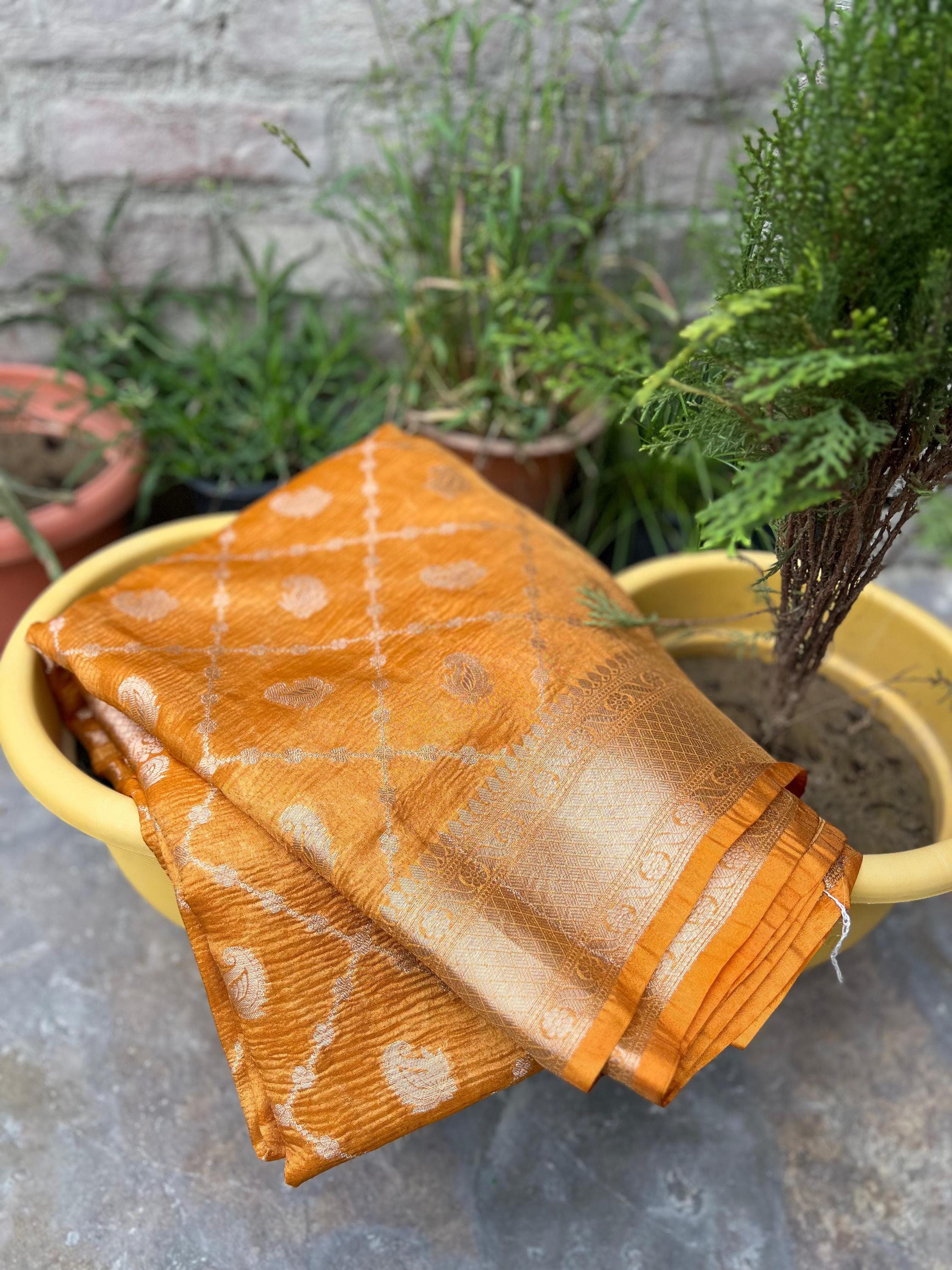 Experience the luxury of khaddi katan tissue Silk, adorned with exquisite handloom prints and a stunning organic banaras silk weave. This saree is a perfect fusion of heritage and contemporary elegance, making it ideal for weddings, festive occasions, and grand celebrations. A timeless masterpiece for your ethnic collection!