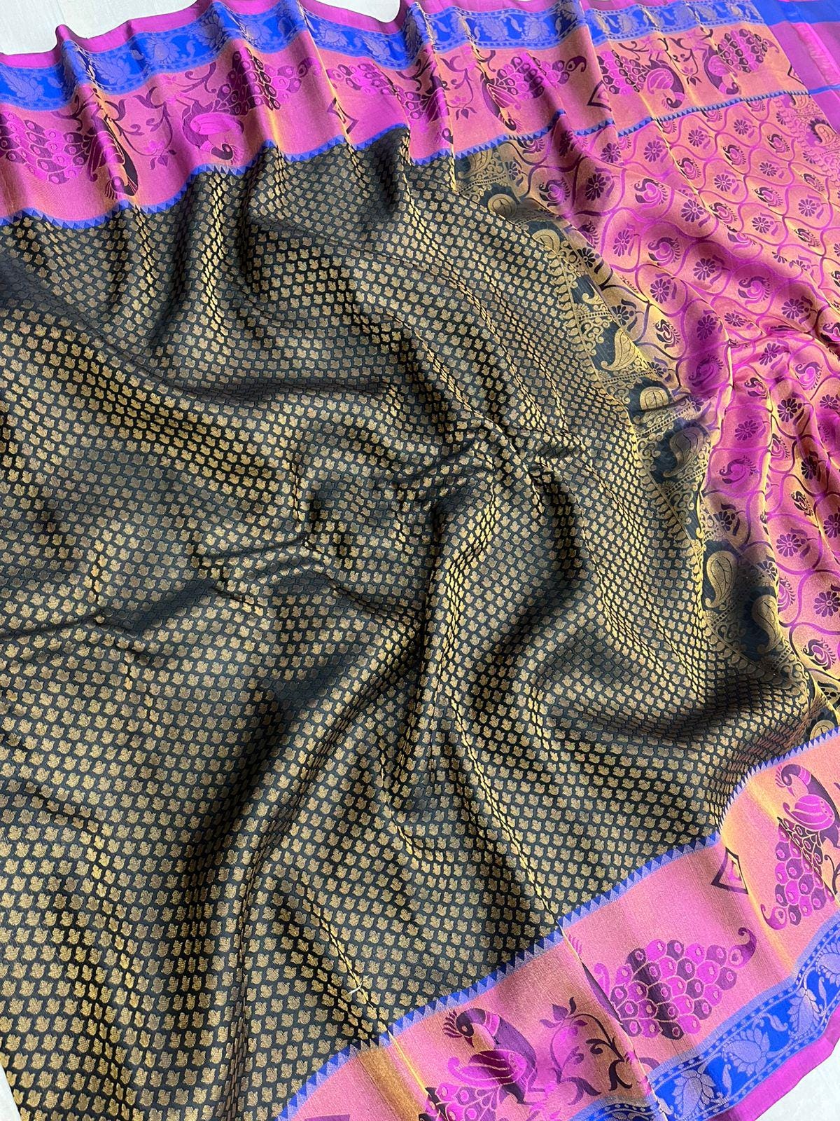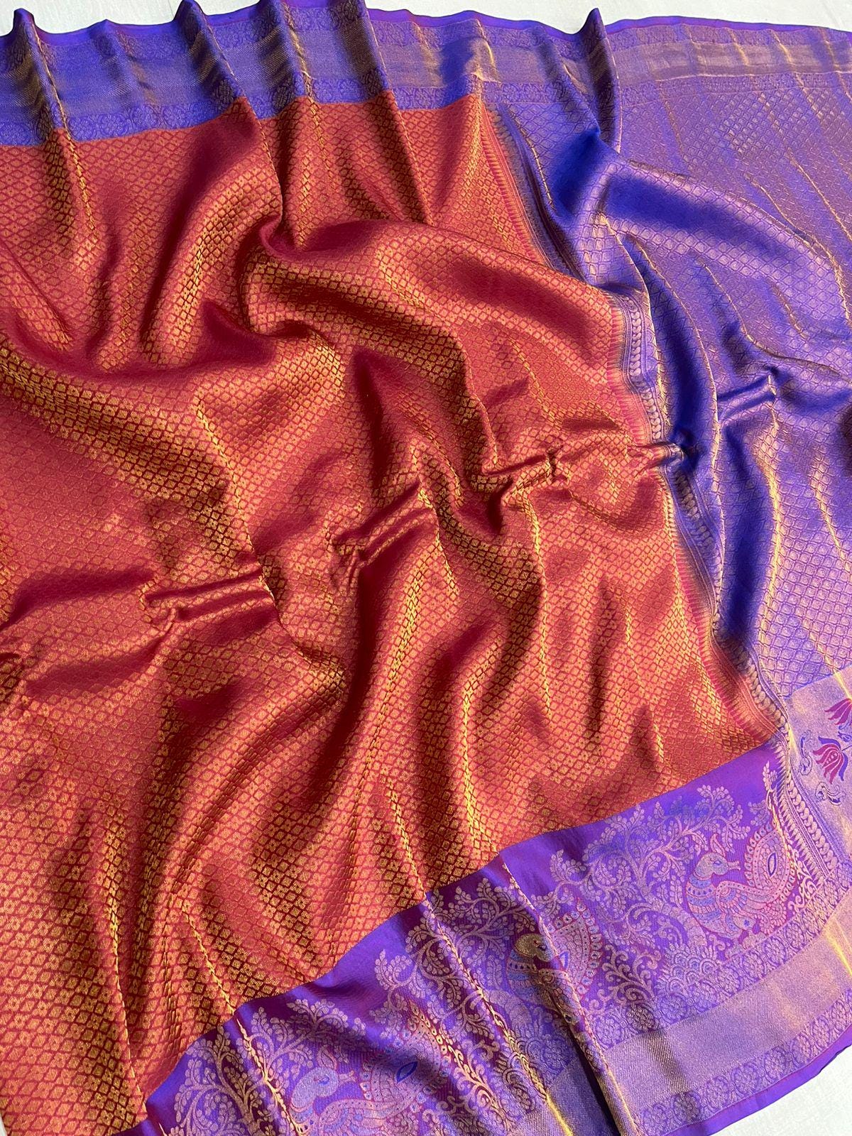 Drape yourself in timeless elegance with this gadwal Brocade saree, a masterpiece woven by skilled artisans of South India. Crafted from rich silk and adorned with pure zari work, this saree radiates regal charm in its vibrant magenta and golden weave. The intricate motifs and traditional border make it a perfect choice for weddings, bridal wear, temple occasions, and festive celebrations.