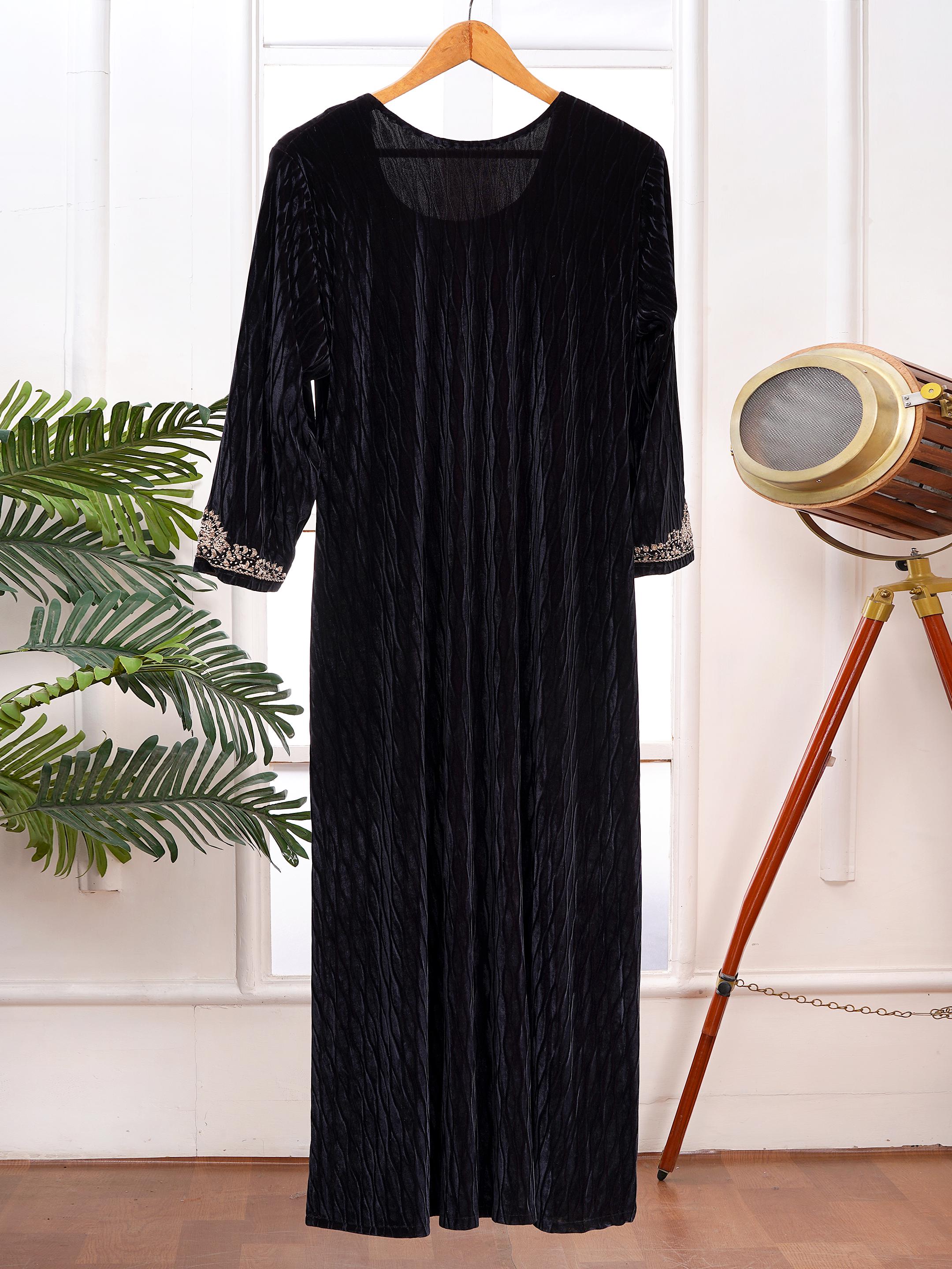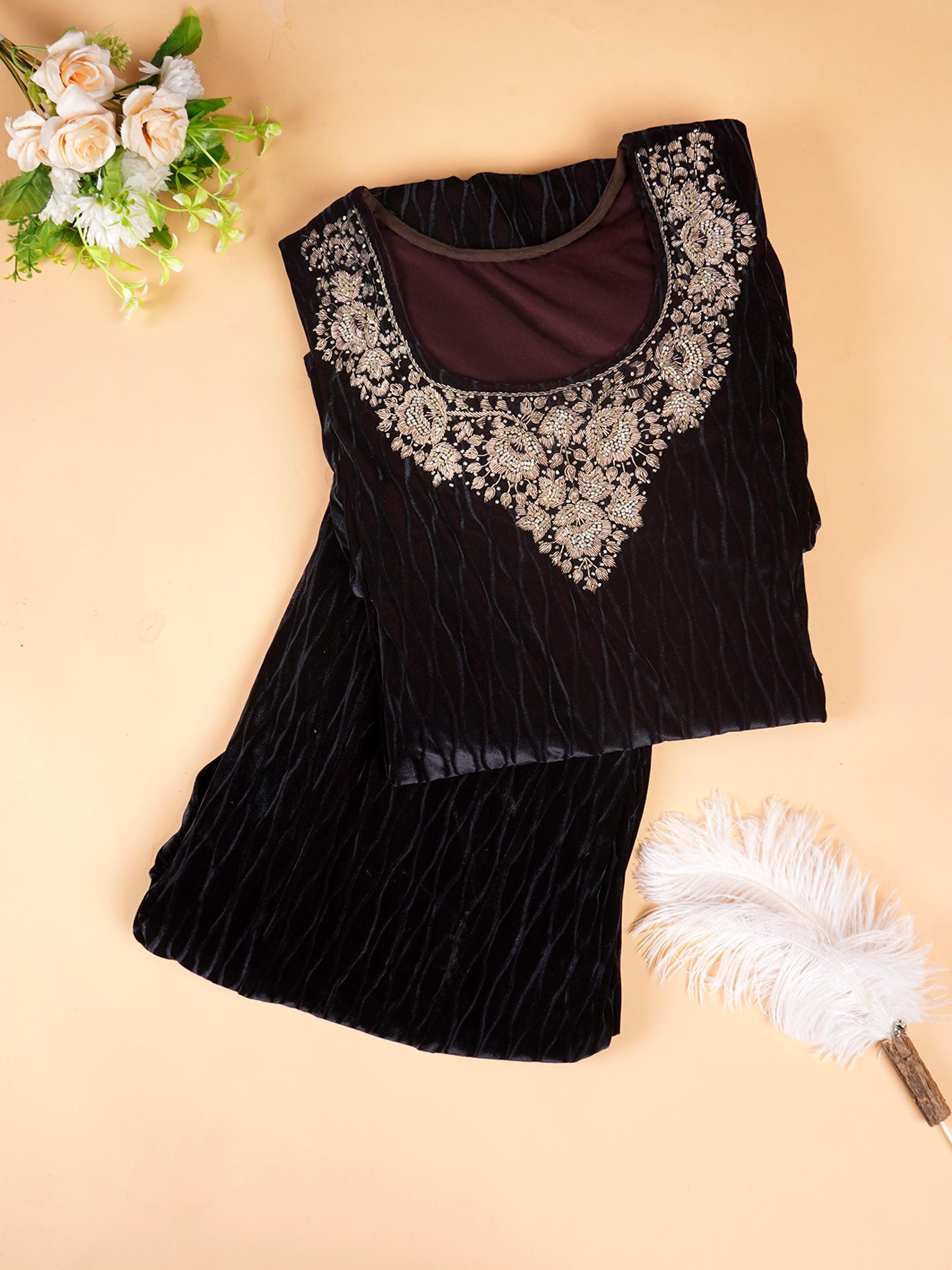 Elevate your wardrobe with this luxurious black velvet set adorned with intricate zardozi hand embroidery. Perfect for festive occasions, weddings, or special evenings, this set exudes elegance and sophistication. The rich velvet fabric provides a soft, comfortable feel, while the zardozi detailing adds a regal touch.