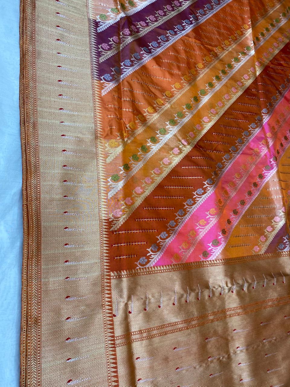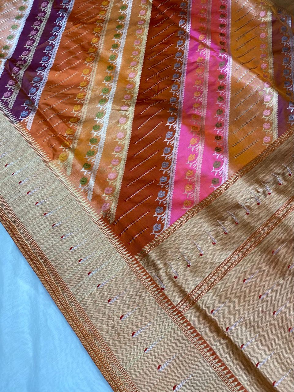 Experience the luxury of weaving Katan Silk, adorned with exquisite handloom Meenakari Weave and a stunning organic banaras silk weave. This saree is a perfect fusion of heritage and contemporary elegance, making it ideal for weddings, festive occasions, and grand celebrations. A timeless masterpiece for your ethnic collection!