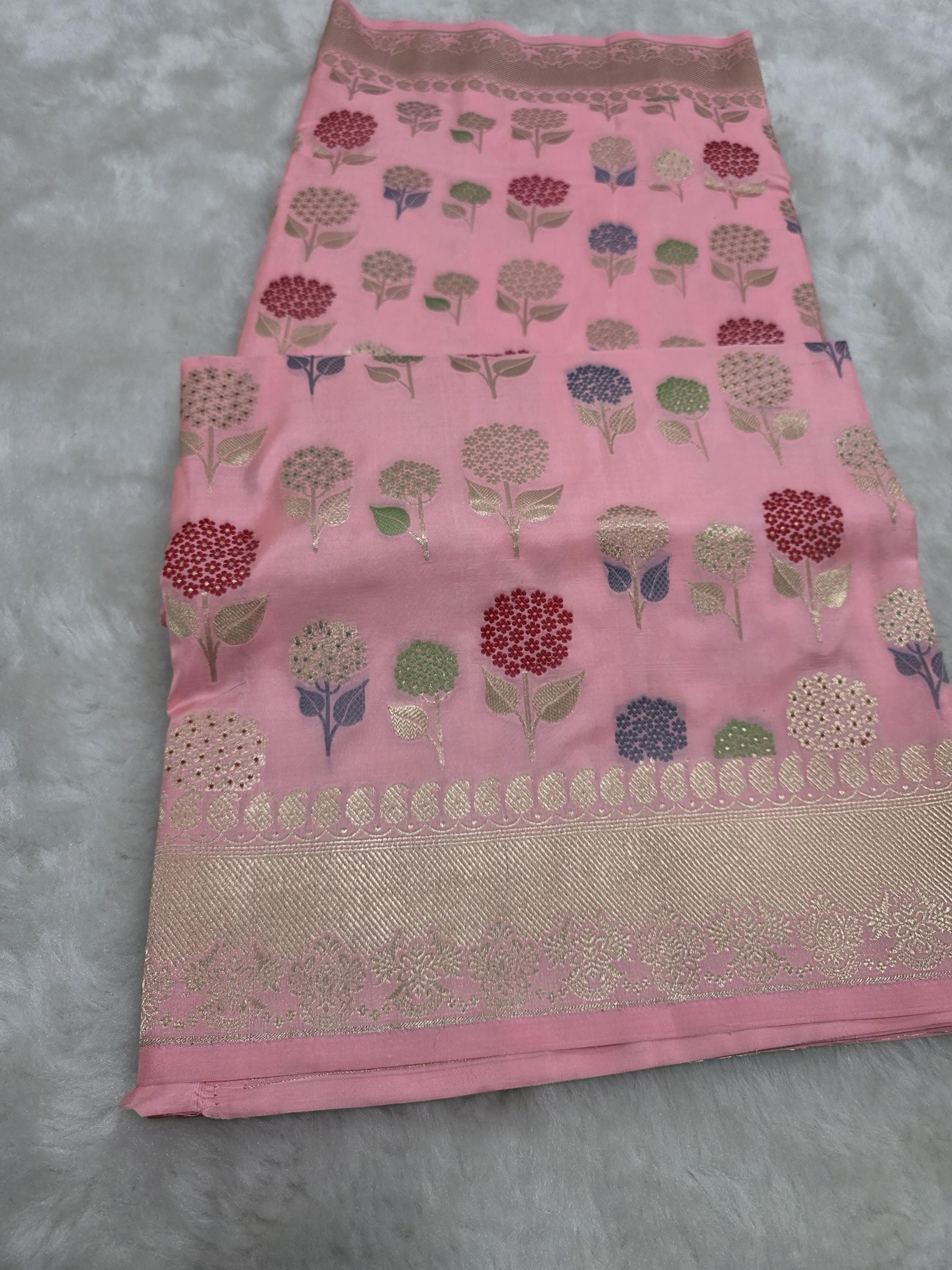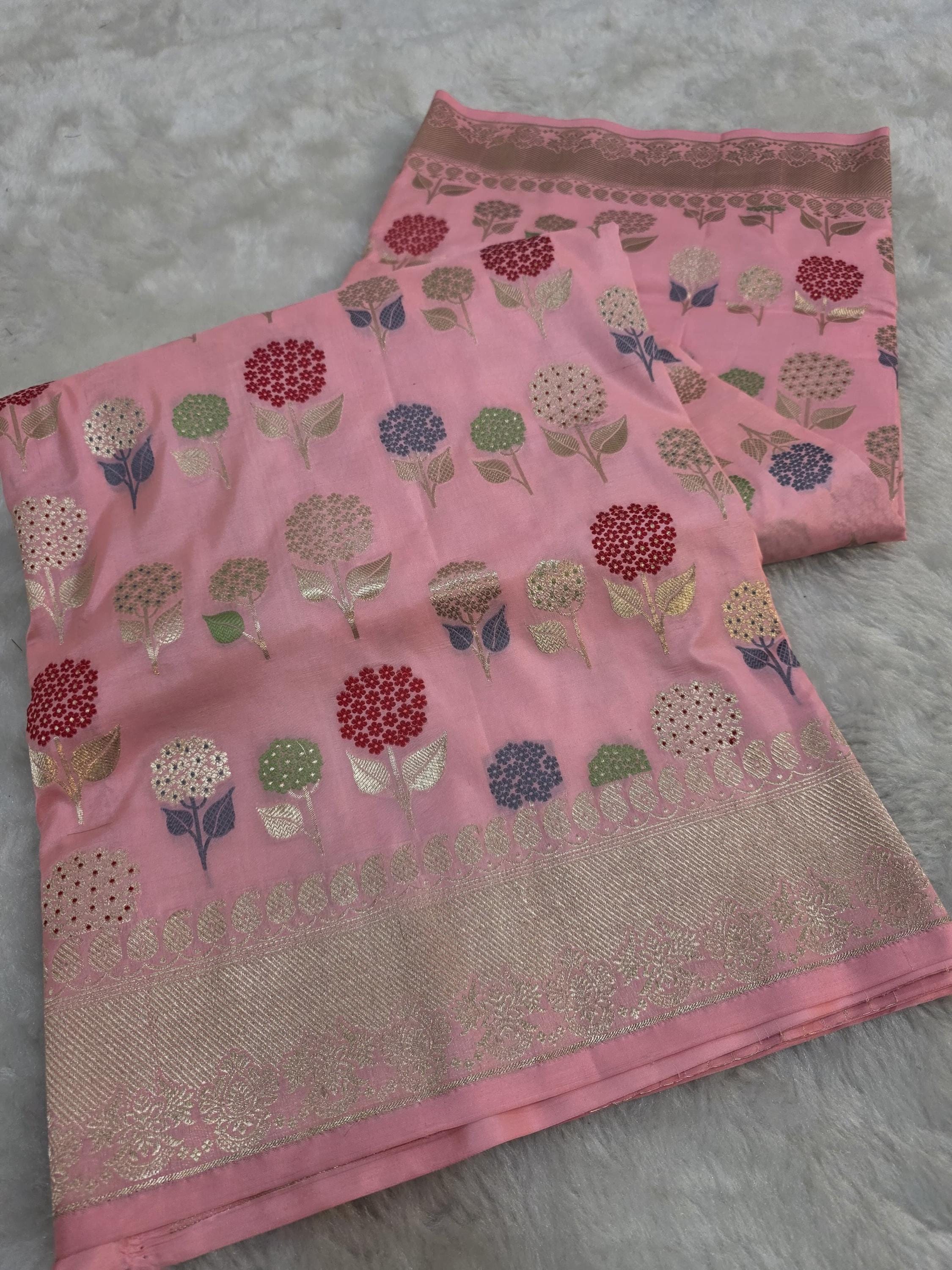 Experience the luxury of khaddi katan tissue Silk, adorned with exquisite handloom prints and a stunning organic banaras silk weave. This saree is a perfect fusion of heritage and contemporary elegance, making it ideal for weddings, festive occasions, and grand celebrations. A timeless masterpiece for your ethnic collection!