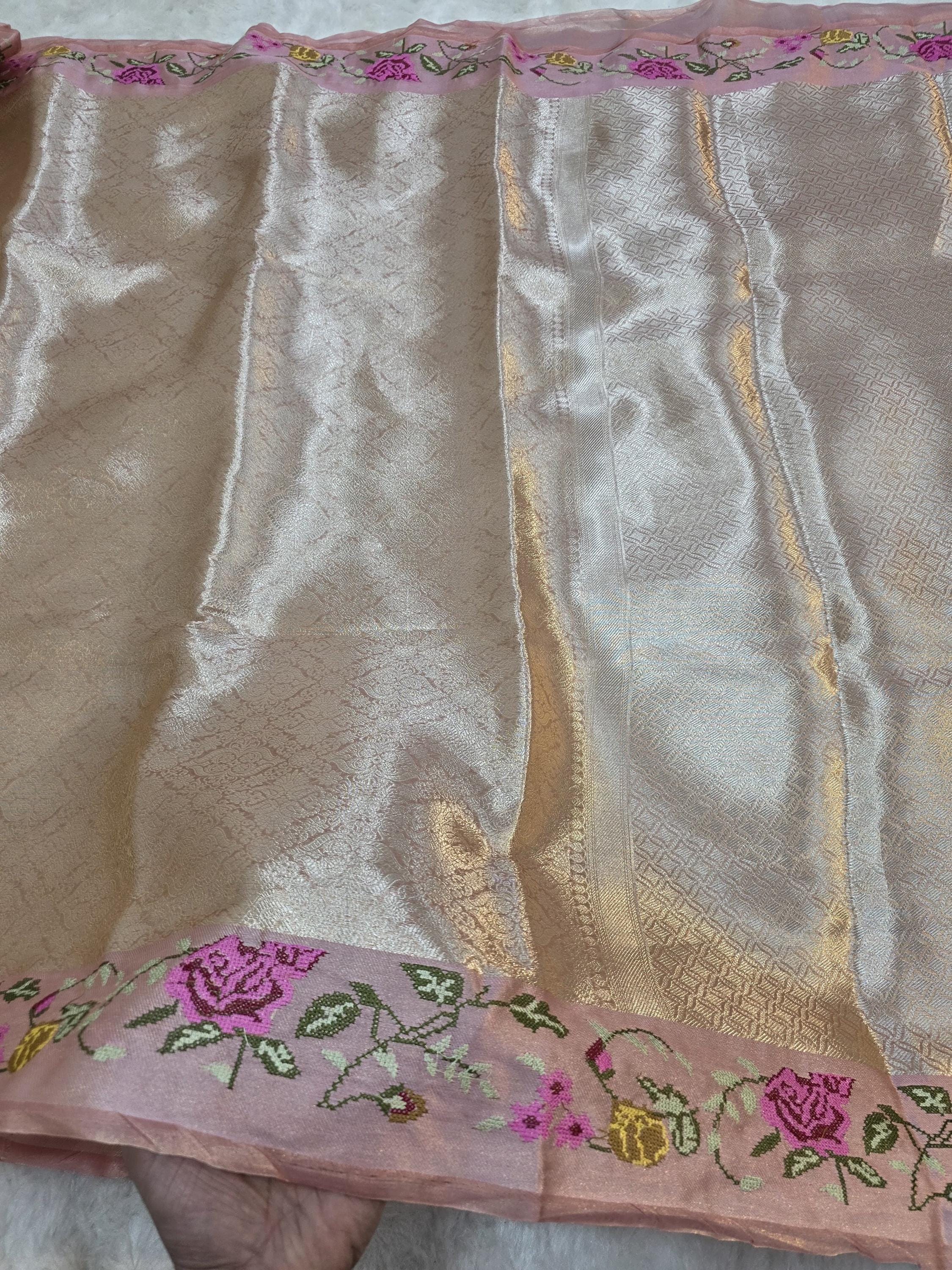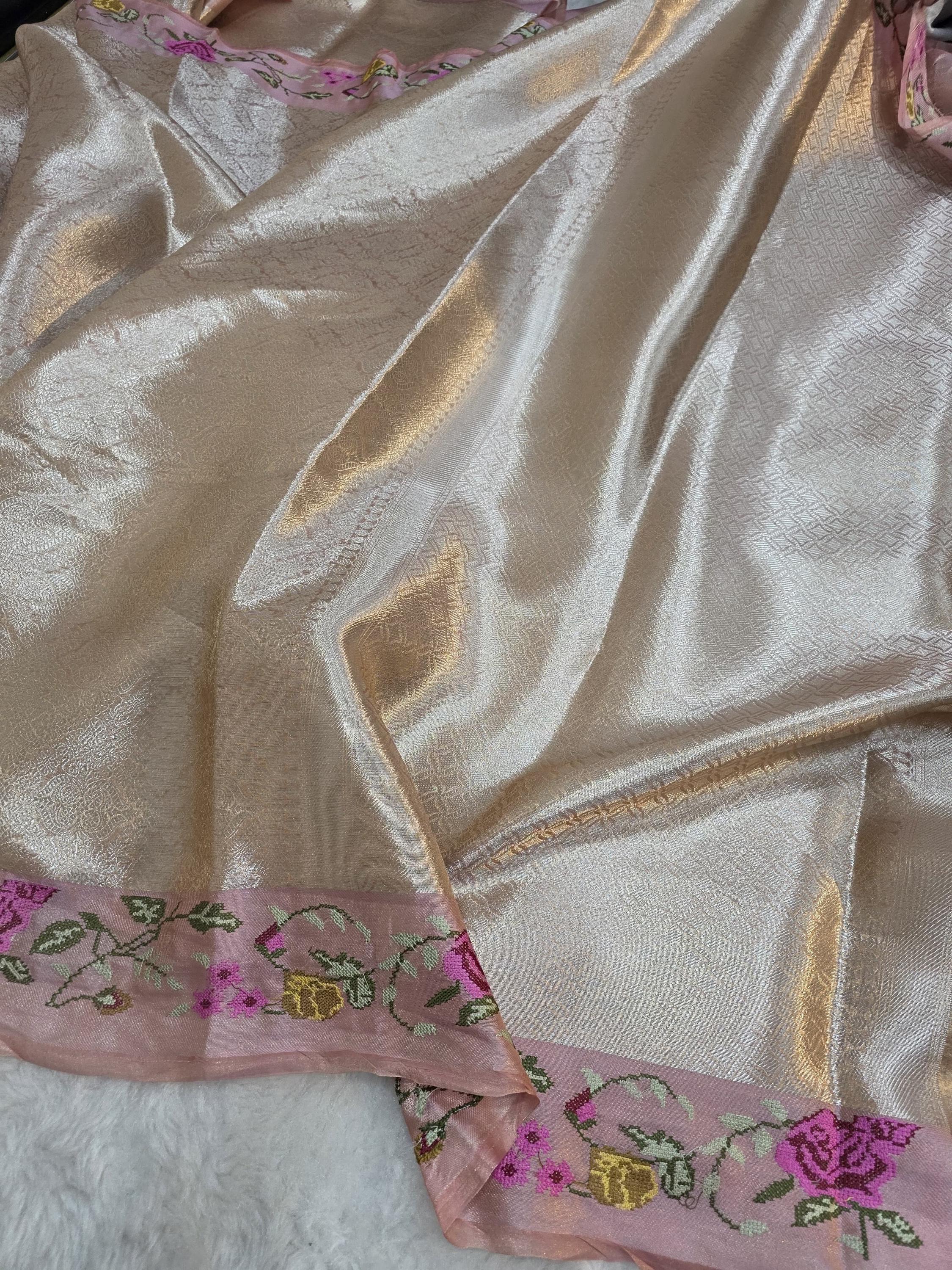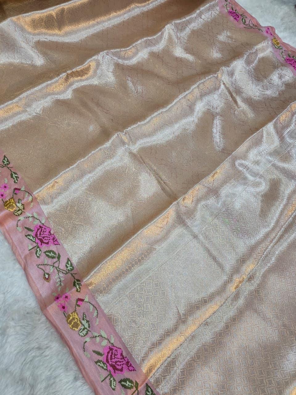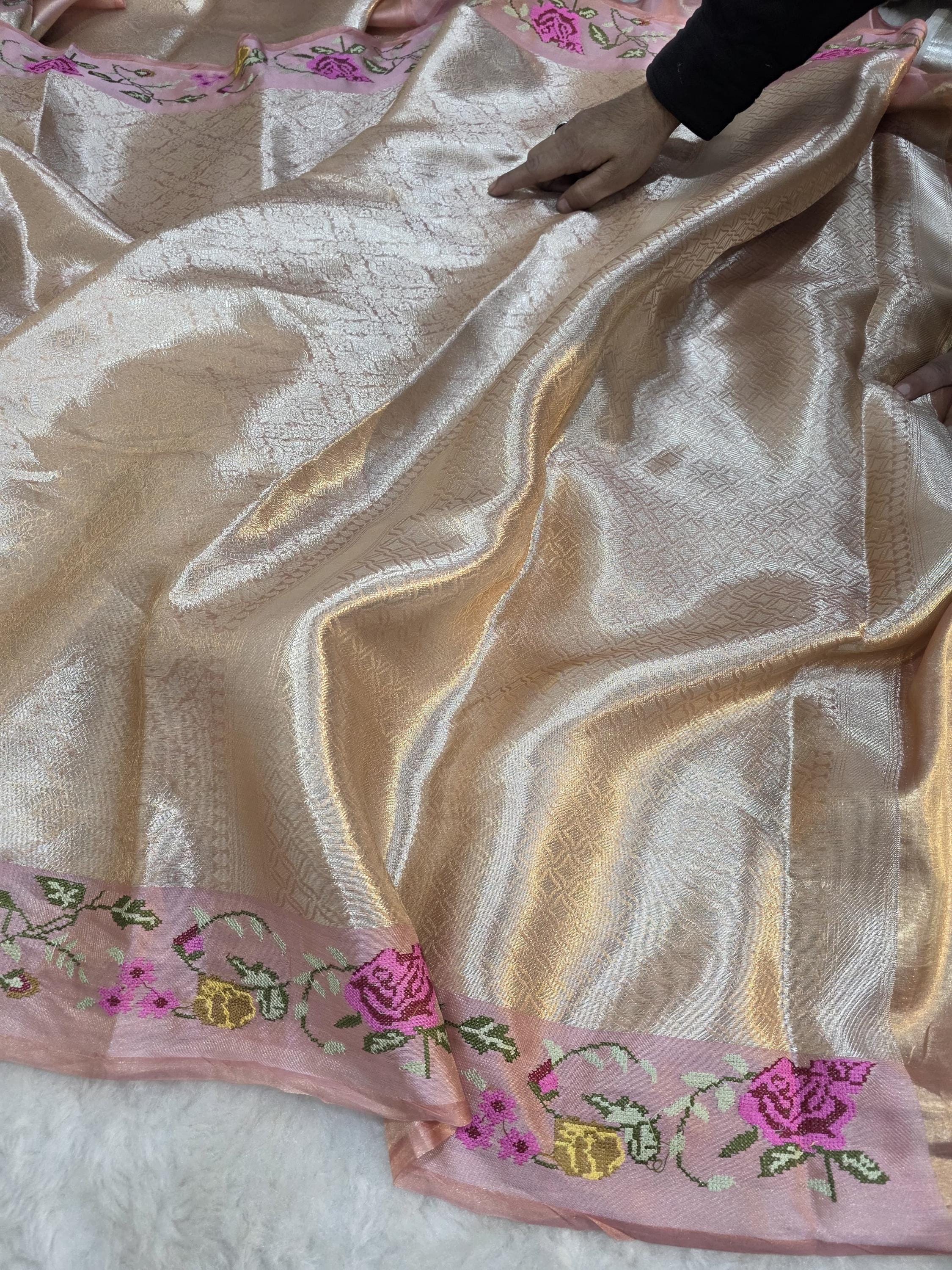 Experience the luxury of khaddi katan tissue Silk, adorned with exquisite handloom prints and a stunning organic banaras silk weave. This saree is a perfect fusion of heritage and contemporary elegance, making it ideal for weddings, festive occasions, and grand celebrations. A timeless masterpiece for your ethnic collection!