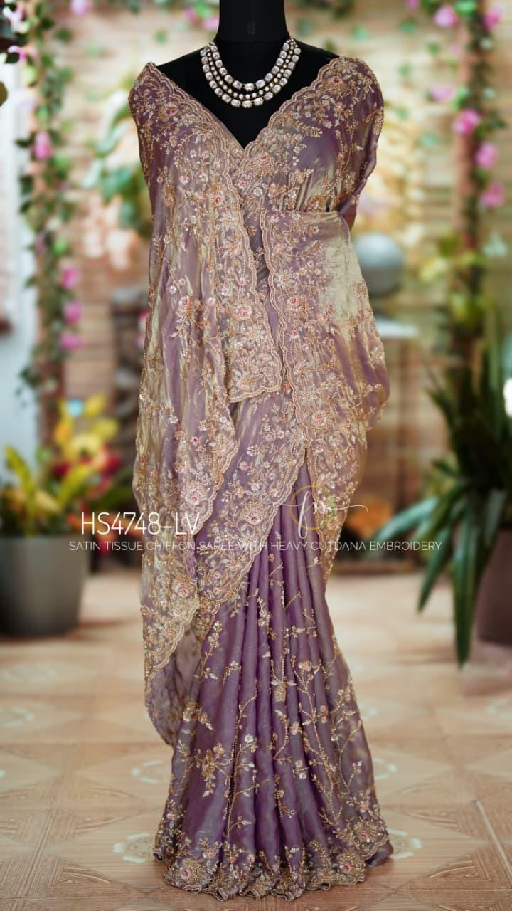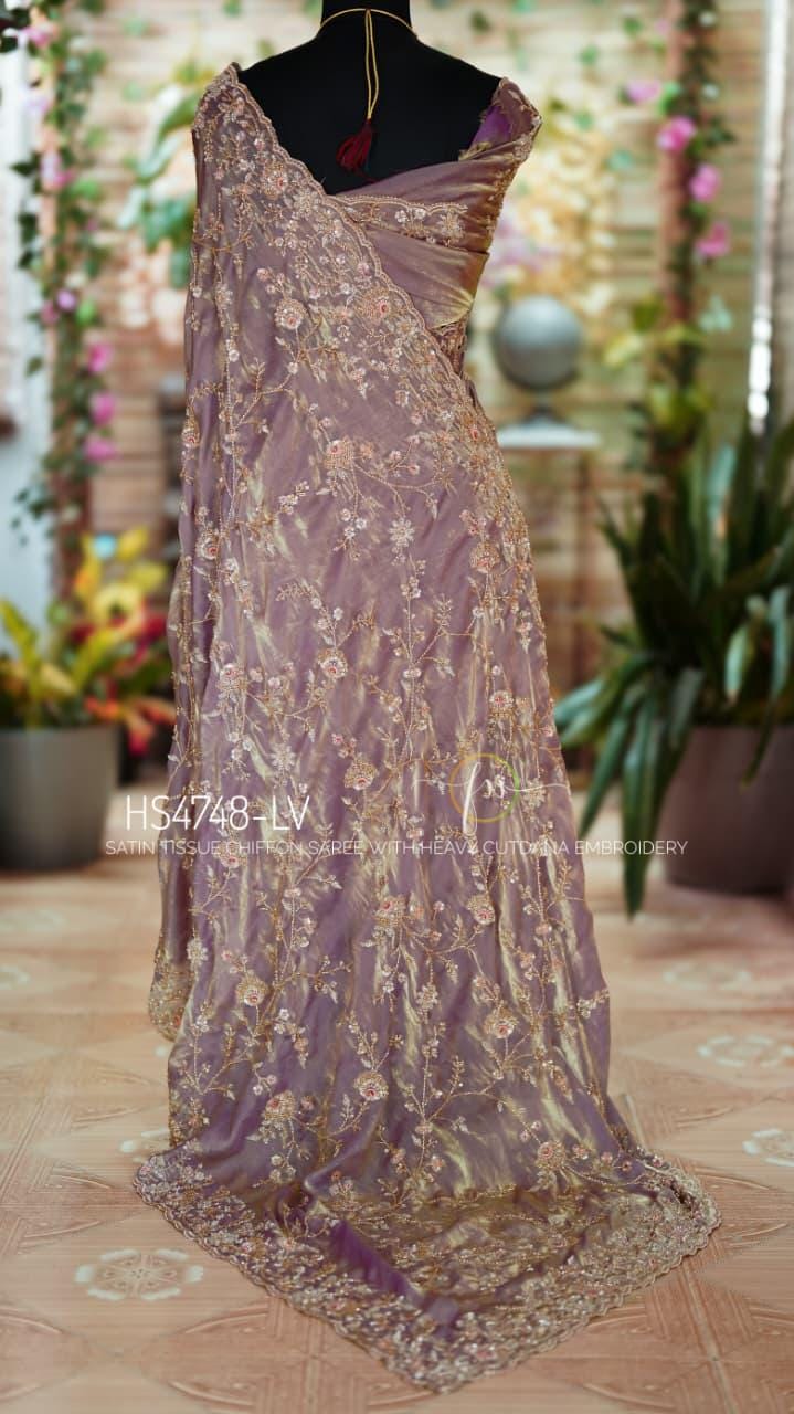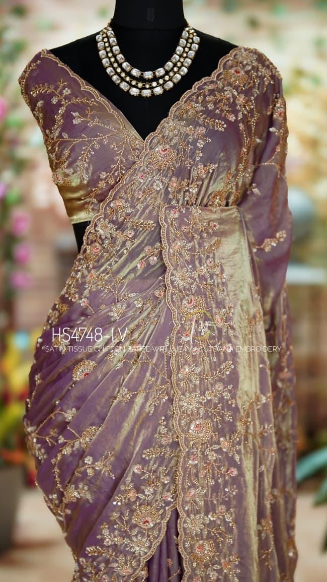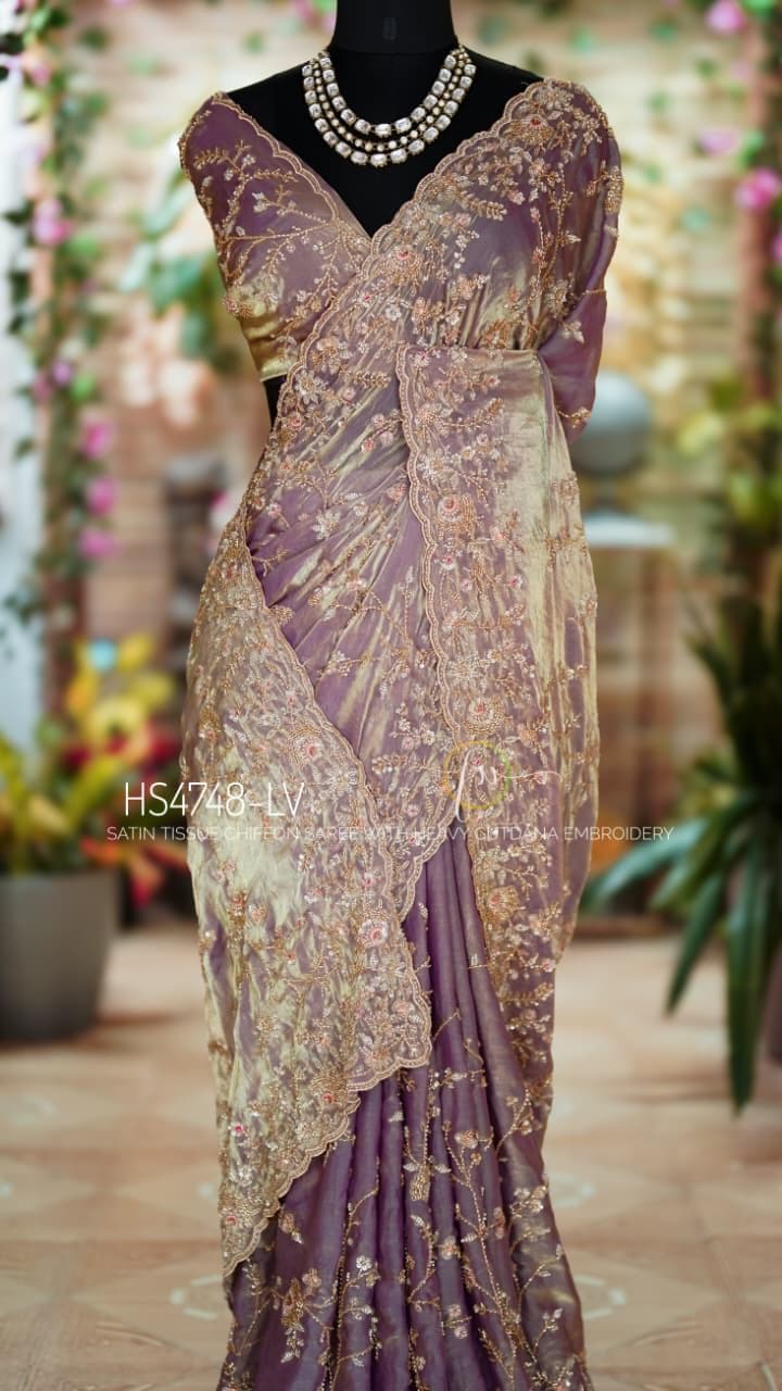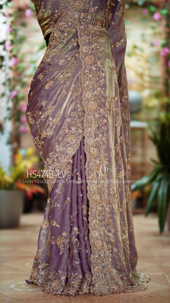 Experience the magic of the Luminara Veil, a masterpiece crafted in satin tissue chiffon that breathes with your movement. This saree features a rare dual-tone woven texture, allowing the surface to shift gracefully between a warm golden glow and a deep, contrasting undertone for a truly luminous effect.