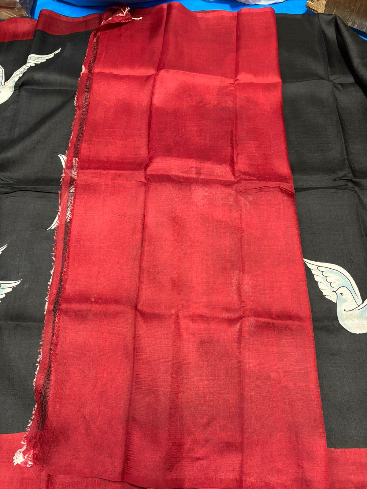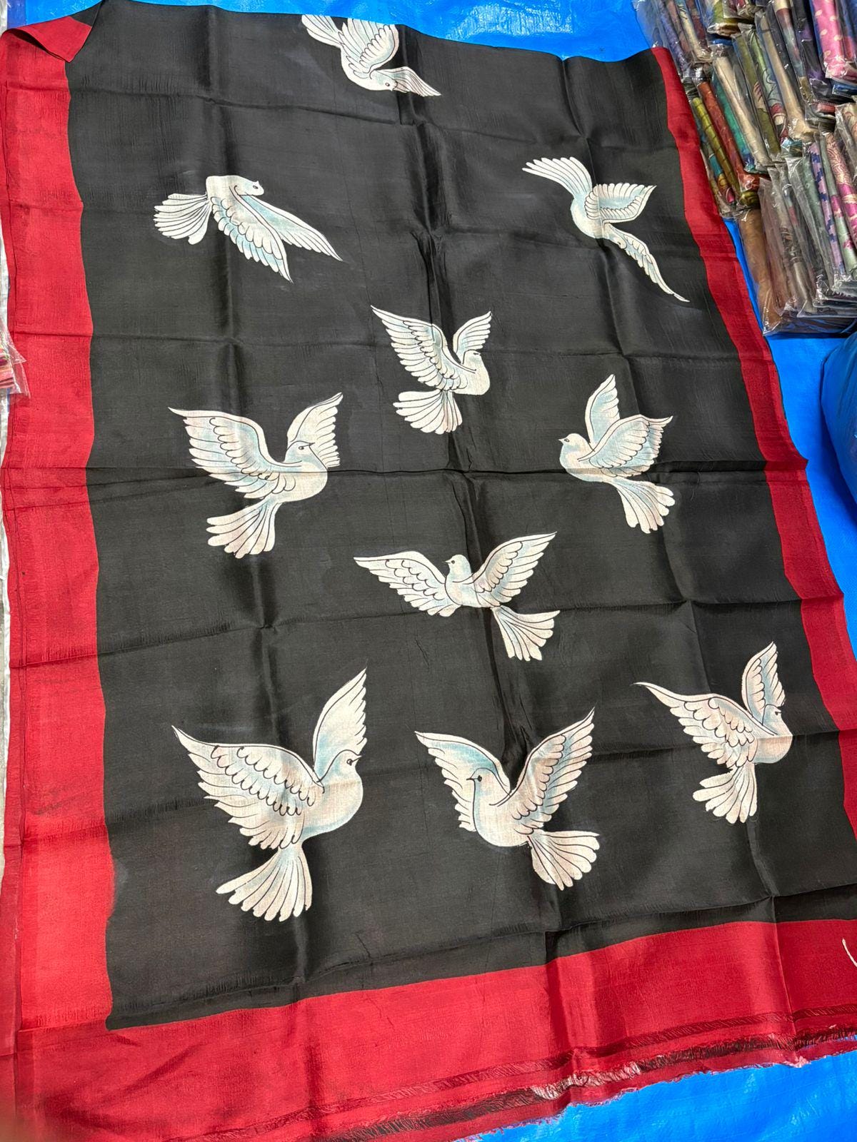 Handloom Tussar Silk Saree, Zari Border, Hand-Painted Floral Design