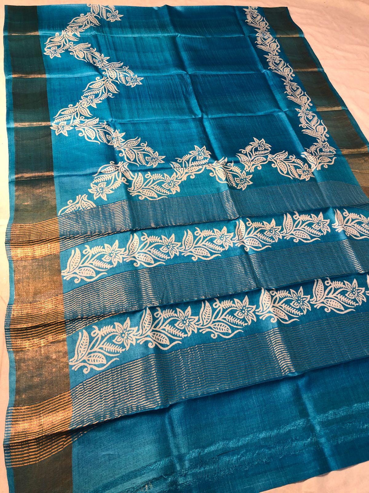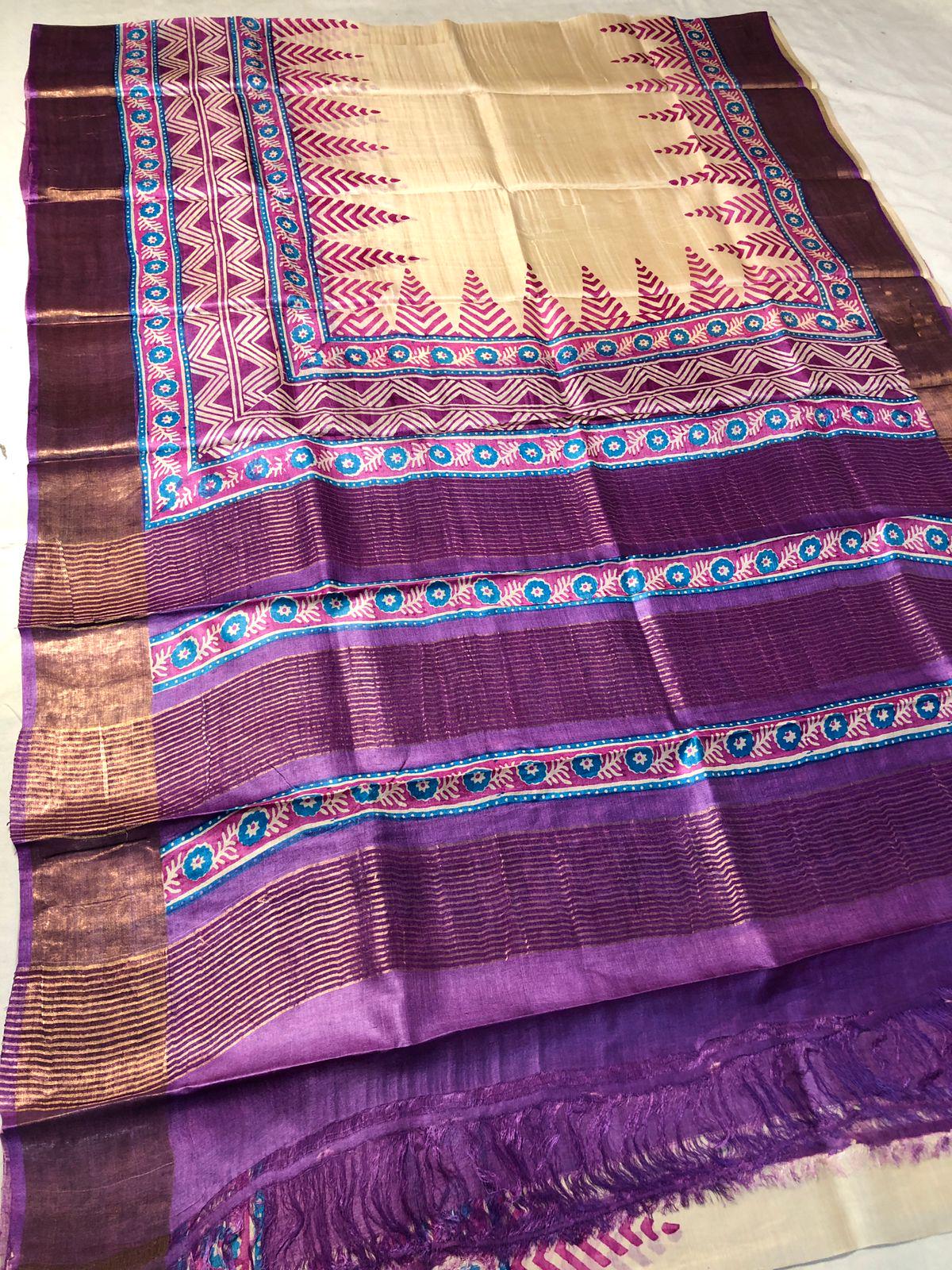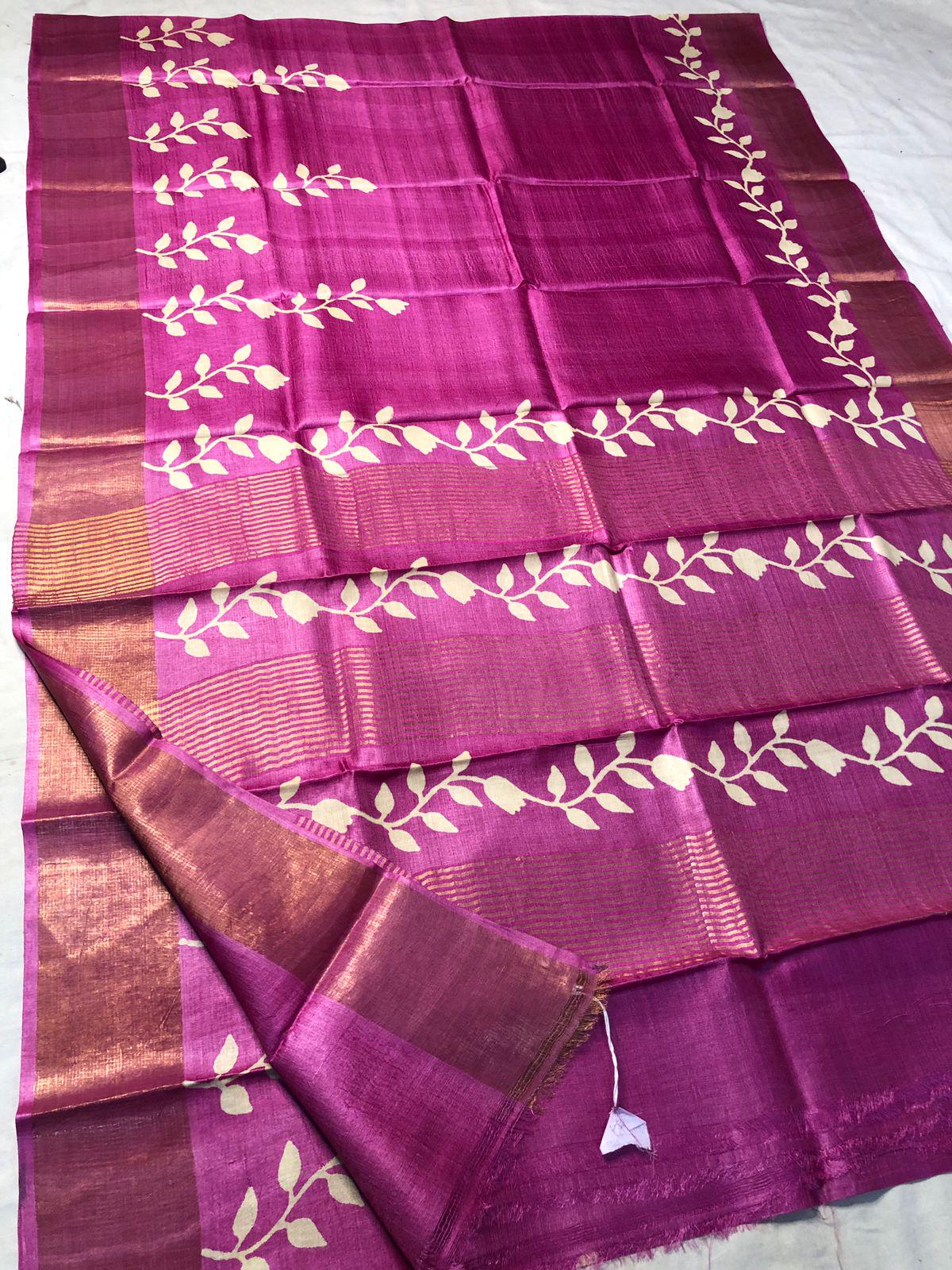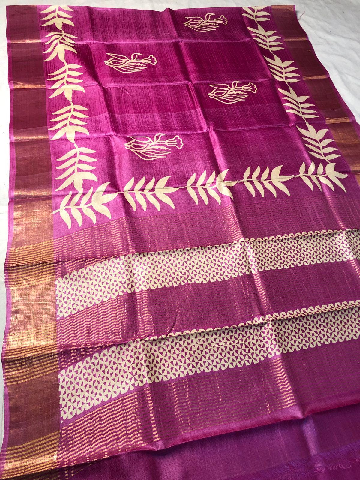 Handloom Tussar Silk Saree, Zari Border, Hand-Painted Floral Design
