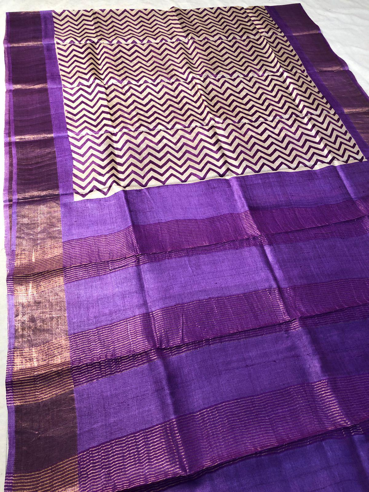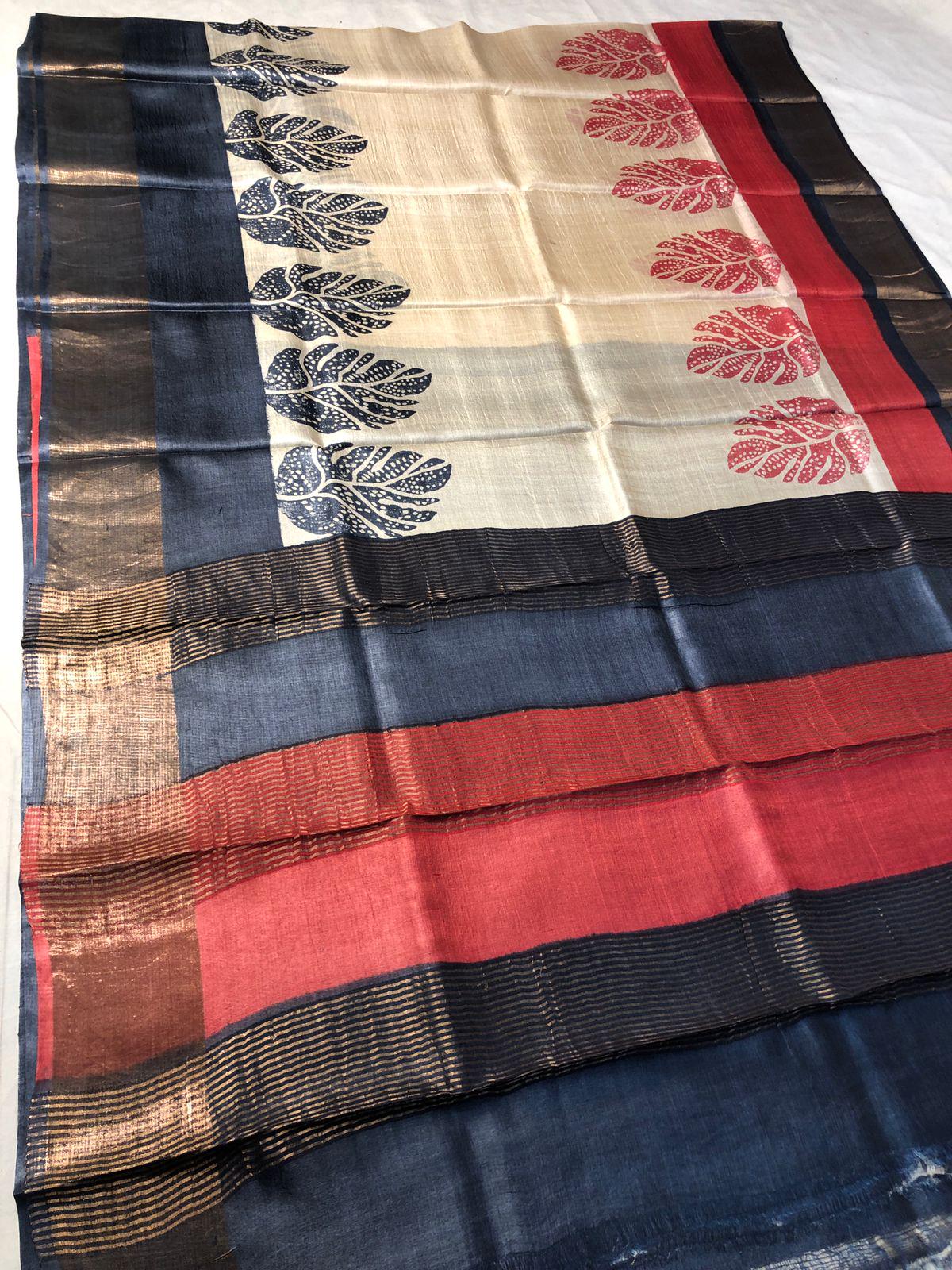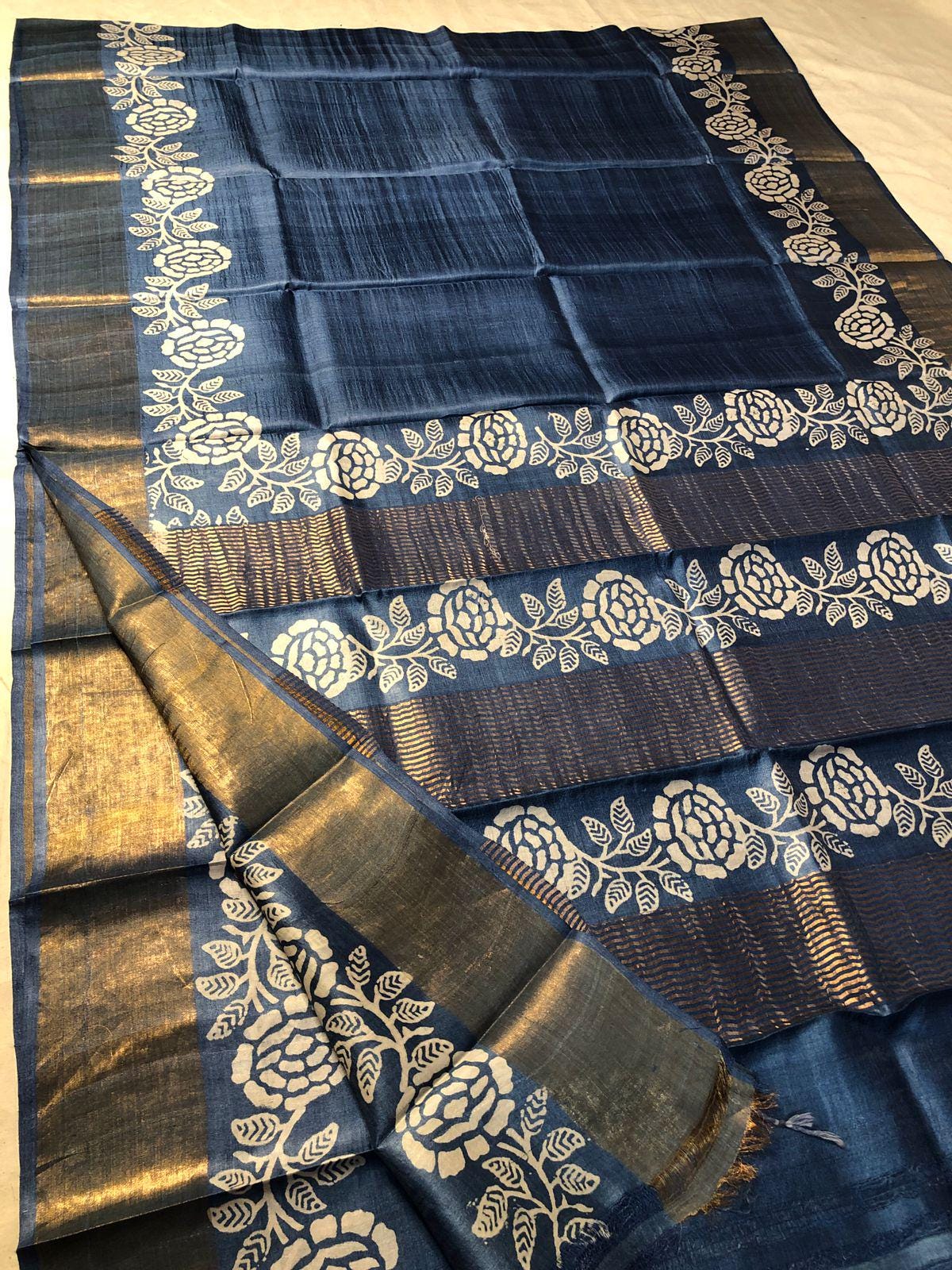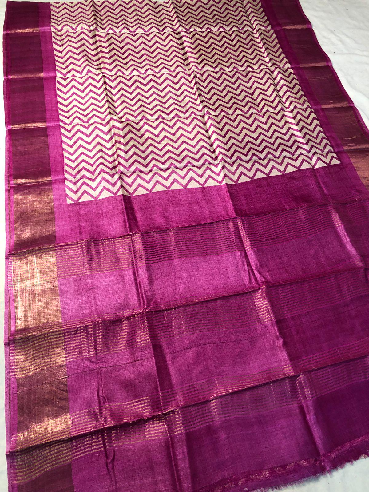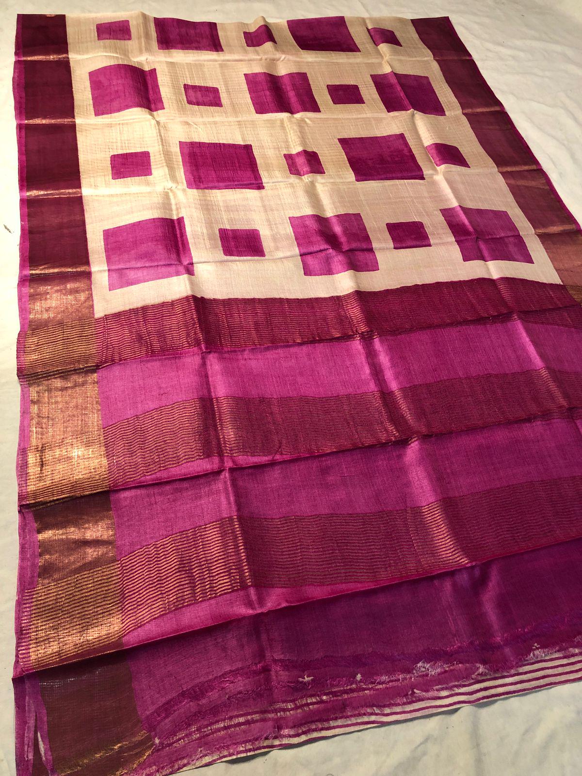 Handloom Tussar Silk Saree, Zari Border, Hand-Painted Floral Design