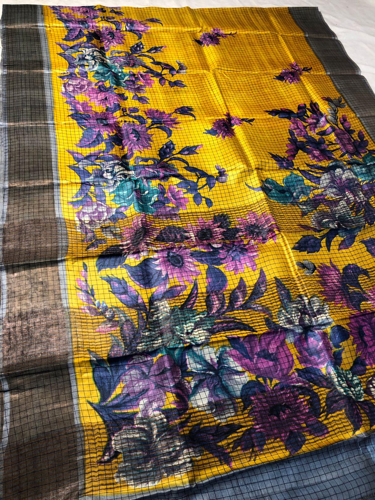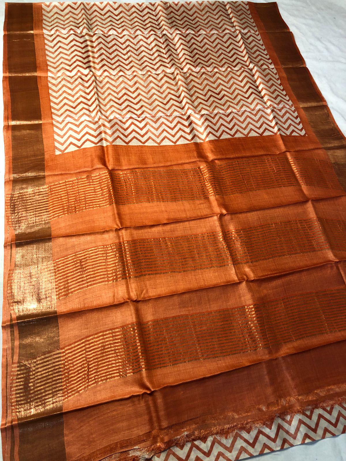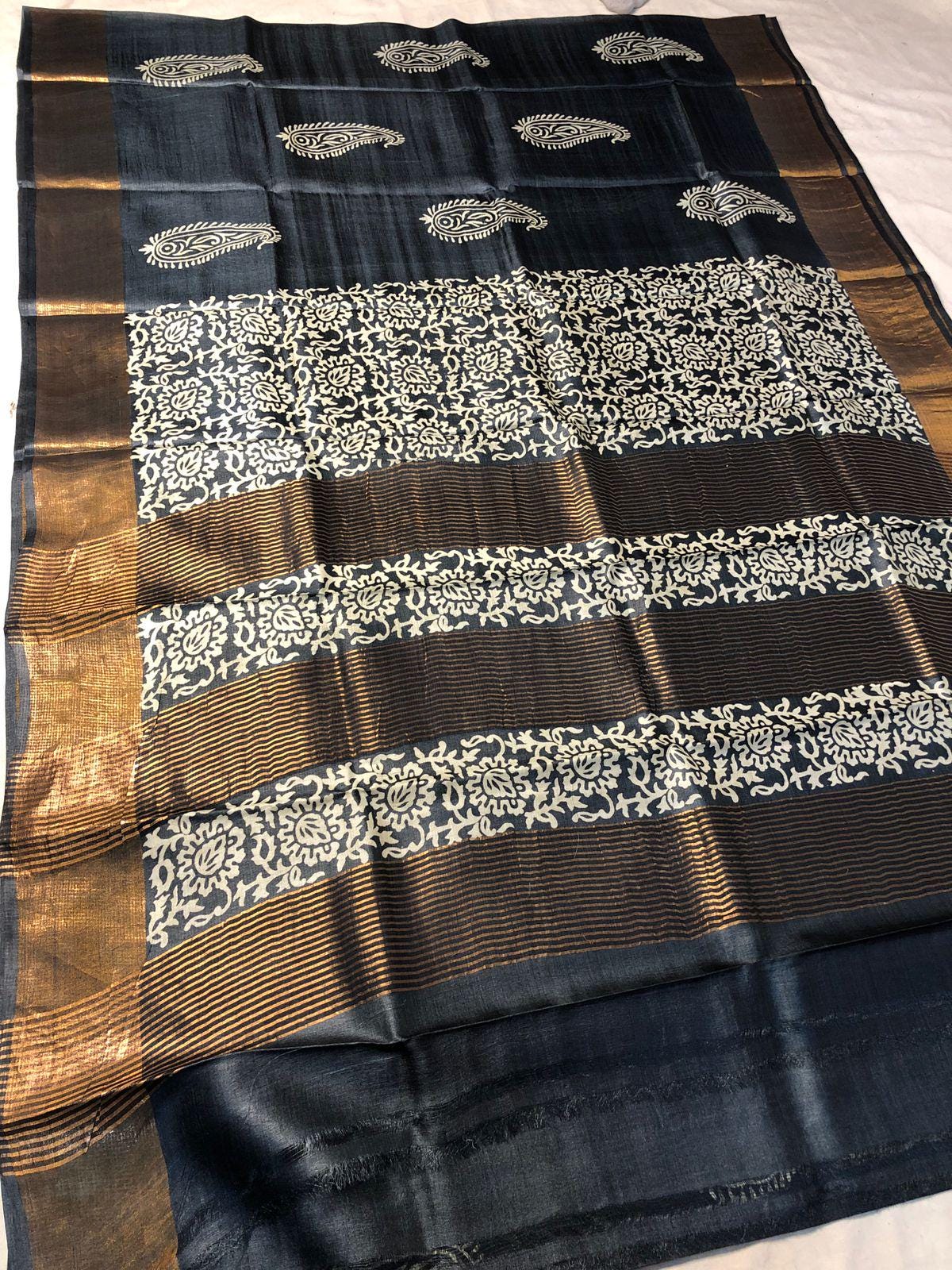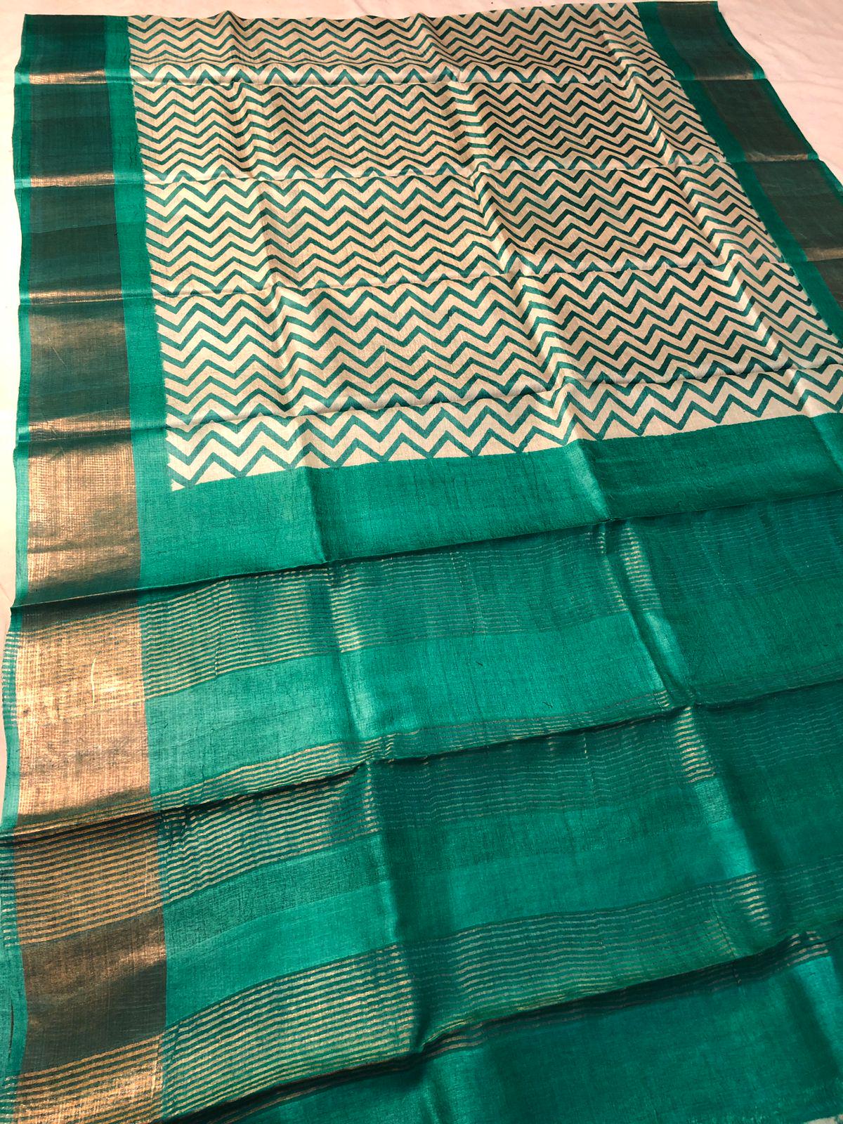 Handloom Tussar Silk Saree, Zari Border, Hand-Painted Floral Design