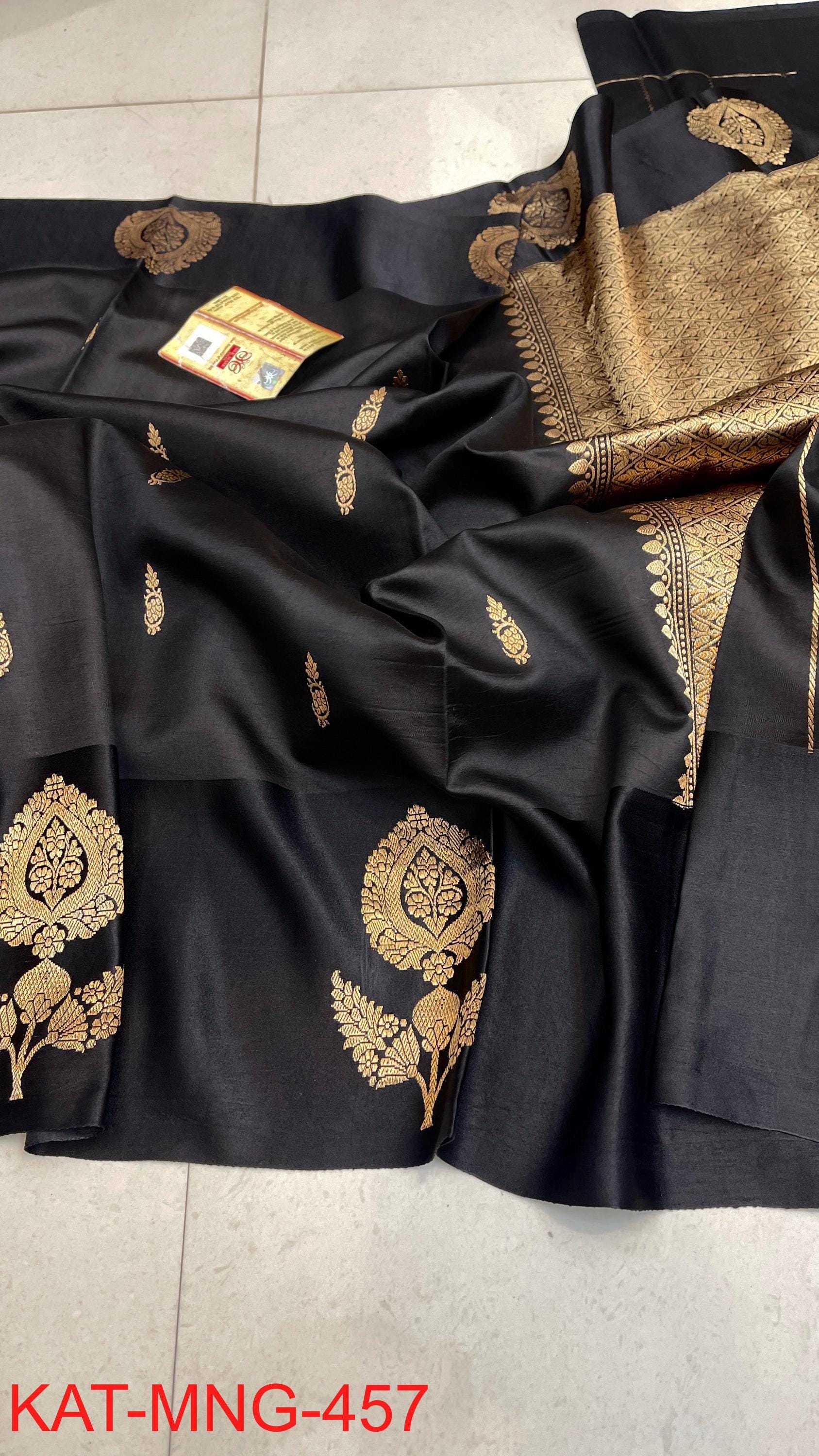 Handloom black Katan Silk Banarasi Saree: Raw Mango, Silk Mark Certified