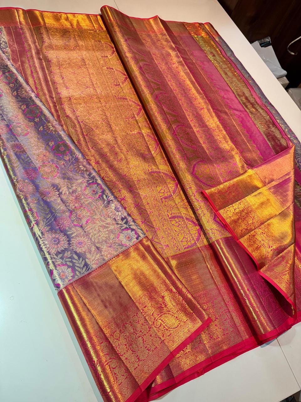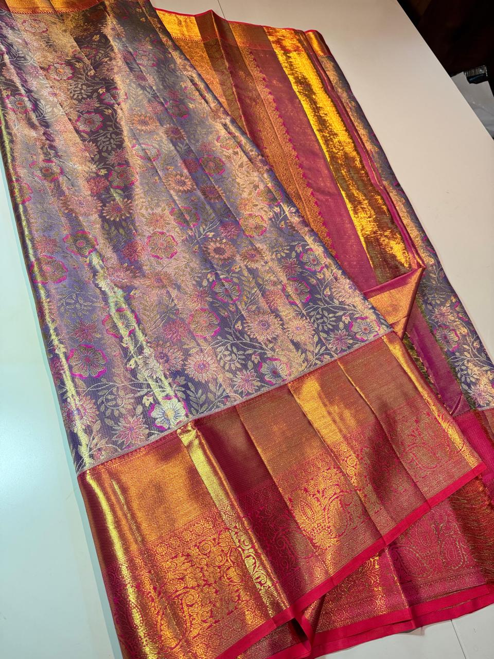 Drape yourself in timeless elegance with this 2 Gram Gold Kancheepuram Handloom Silk Saree, a masterpiece woven by skilled artisans of South India. Crafted from rich silk and adorned with pure zari work, this saree radiates regal charm in its vibrant magenta and golden weave. The intricate motifs and traditional border make it a perfect choice for weddings, bridal wear, temple occasions, and festive celebrations.
