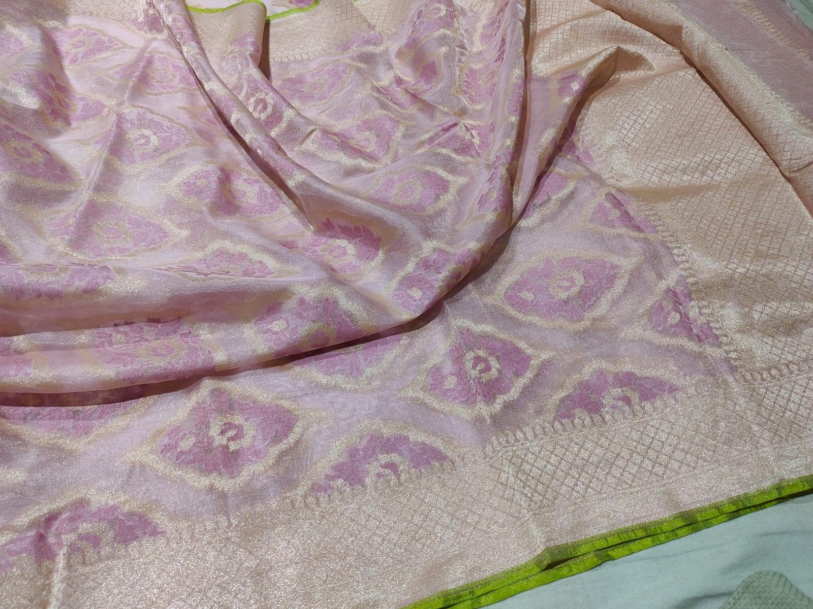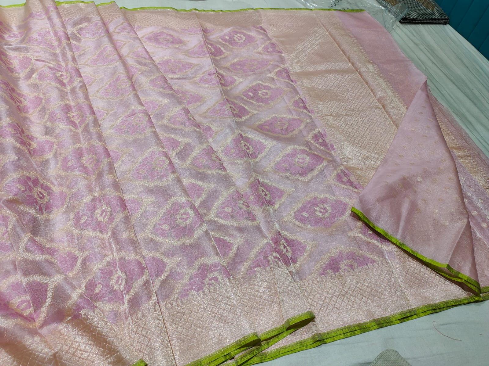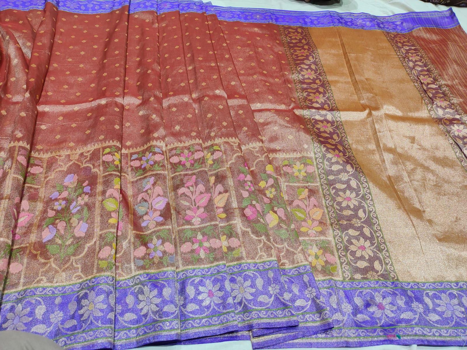 Experience the luxury of khaddi katan tissue Silk, adorned with exquisite handloom prints and a stunning organic banaras silk weave. This saree is a perfect fusion of heritage and contemporary elegance, making it ideal for weddings, festive occasions, and grand celebrations. A timeless masterpiece for your ethnic collection!